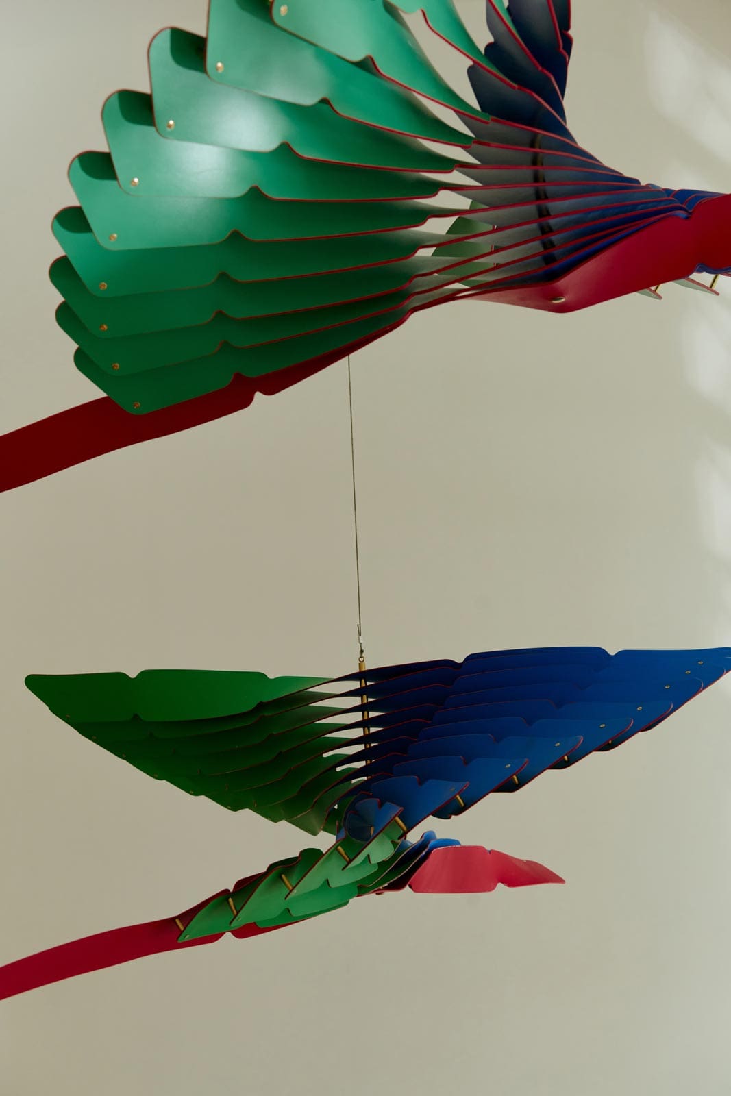 Symbolizing the god of air in pre-Columbian Mexico, atelier öi’s interpretation of the “Quetzal”  into a hanging mobile with thirteen twisting leather “feathers” in blue and green, with striking red edges. A central red feather balances the piece, creating a dynamic, color-shifting vision that gracefully mimics the sacred bird in mid-flight.