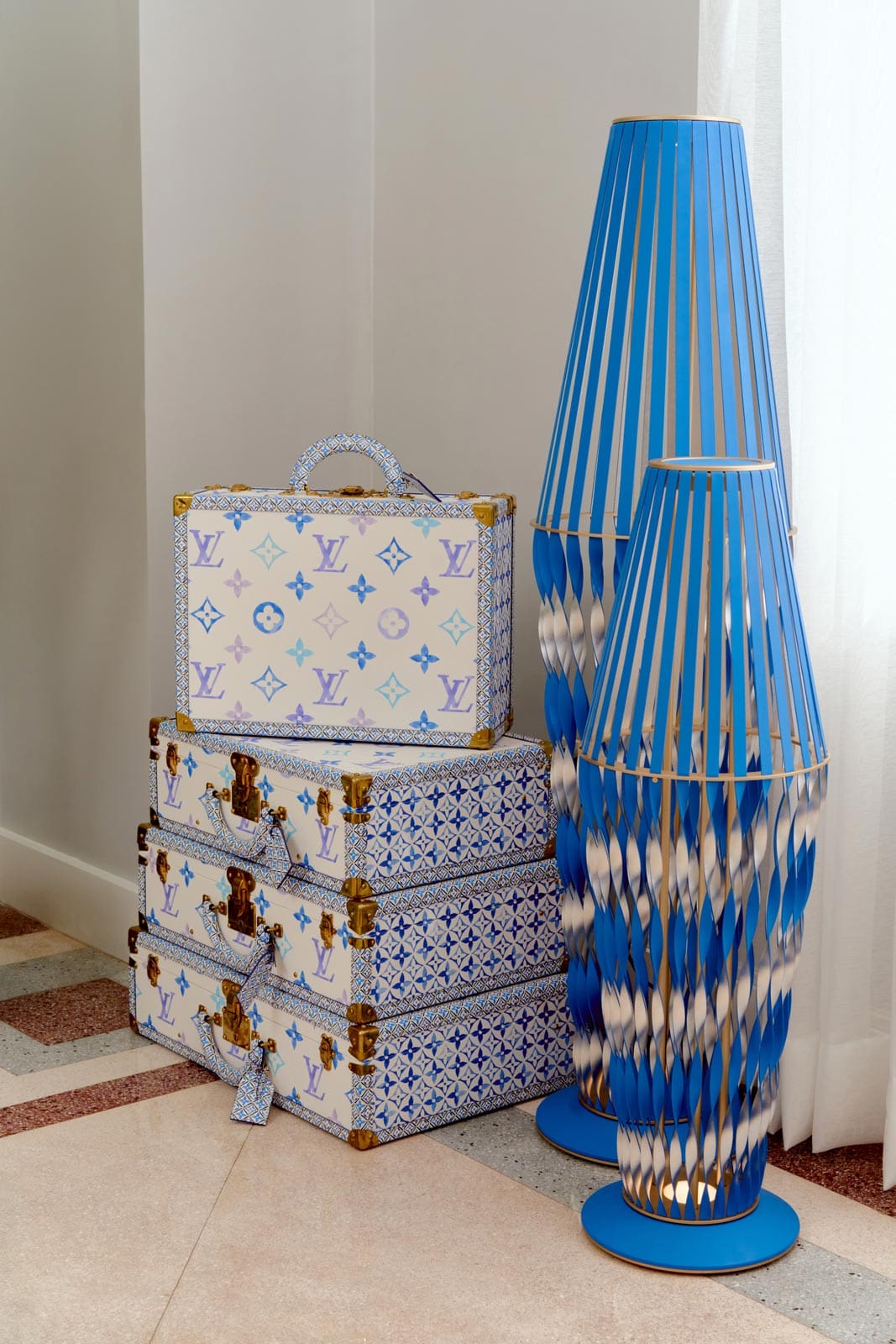 Louis Vuitton Pyramide Bisten Trunks and Spiral Lamp by atelier öi. Photographed by Artu Nepomuceno