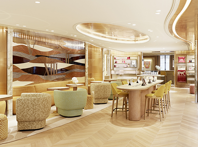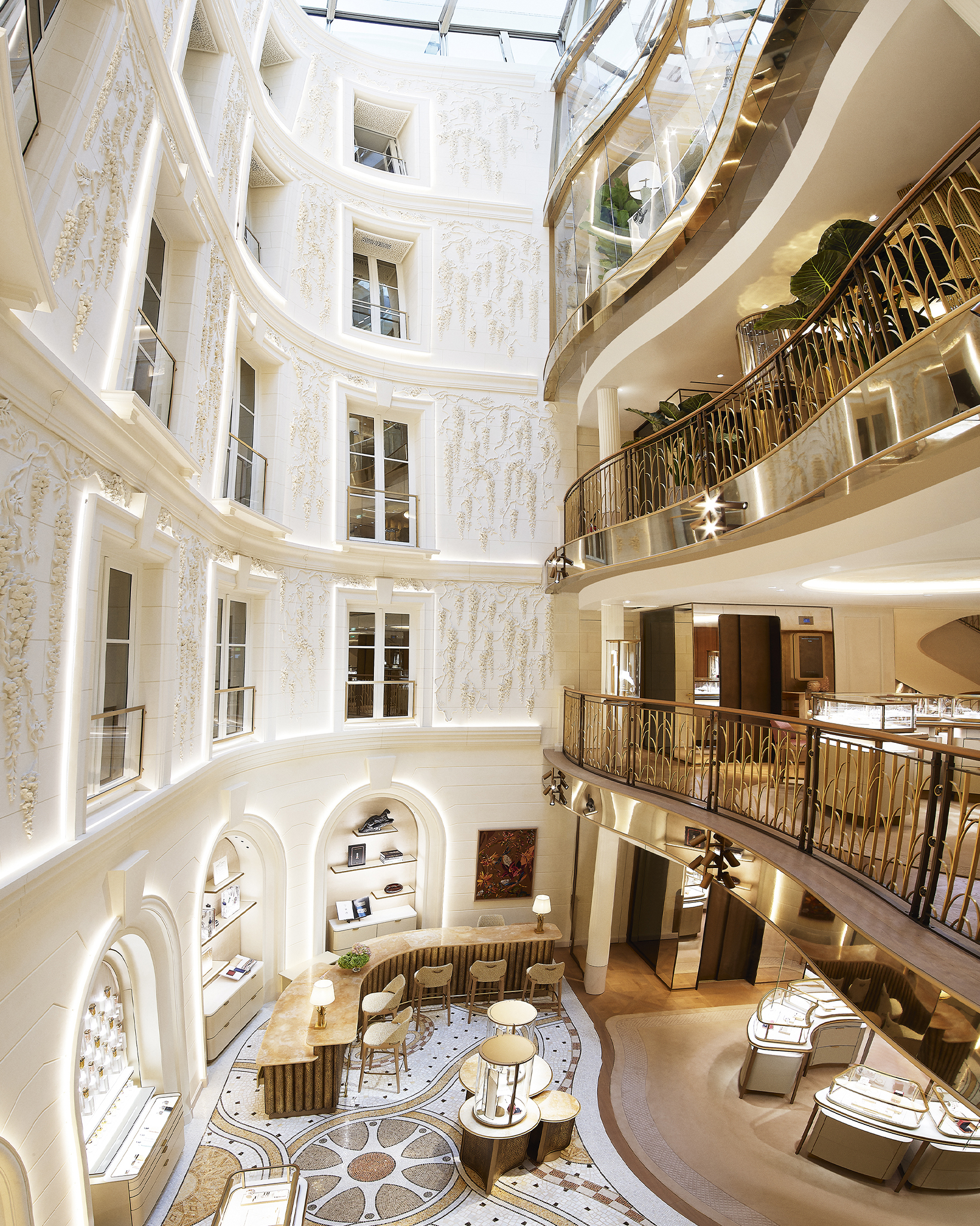 The boutique occupies the ground and the first two floors of the building, while the third floor is dedicated to the French jewelers’ wide range of services available to their clients. Its fourth floor caters to High Jewelry workshops, and the fifth and top floors are dedicated to the Maison’s archives, a winter garden, and the Residence, an exclusive space for living, entertaining, and hosting cultural events.