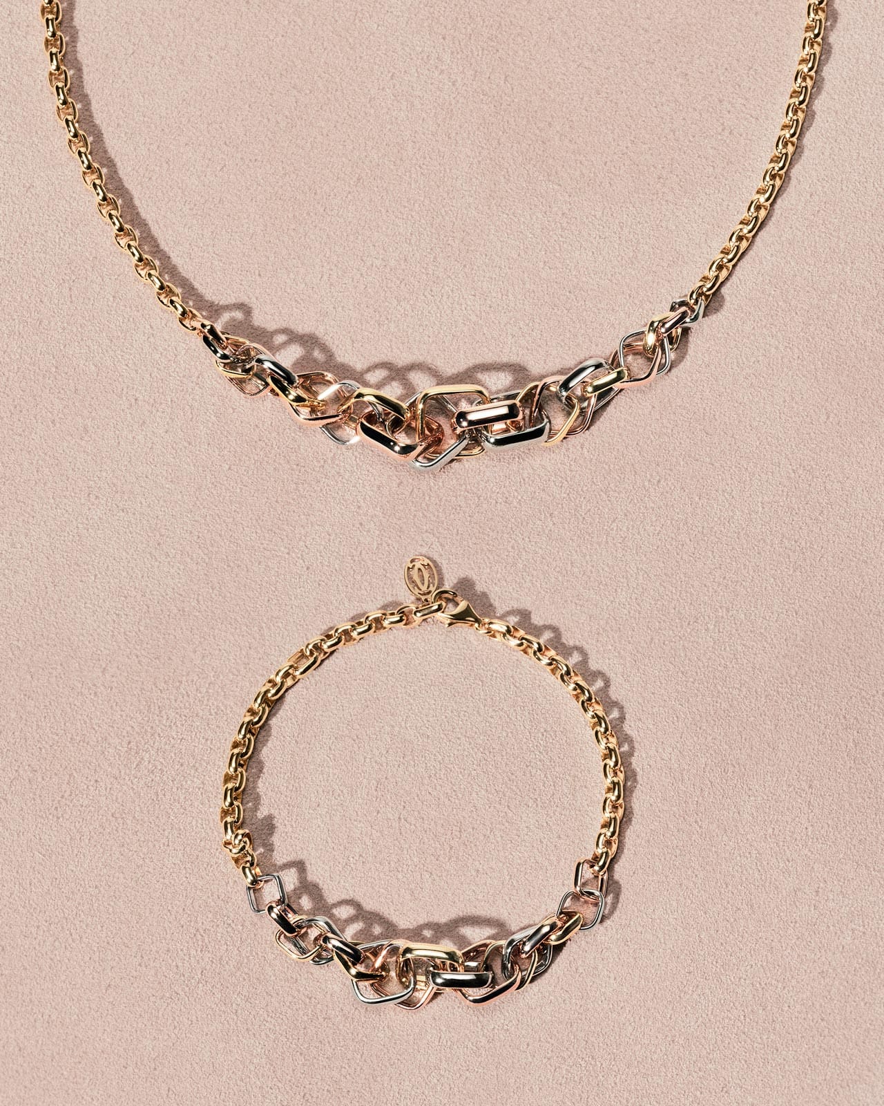 From rings, the new geometric approach extends to the cushion-shaped Trinity necklace featuring interlinked rings in a continuous, luminous structure, while its XL counterpart is entirely handcrafted made to be a statement piece that wraps around the neck. Completing the collection, the cushion-shaped Trinity bracelet mirrors this modular structure to the wrist, seamlessly linking the cushion-shaped rings for a distinct look.