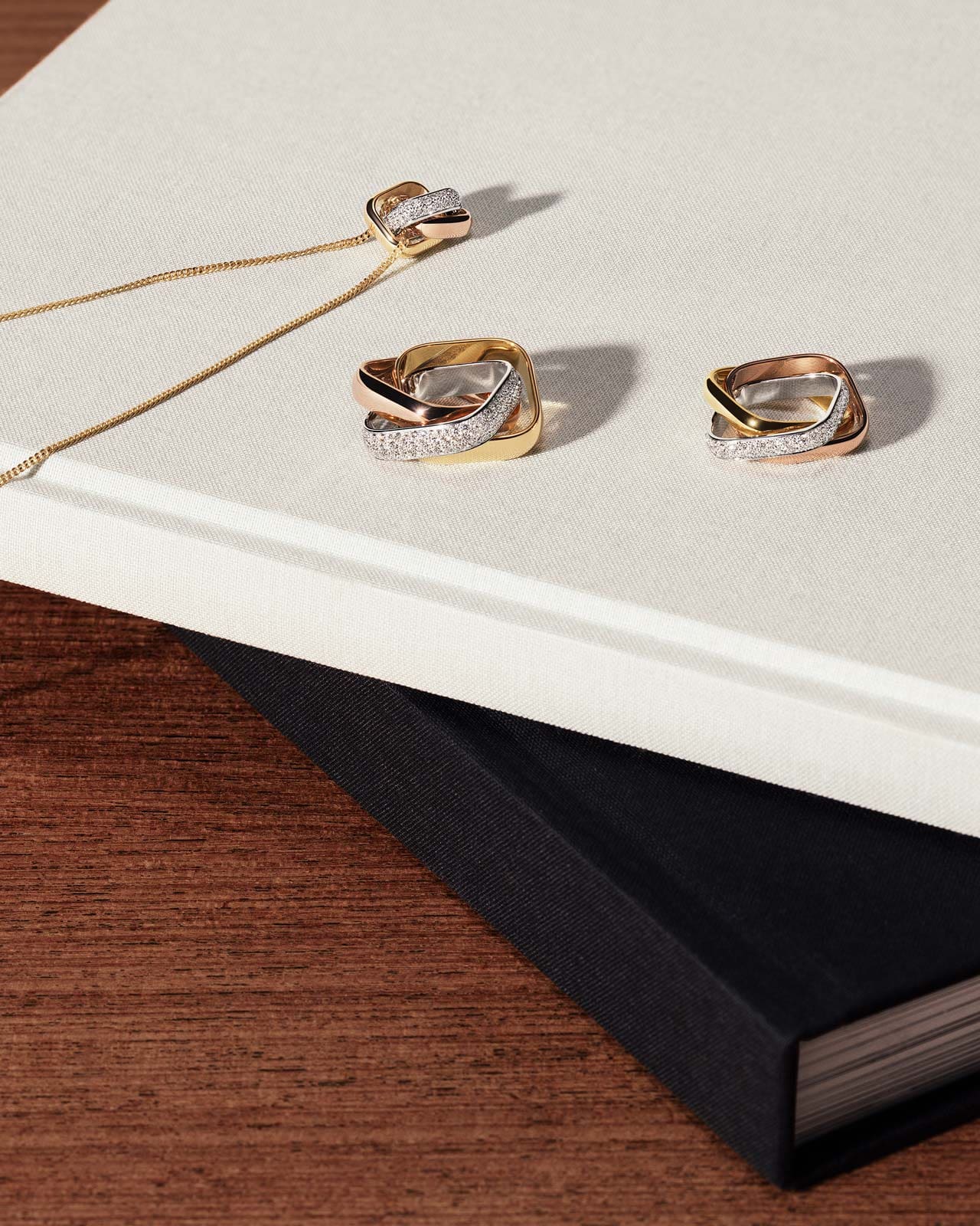 The collection also introduces a geometric evolution with cushion-shaped designs that bring a structured yet fluid dimension to the interlocking rings with the cushion-shaped Trinity ring and the semi-pavéd cushion Trinity ring, where diamonds enhance the interplay of light and shadow.