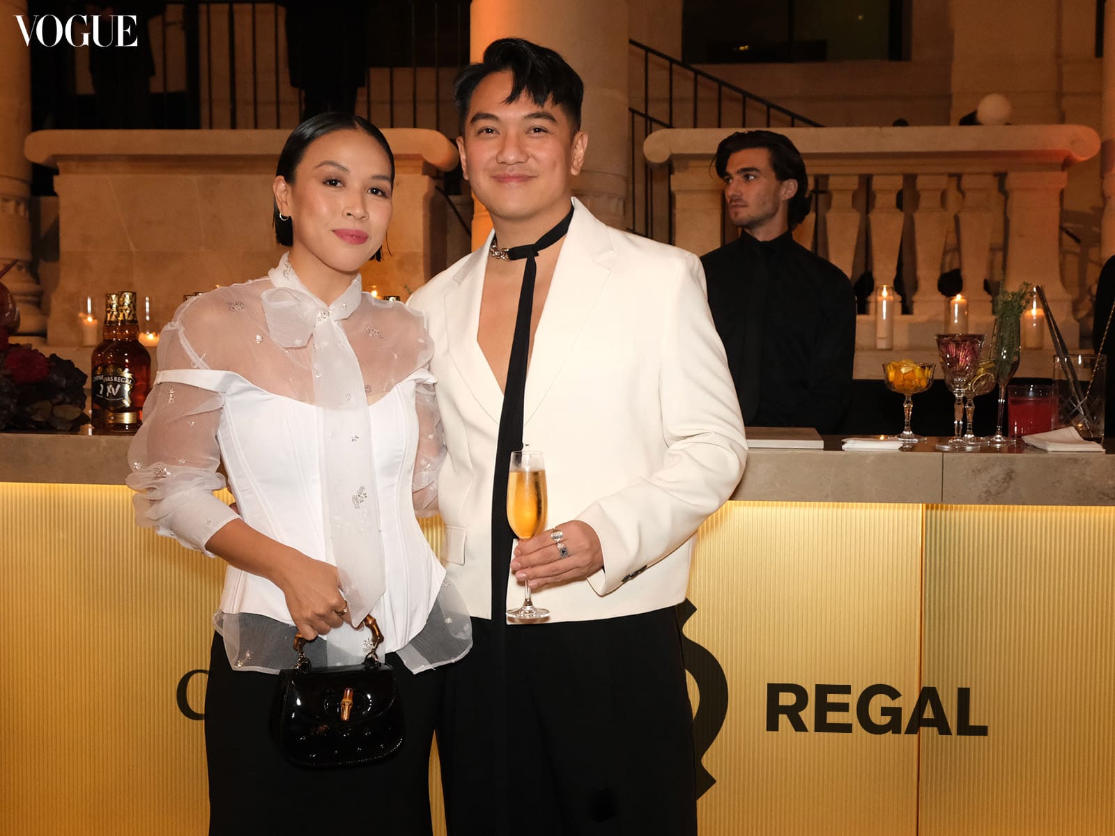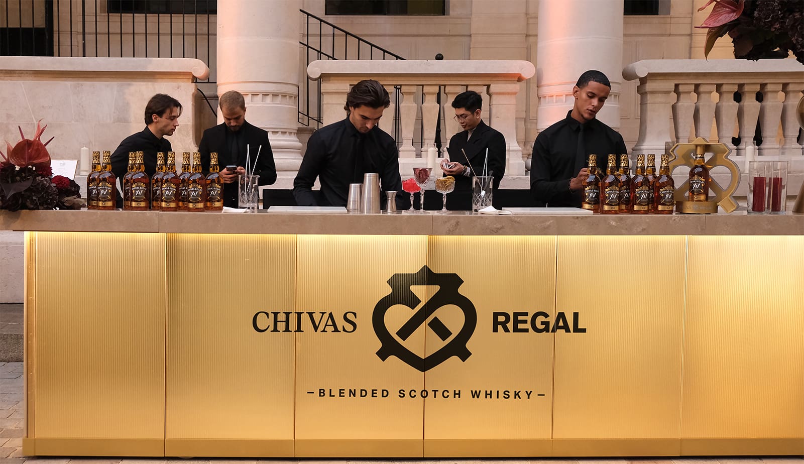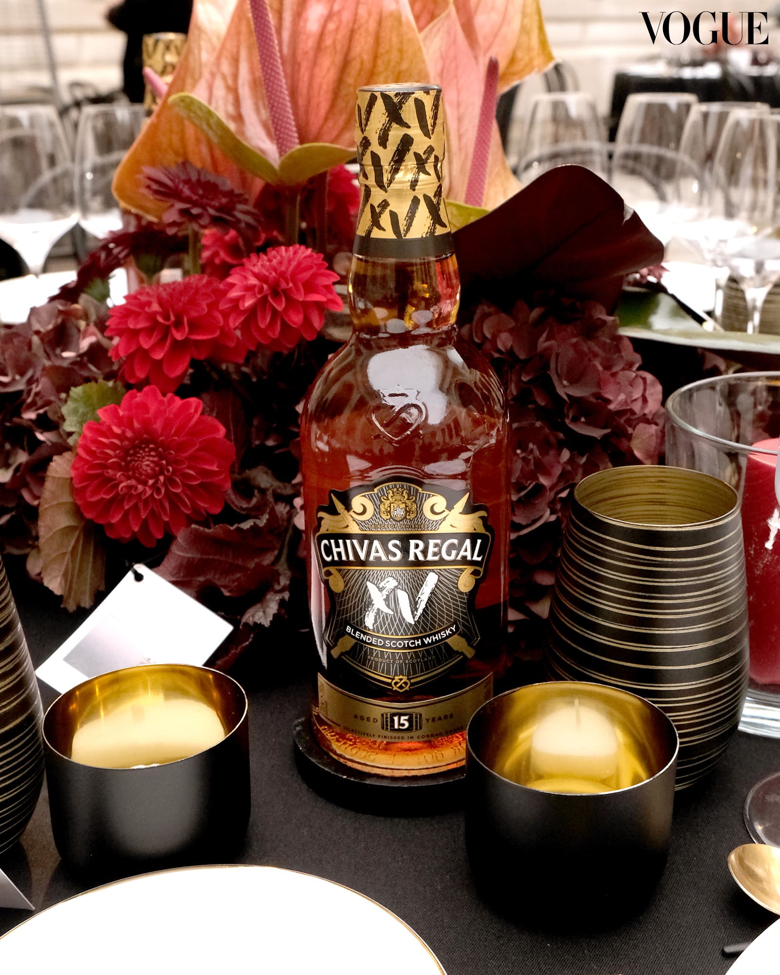 Just past the photocall, attendees are then welcomed by garçons offering a selection of drinks tailored for the evening’s festivities. Flacons of Chivas XV are also seen decorating the dining hall both along the tablescapes as well as the golden mobile bar.