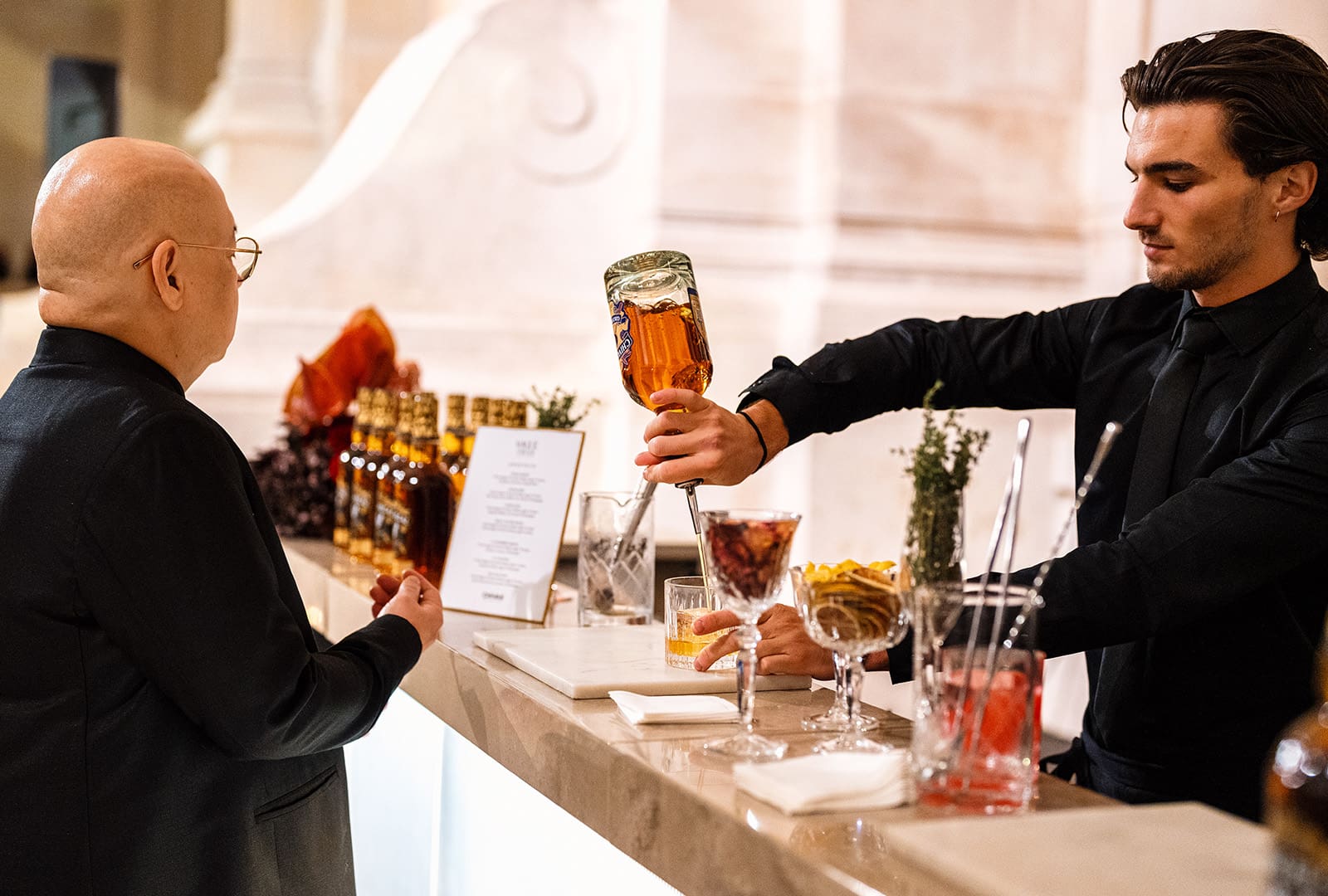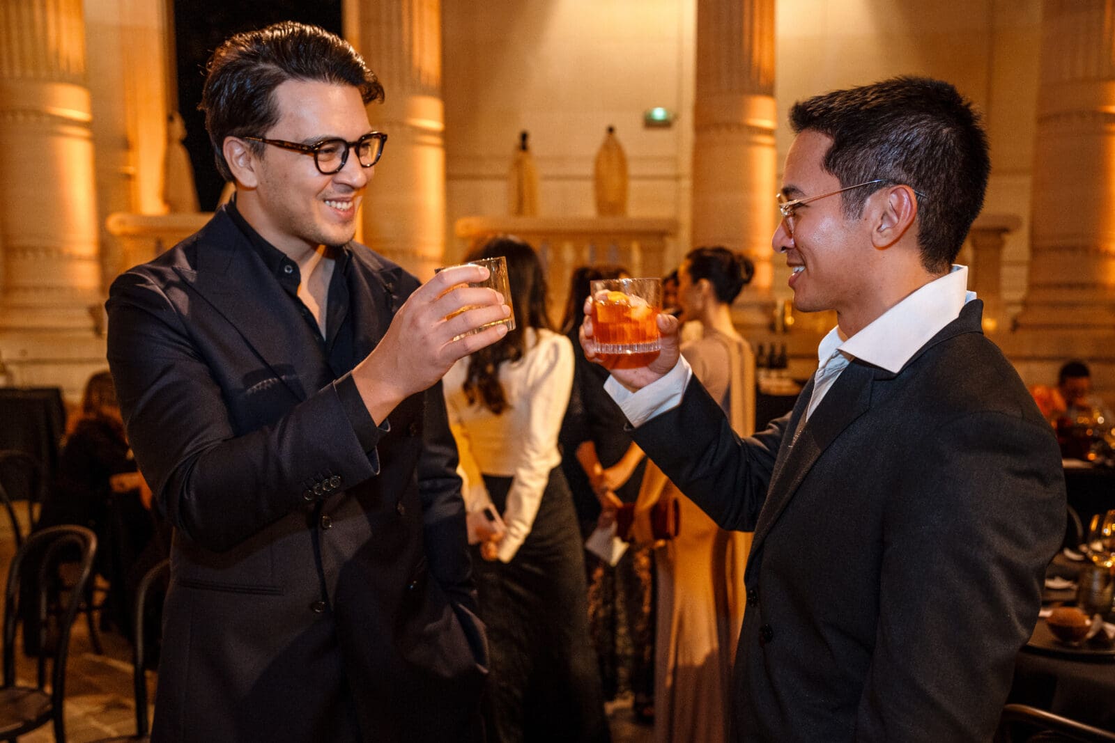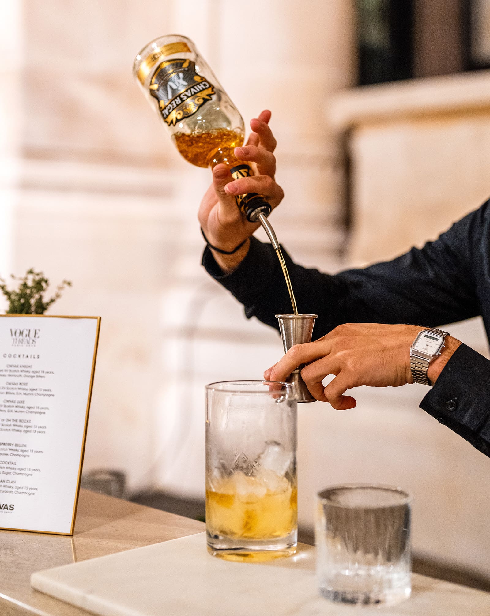Just past the photocall, attendees are then welcomed by garçons offering a selection of drinks tailored for the evening’s festivities. Flacons of Chivas XV are also seen decorating the dining hall both along the tablescapes as well as the golden mobile bar.