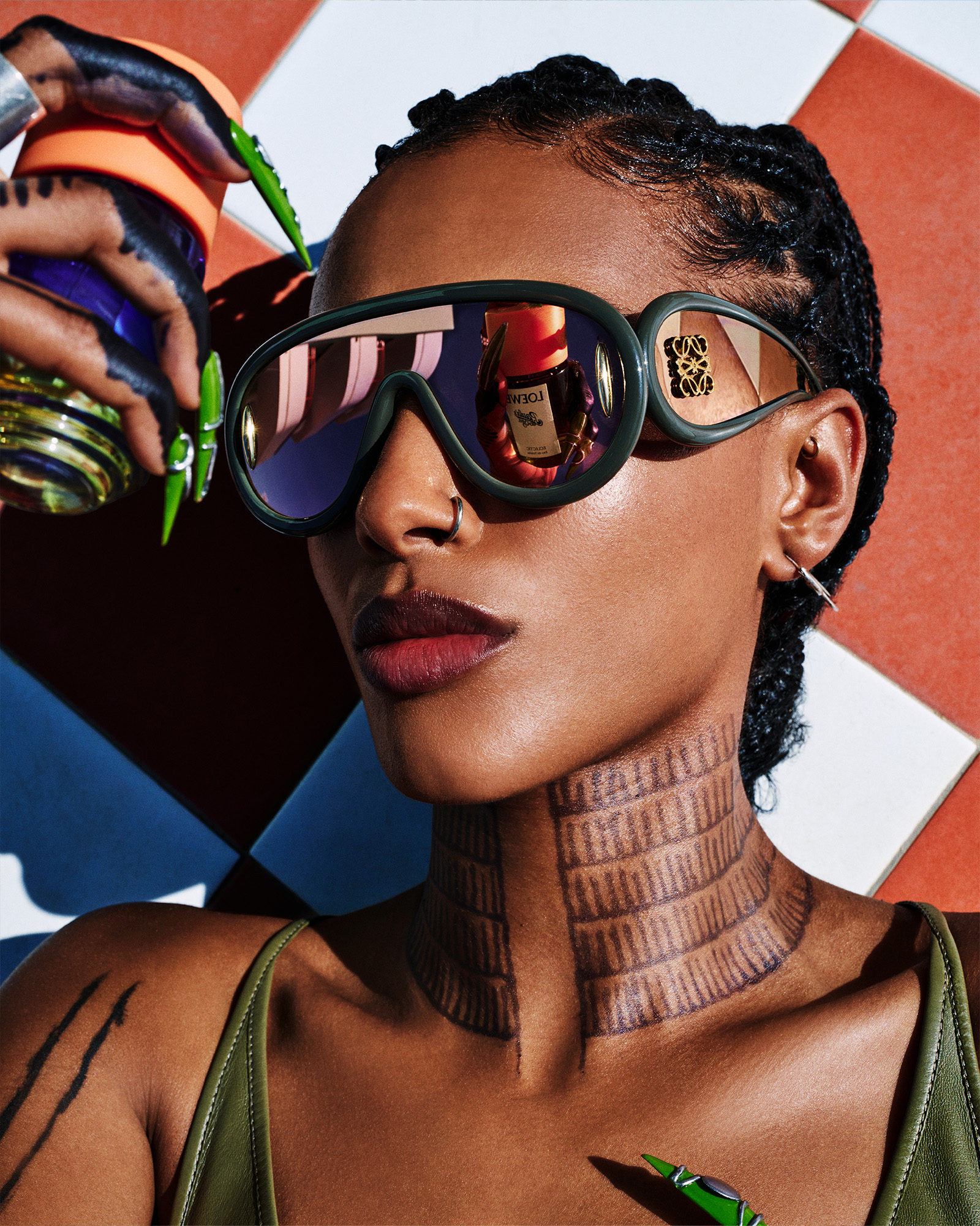 Taking cues from the floral pieces of LOEWE Spring/Summer 2023, the two multitalented artists don the leaf intarsia dress in satin nappa leather and accessorized them with raffia bags, woven espadrilles, and playful takes on sunglasses.