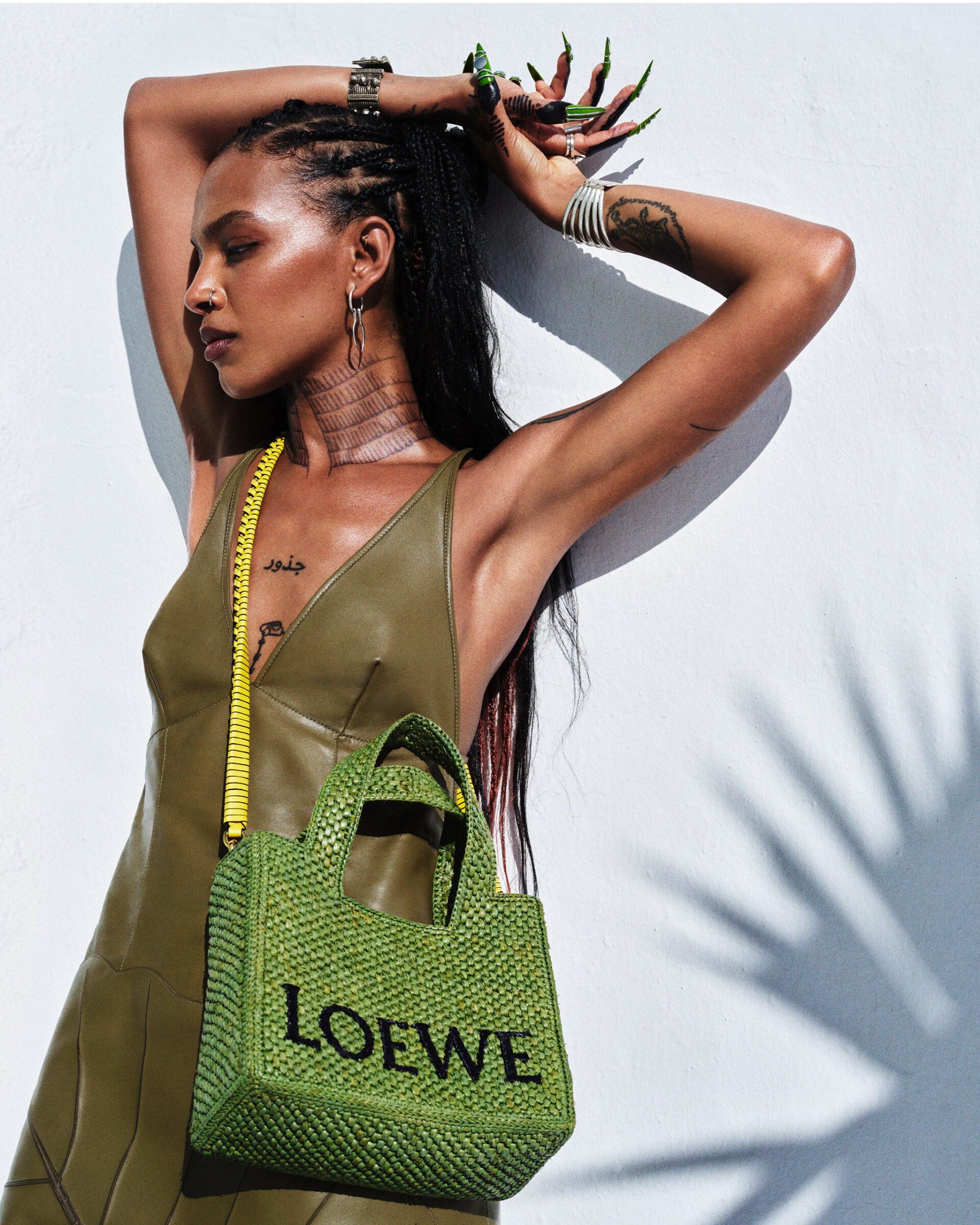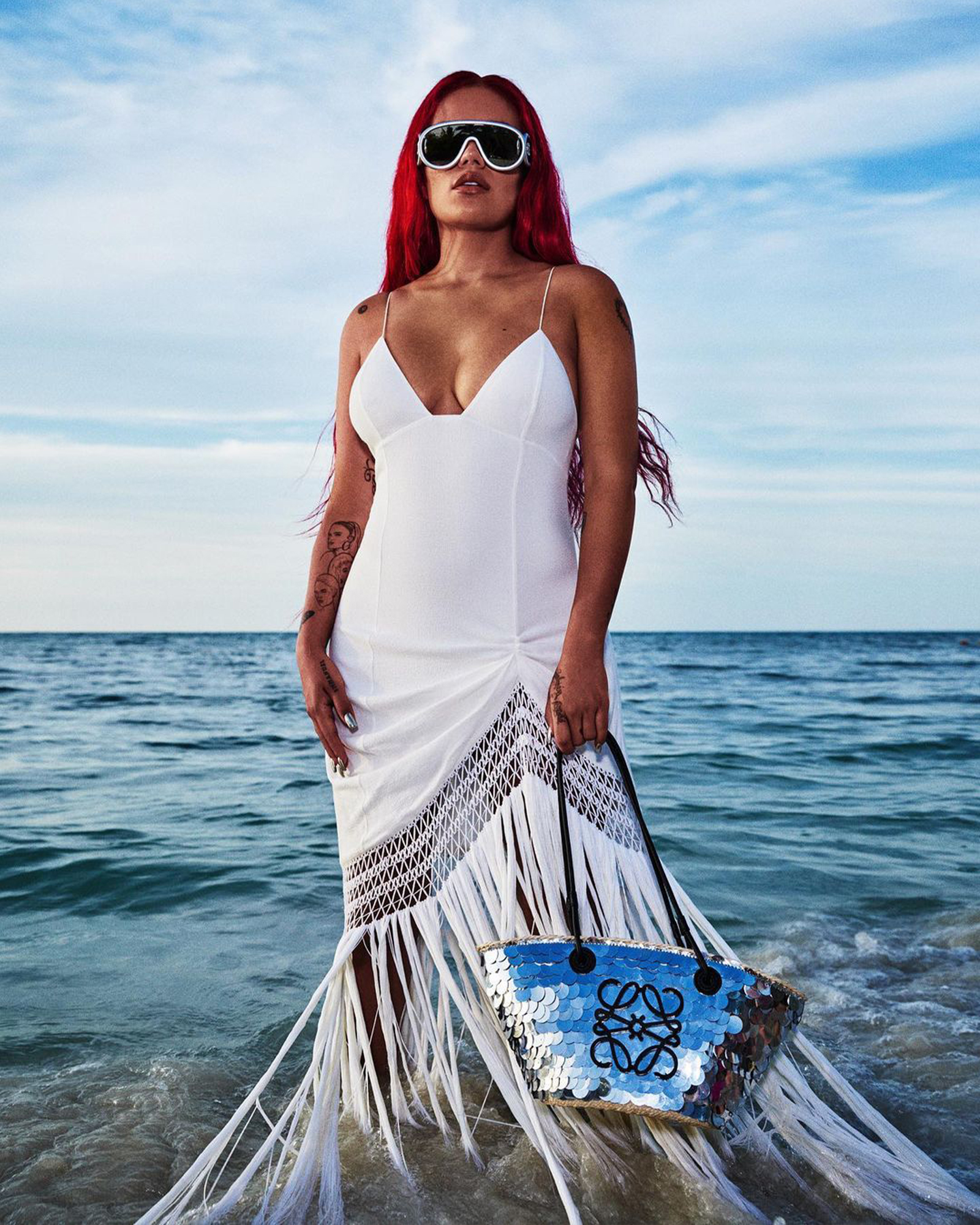 Bringing together a roster of fringe hemlines, leather leaf patches, and weaved accessories in organic earthy tones, the Madrid fashion house enlisted Colombian singer-songwriter Karol G and British singer and multidisciplinary artist Alewya to evoke beachside bliss and liberated energy of summer.