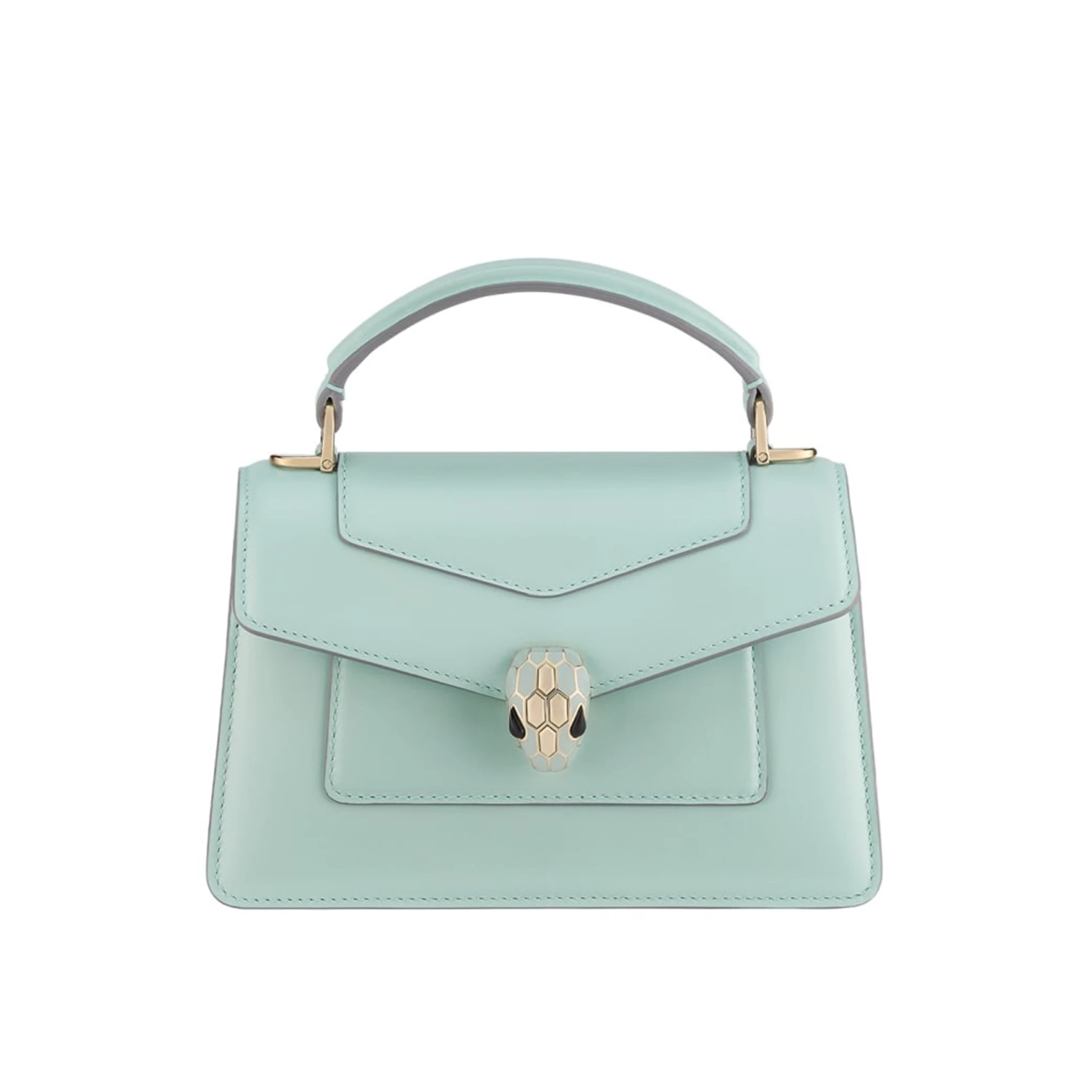 Vacation fashion is elevated with the Bulgari Serpenti Forever mini top handle bag, which refashions the classic carryall silhouette into an art deco-inspired accessory. The design is distinguished by its gold-plated brass snakehead clasp and fan-shaped Calla Matelassé motif on its aquamarine leather silhouette, details that are featured prominently in the Bulgari Serpenti collection and other leather-crafted creations.