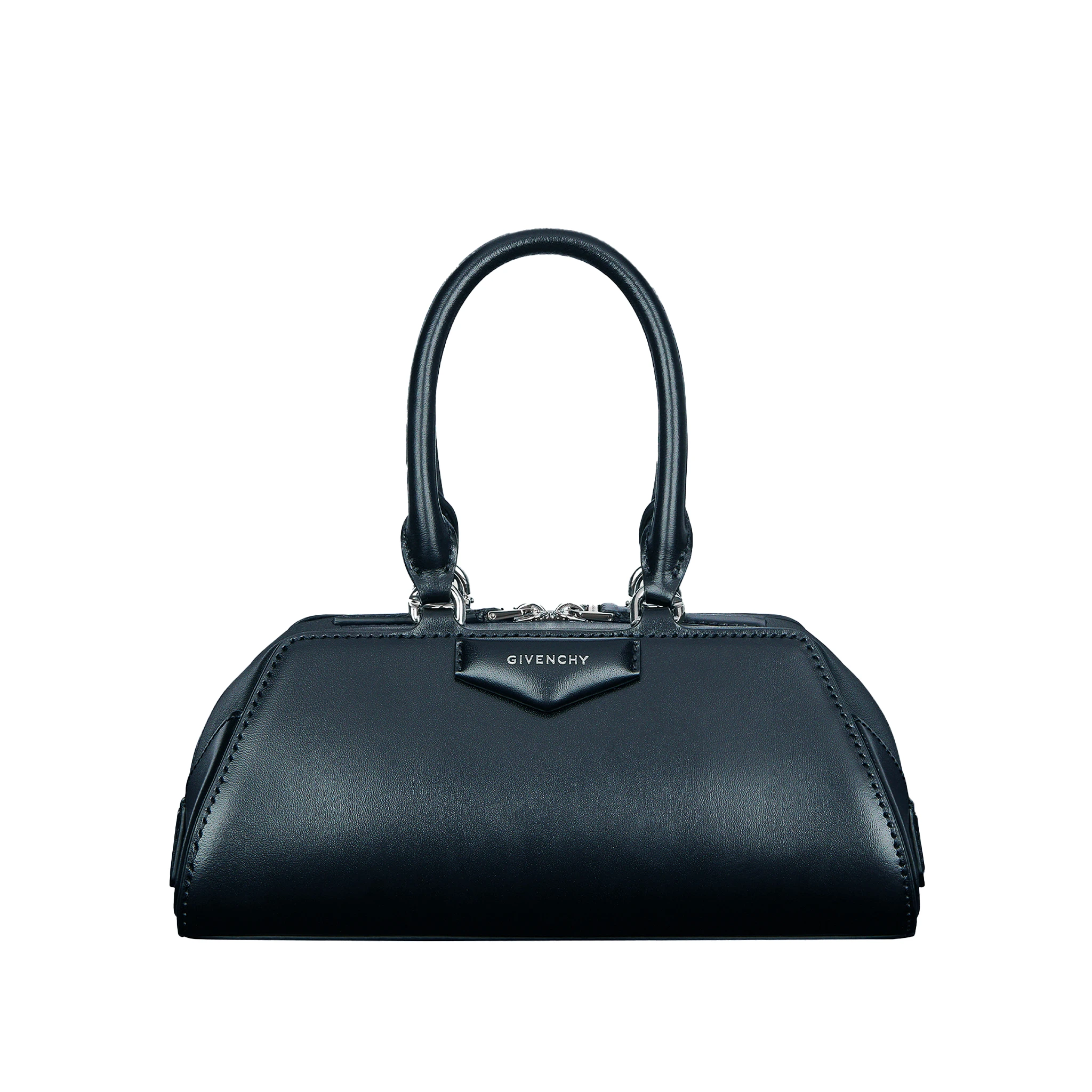 Incorporating a sleek black purse into the travel wardrobe, like this Givenchy Small Antigona East-West Bag in Box Leather bag, gives the wearer more ways to style their looks with less fuss over color and texture matching. The structured design of the bag comes with origami-style gussets and silver accents, while also adding a sense of versatility with its top handles and a removable strap.