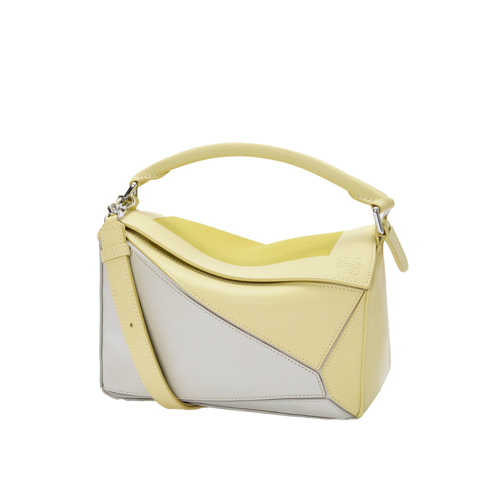 The LOEWE x Albers Fall Winter 2025 collaboration takes direct inspiration from the pioneers of 20th-century modernism: Josef and Anni Albers. Paying tribute to Josef’s Homage to the Square art series, the collection’s Small Puzzle Bag utilizes its crafted nappa calfskin to wrap across itself while bearing the artist’s intarsio squares design, creating an accessory that also serves as wearable art.