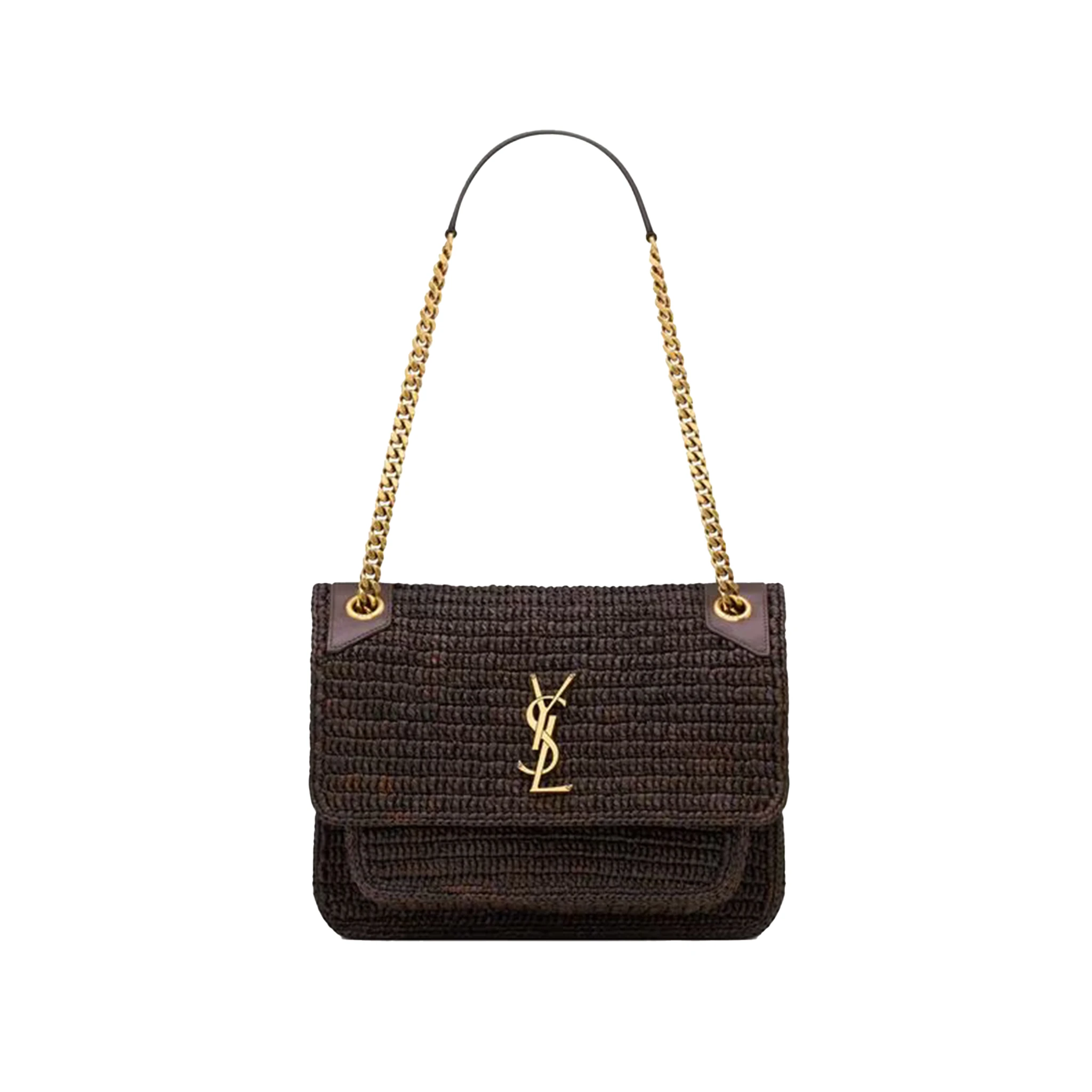 The Niki Medium in Raffia comes in grained lambskin and is embellished with the brand’s Cassandre logo. Due to its design, the bag also allows for on-the-go adaptability with its leather-and-chain strap, and can be worn as both a shoulder and crossbody bag by sliding the strap in place.
