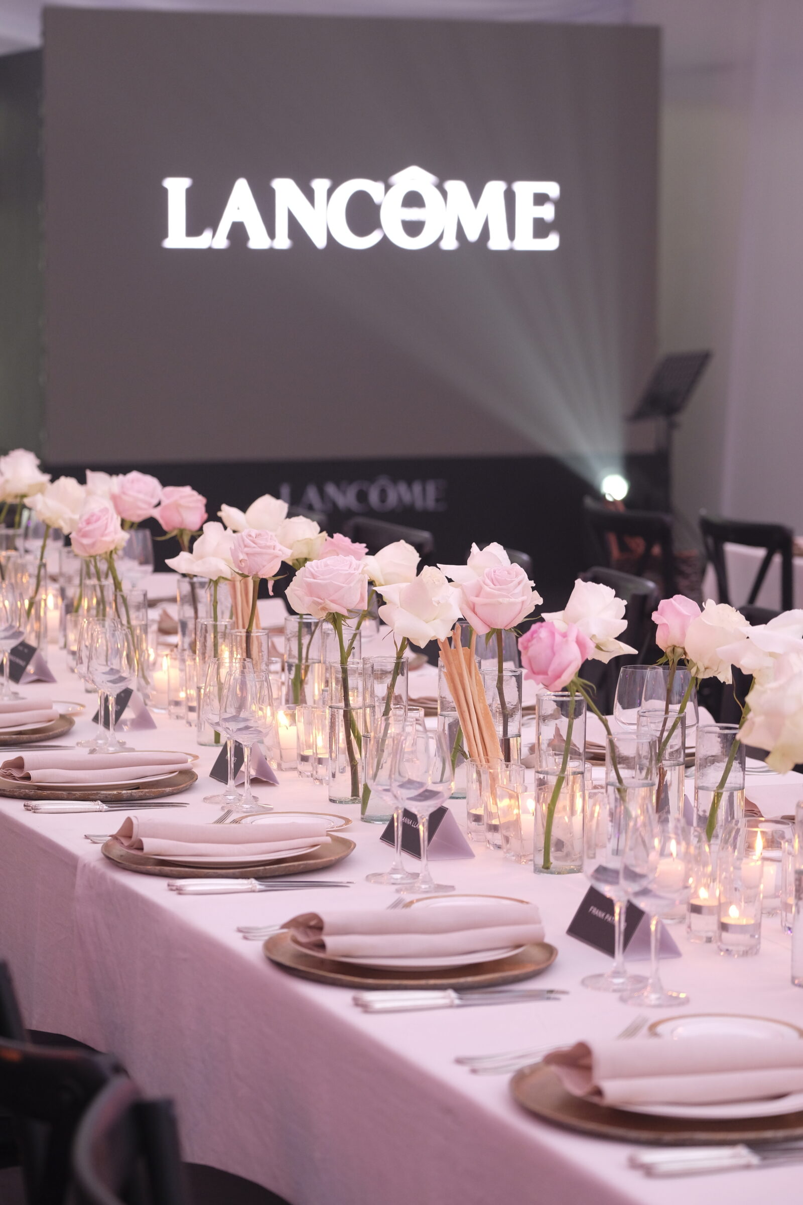 Adding excitement to the night was the surprise unveiling of the pop-up store adjacent to the dinner venue. With an entrance adorned with white and pink Ecuadorian roses and paper flowers reminiscent of the beauty brand’s rose-agora insignia, Lancôme’s pop-up boutique is styled in circular pods echoing the brand’s wordmark, showcasing the brand’s three main hallmarks: skincare, makeup, and fragrance.