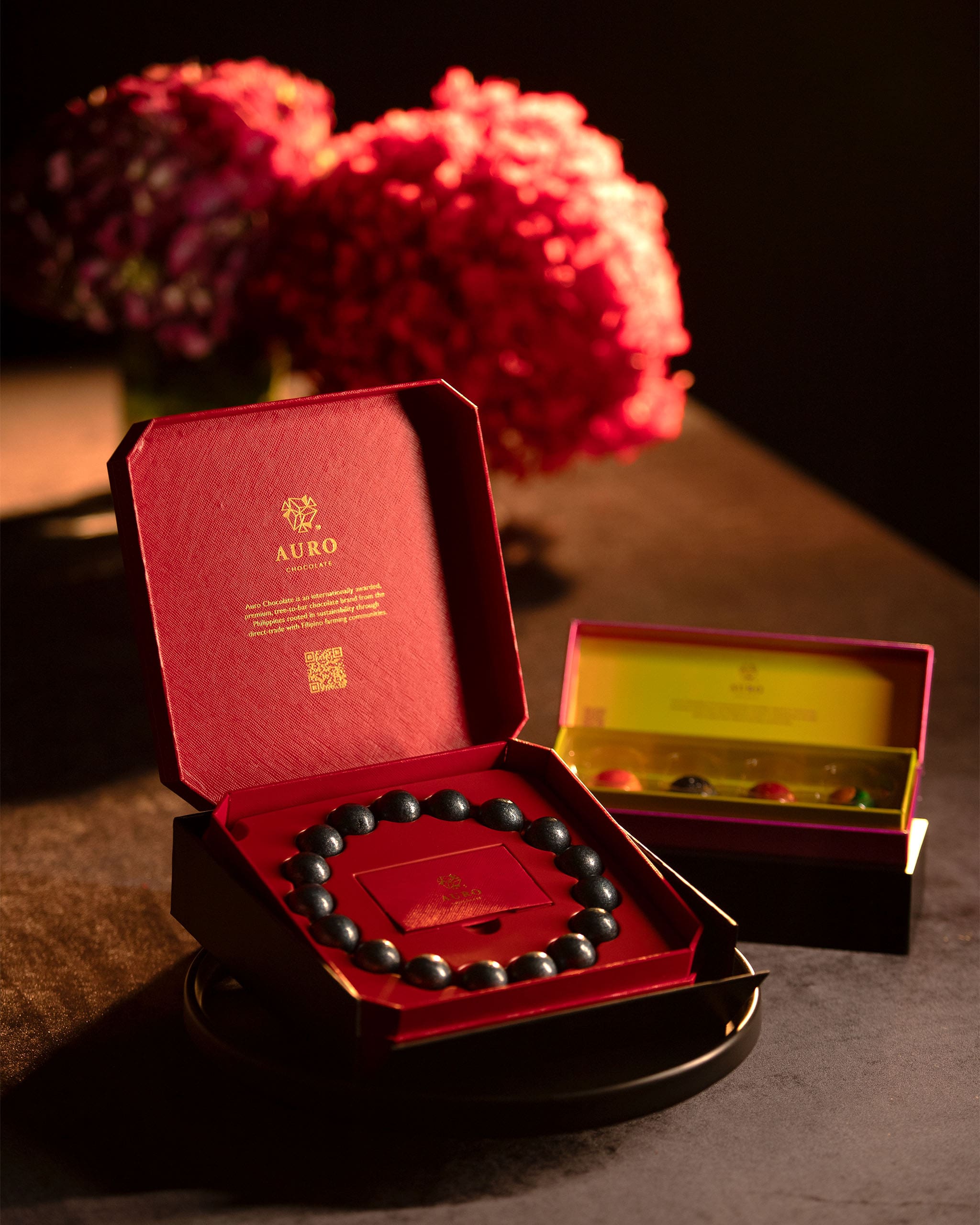 Philippine-origin cacao takes on the form of the country’s national gem, the South Sea pearl, as a nod to Filipino fashion. A symbol of radiance and wisdom much like the Filipino spirit, the hazelnut chocolate pearl dragees inside each jewelry box are made from cacao sustainably sourced directly from local farmers.