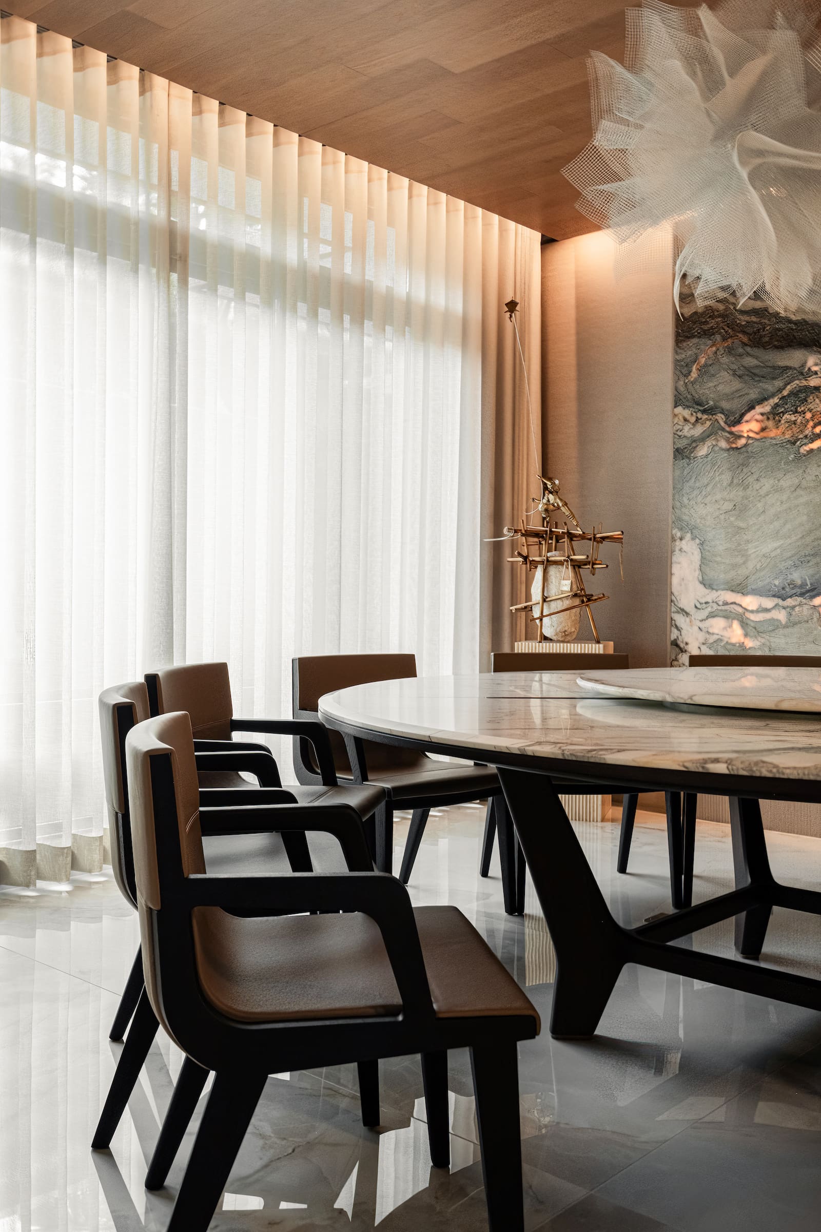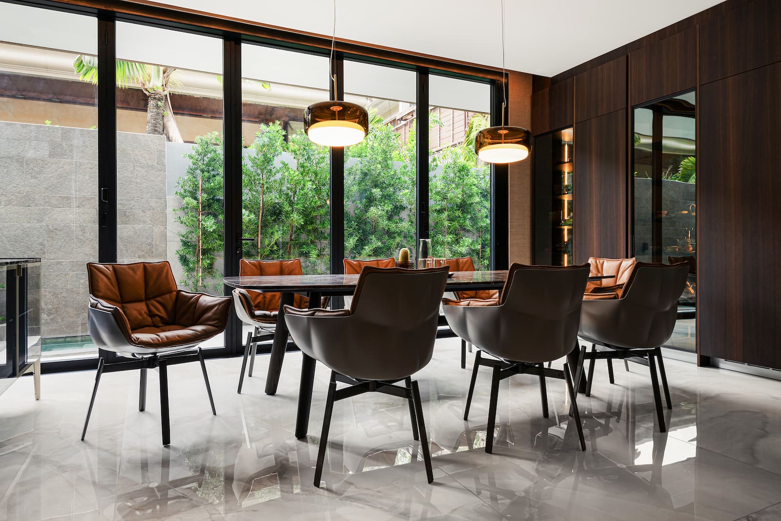 Within the dining space, Umali-Co advises that these principles still apply when choosing furniture to create a cozy ambiance. Blending the works of Antonio Citterio, the Acanto Chairs serve as a complementary pairing with either rounded or angular table designs. “Opt for decor that can transition seamlessly into everyday settings,” shares Umali-Co.