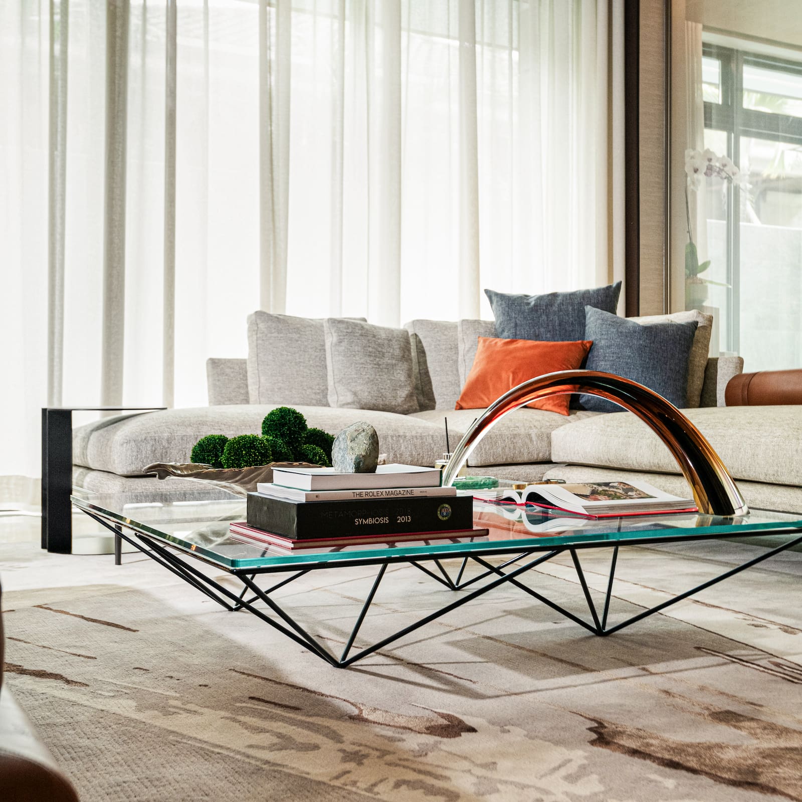 Complimenting the capitonné-designed sofa, the Button Table by Edward Barber and Jay Osgerby as well as the Grande Papilio Armchair by Naoto Fukasawa not only offer their varieties in texture to the space but also through dynamic yet subdued and symmetrical designs.