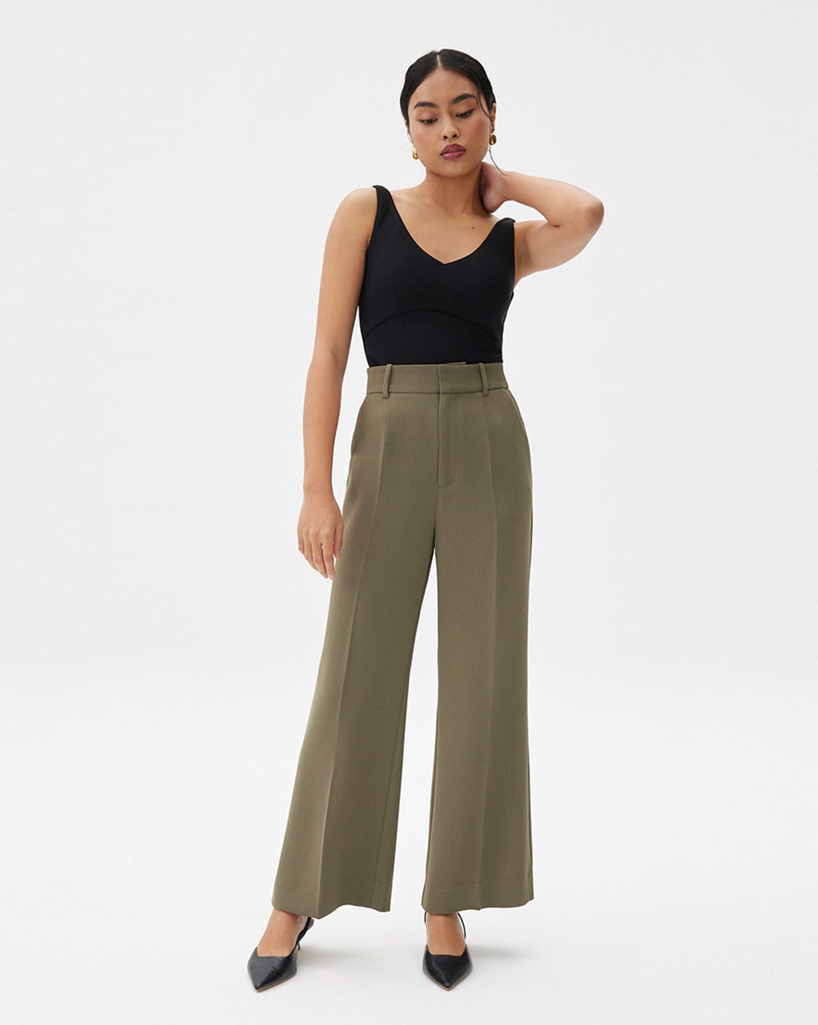 Spend the day at the museums in a carefree fit which consists of the Natalia scoop neck fitted top in a refreshing olive and pair it with the easy-to-wear yet sleek Anh pleated straight leg pants. While the top offers support through its padded and body-skimming make, the pants’ plisse material combines comfort and style with ease.