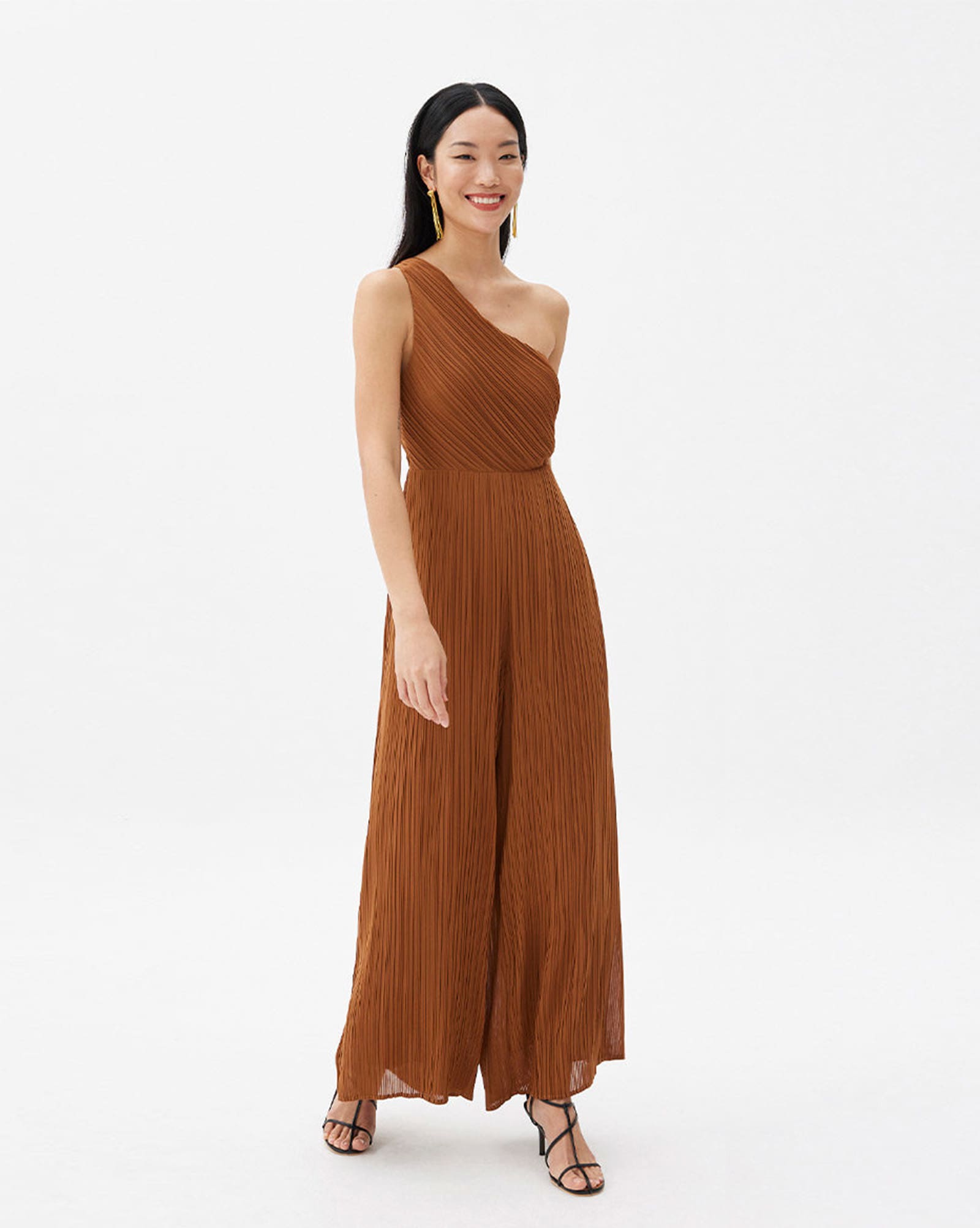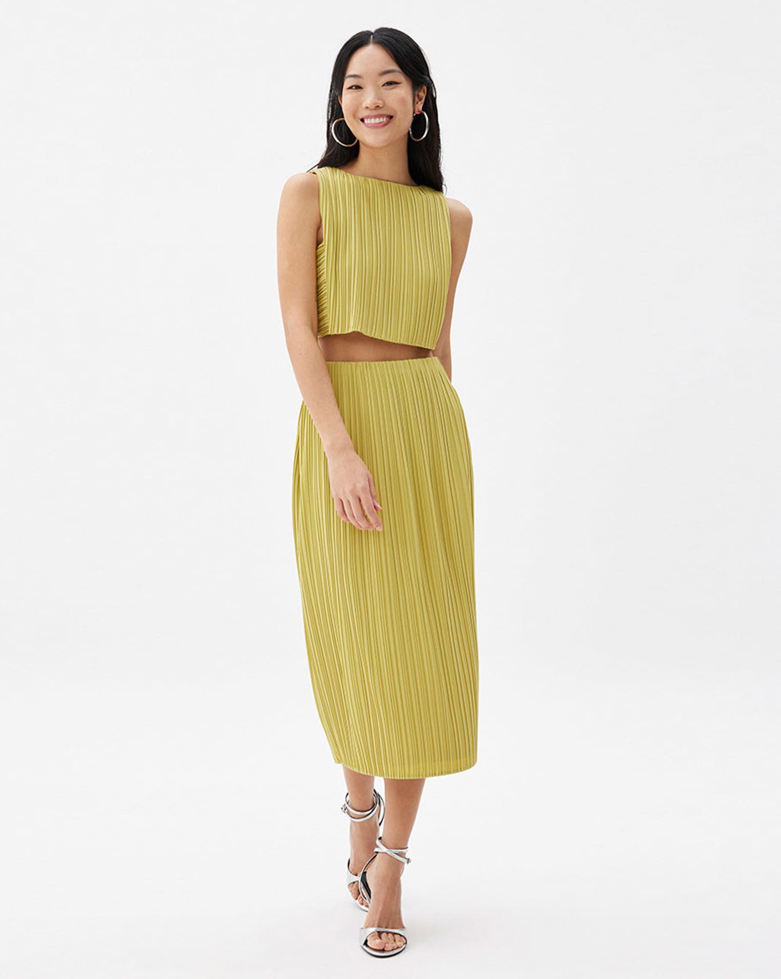 Get ready for an evening out on the town or date night with friends (and twin with Gym) in the sophisticated yet statement Simone pleated padded twist back jumpsuit. For a balmier option that’s suited for the tropics, opt for Mya’s Dez pleated boat neck crop top and the Gym pleated column midi skirt combination in a refreshing dusty citron hue.