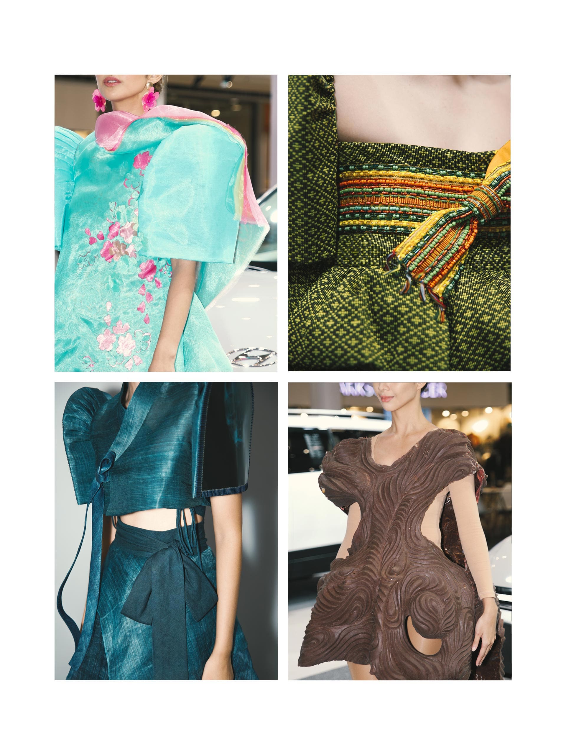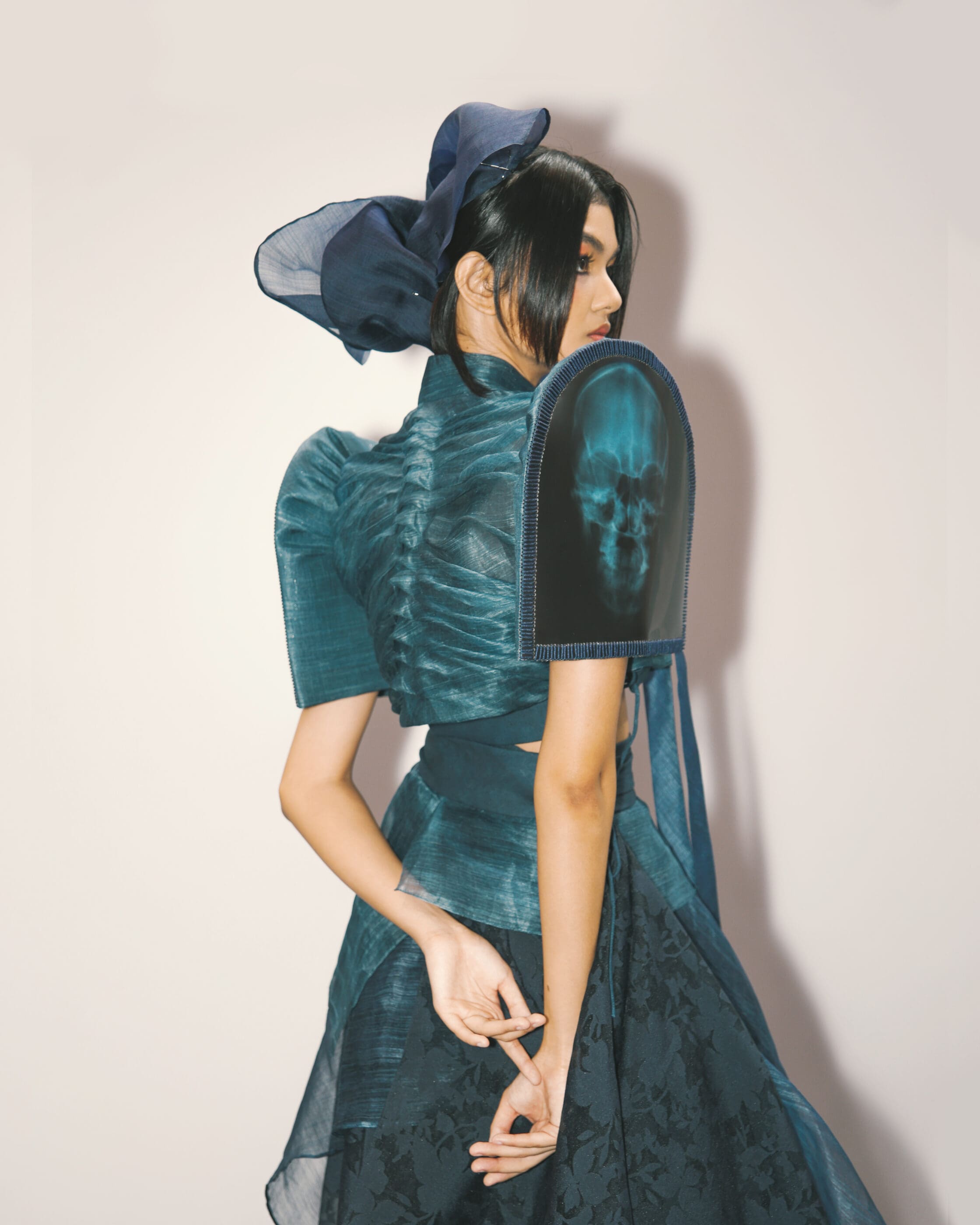 As the lights began to dim and the first ensemble began walking through the makeshift runway, a silhouette dressed in varying shades of blue began weaving in between Hyundai’s vehicles that stood as bastions throughout the space. The first look was designed by fashion designer Glyn Alley Magtibay, who has been enamored by the beauty of X-rays which have become a recurring motif in her work. For the look she created, she interweaved three main elements: X-ray films, the hanbok, and the terno, respectively.