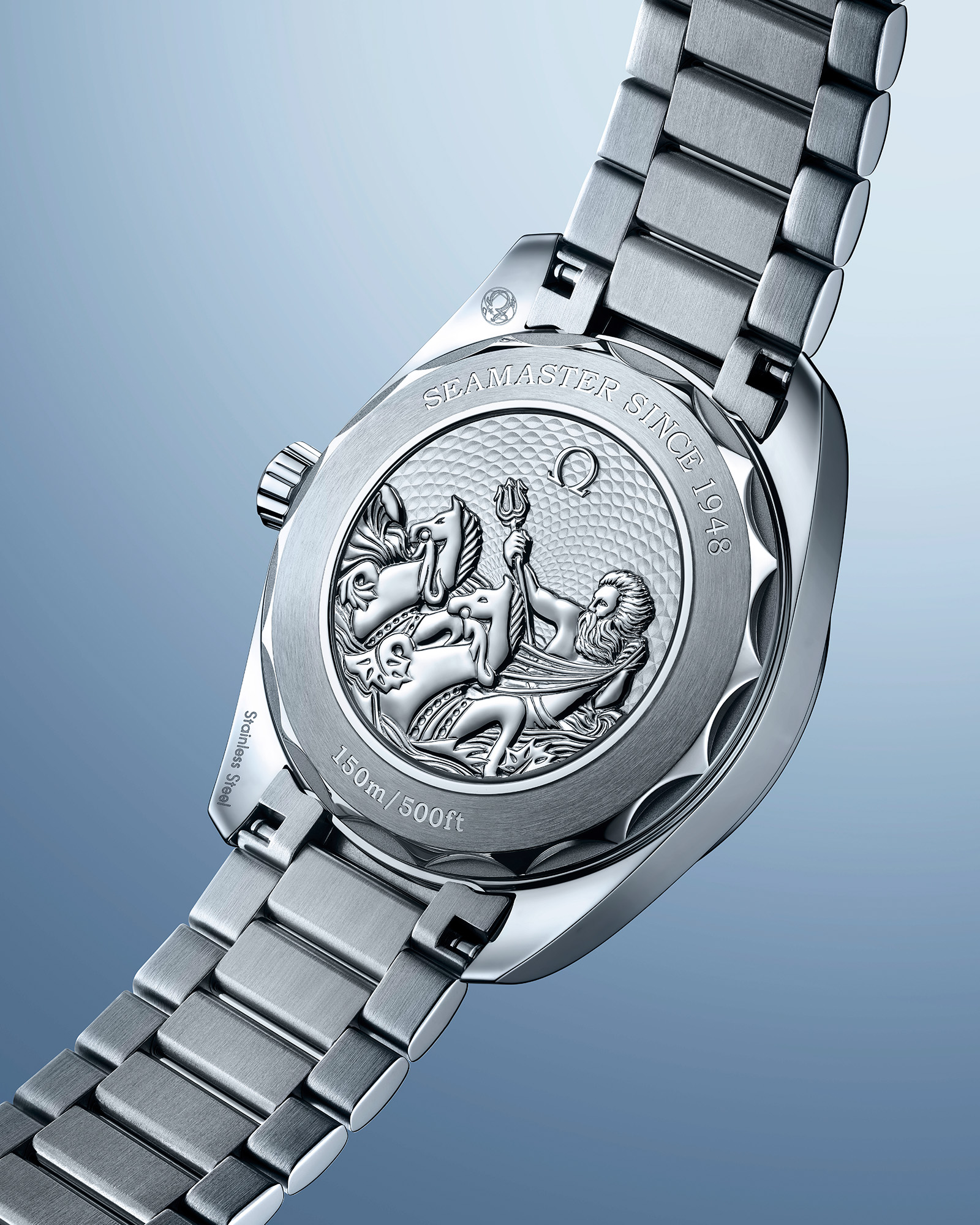 For the Summer Blue Collection, Omega tracks the trajectory of the Seamaster and its history of adaptation through the lens of diving. Common to each model, special editions of the Seamaster are recolored in Omega’s Summer Blue and are adorned with a commemorative caseback featuring sculpted representations of Neptune.