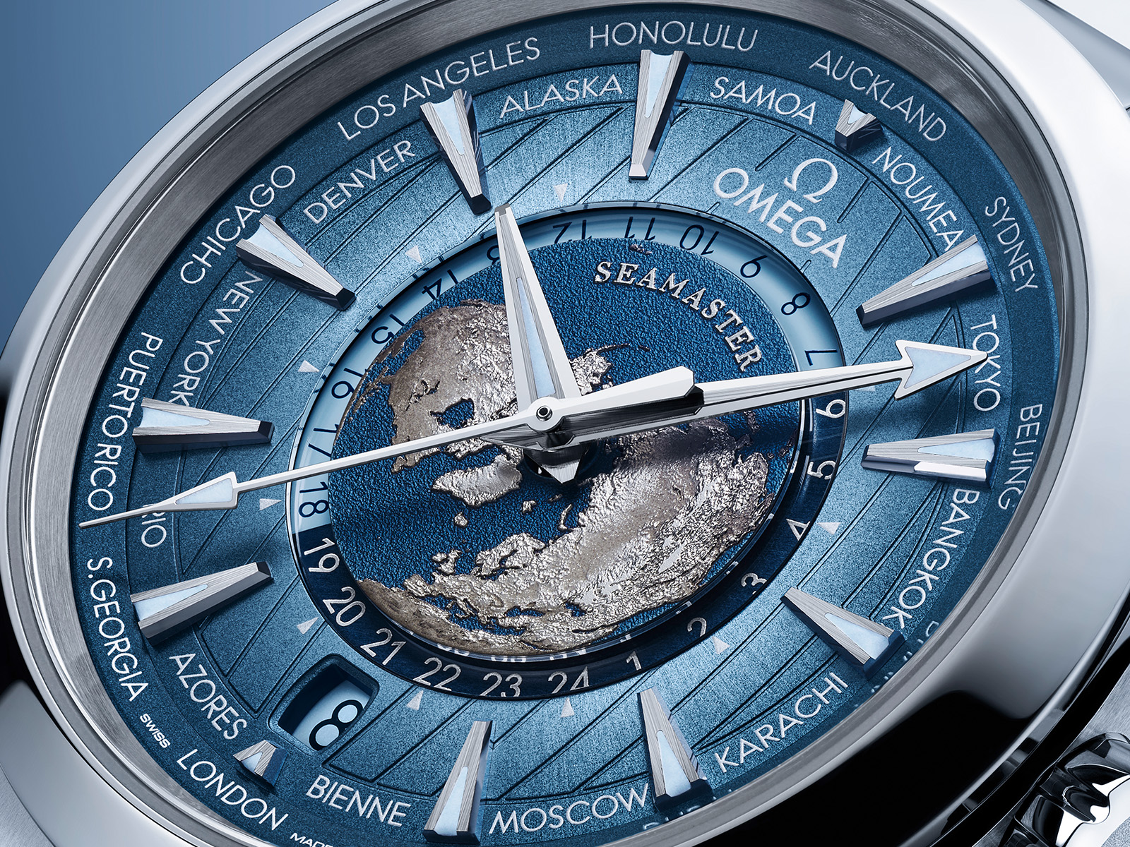 The first in the collection is a rerelease of the Seamaster Aqua Terra and the Aqua Terra Worldtimer. The base Aqua Terra is being updated alongside three new cases in 38mm or 41mm diameters, while the Worldtimer features an embossed image of a globe at the center of its watch face and global destinations across its outer display.