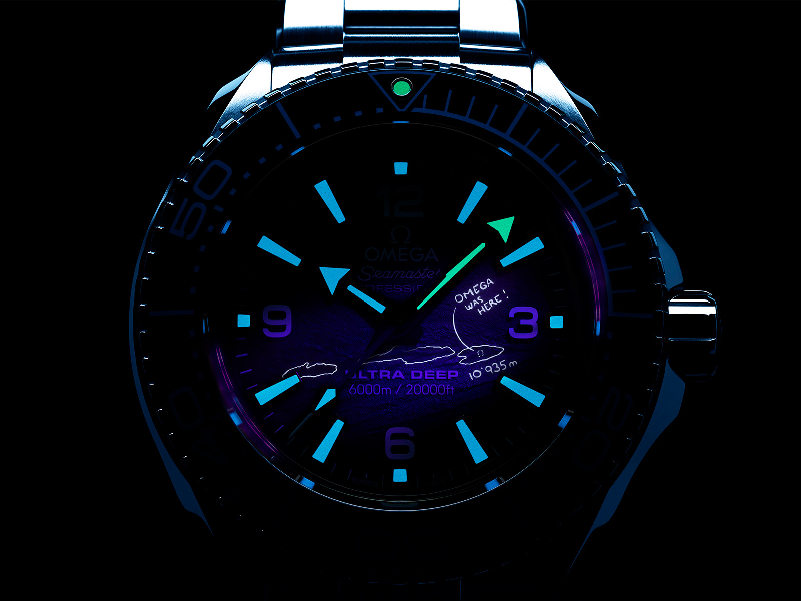 Bolstering their legacy of adaptation, the Seamaster Ultra Deep had been recognized for remaining functional at a depth of 6000 meters within the Mariana Trench. The new edition of the Ultra Deep features a modification of the watch face to mirror the map points of Challenger’s Deep, and has the words “Omega Was Here” etched onto the dial’s detailing to commemorate the record-breaking expedition.