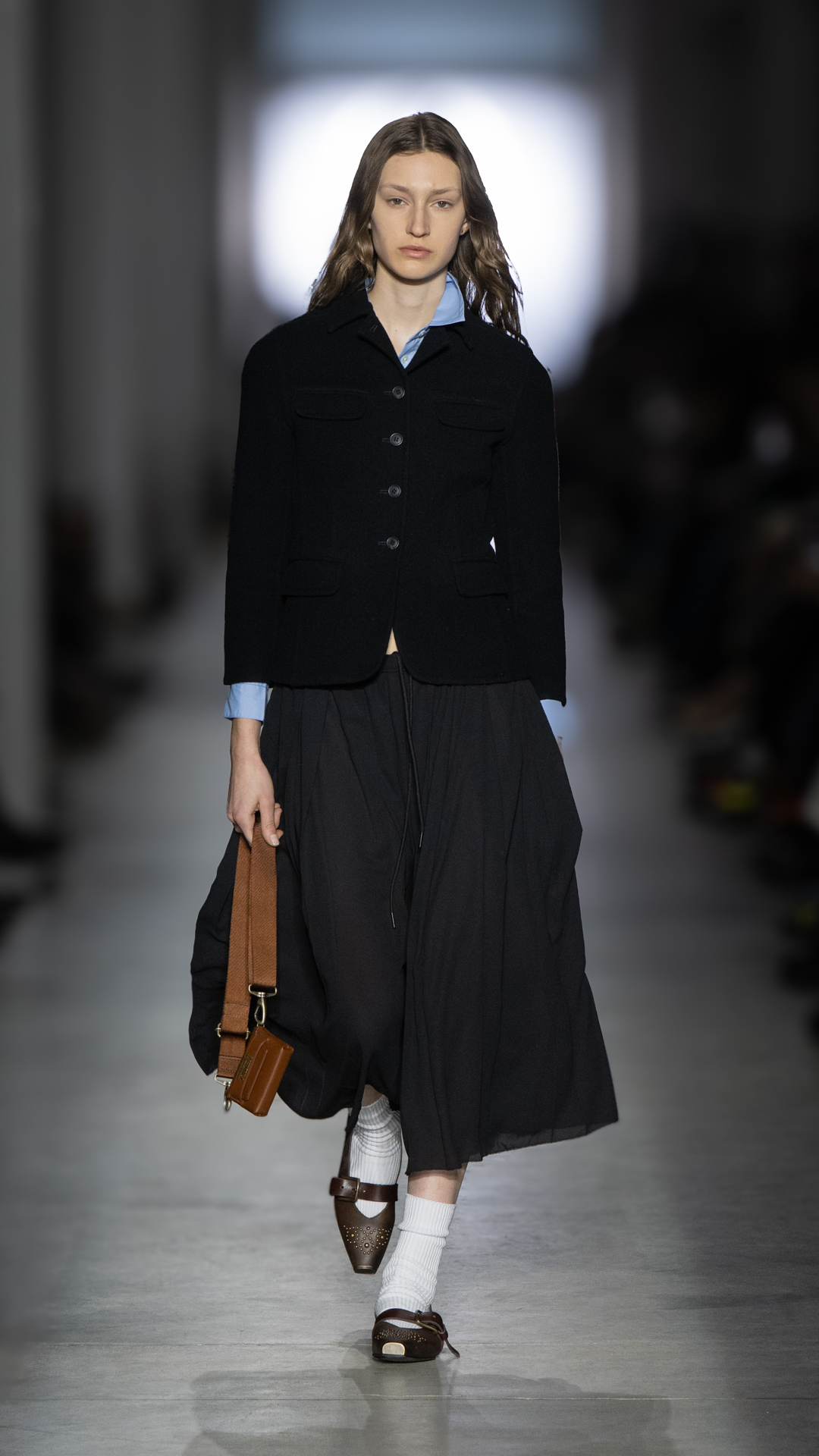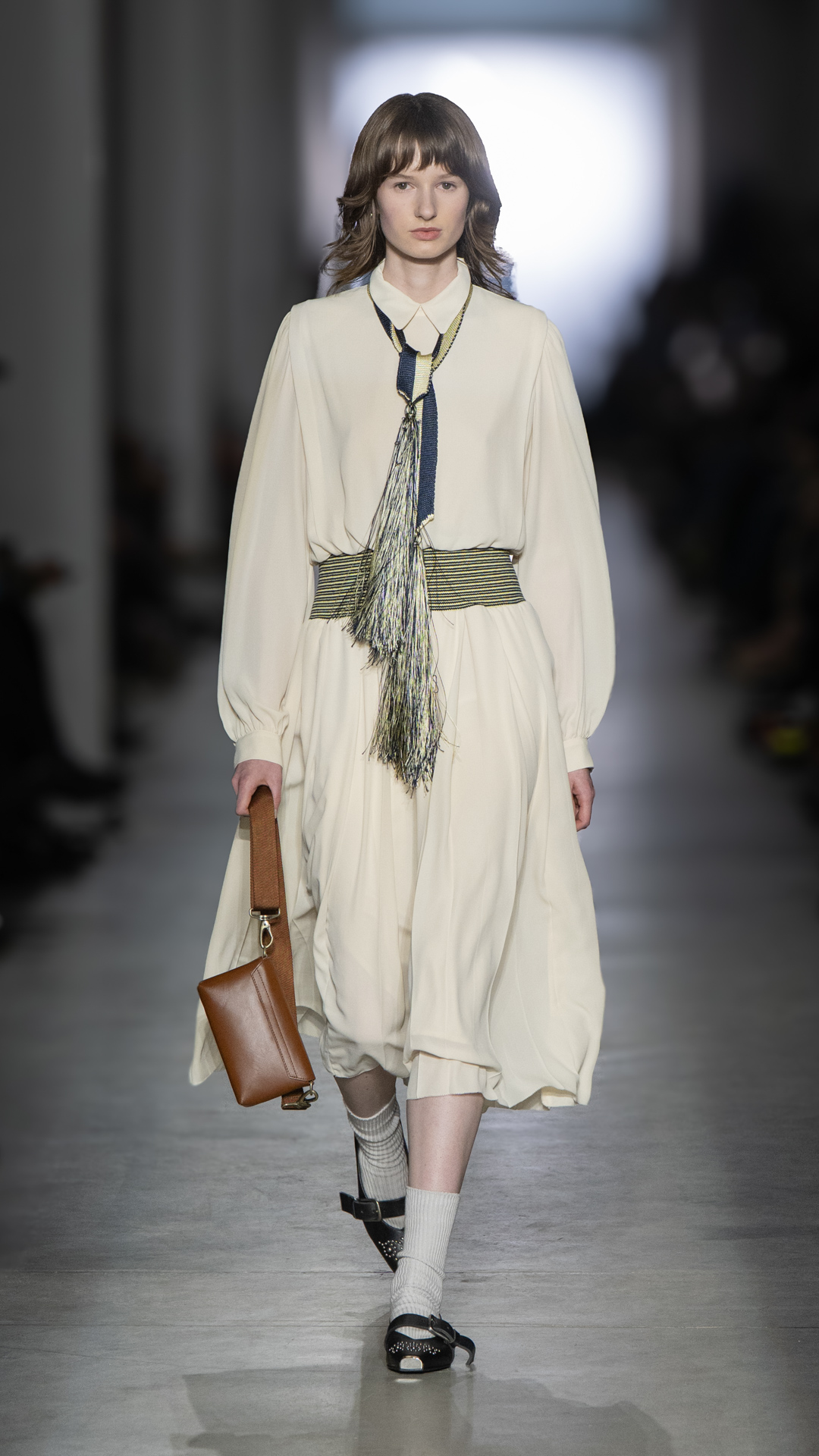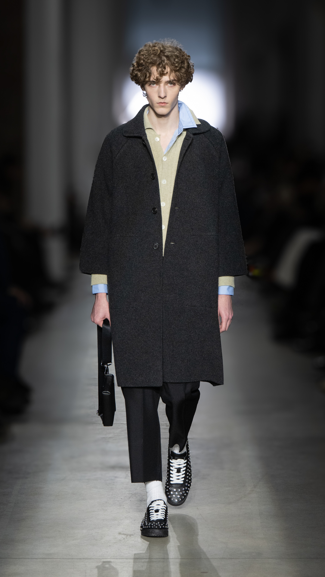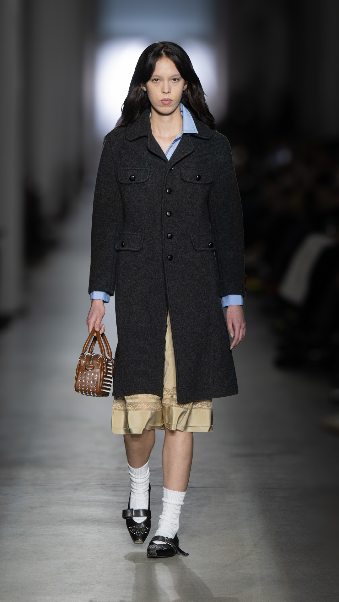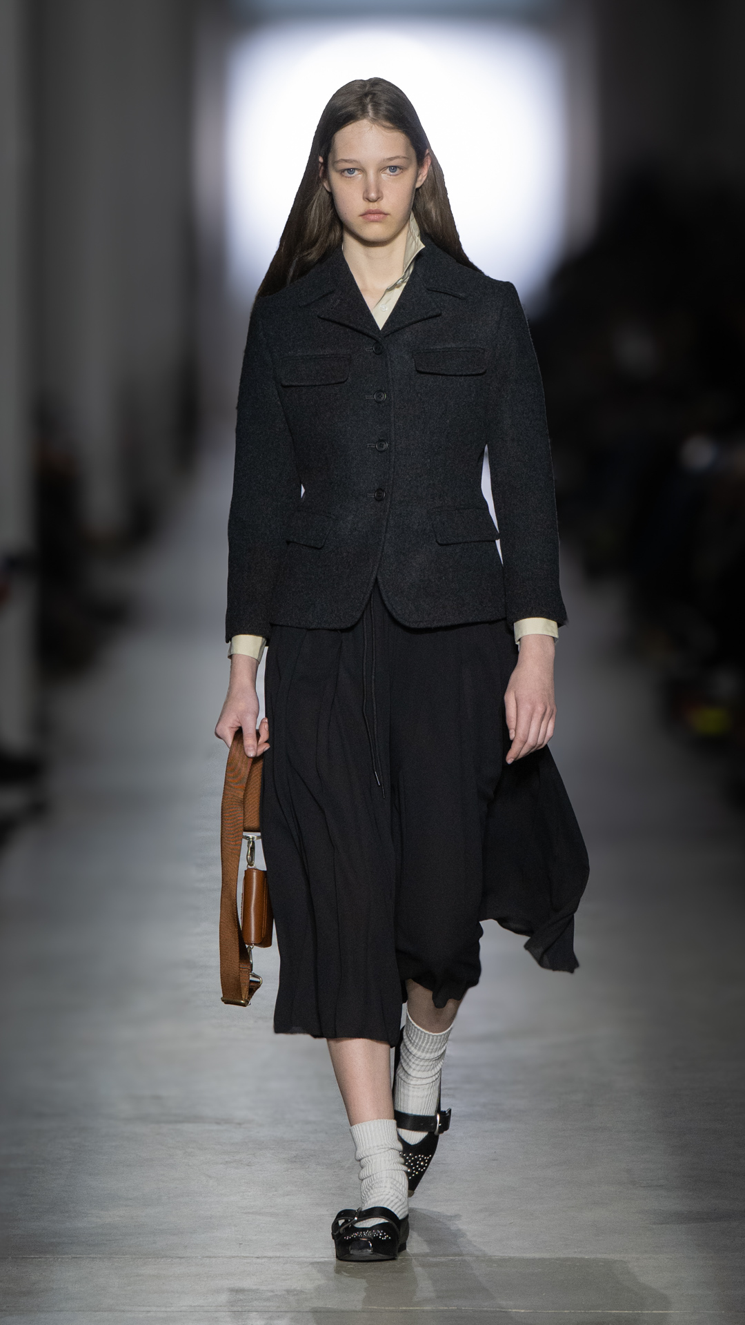 From classic pea coats and wool twinsets and the brand’s classic sneakers, wearable wardrobe was the mindset, but this did not stop Pomolio from surprising. No pairing was predictable; louche silk dresses with oversized jackets felt fresh, juxtaposed with ballerina flats and casual pullovers, while double-layered Nordic-style knits and Brit-inspired waxed-cotton jackets spoke of influences from further afield. Almost exaggeratedly slimmed, cropped tailoring silhouettes and shrunken peacoats lent a knowing edge to otherwise classic pieces, bringing a modernity to staples we know and love.