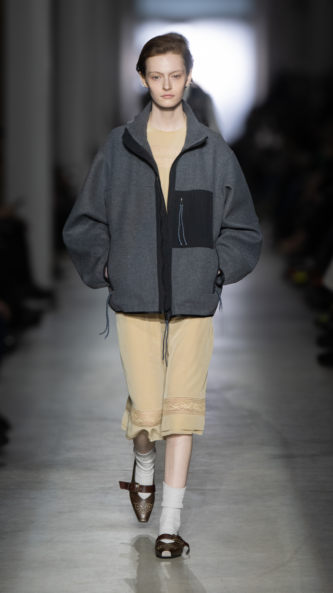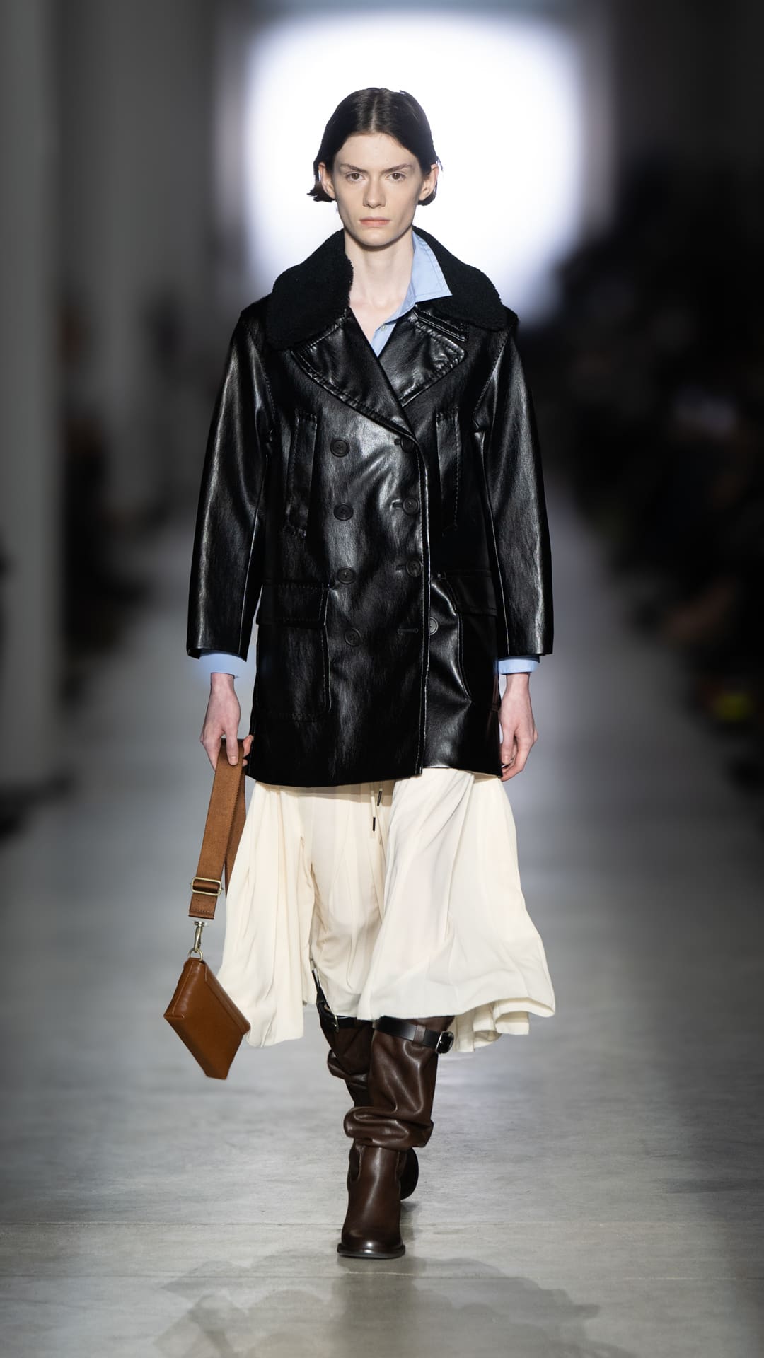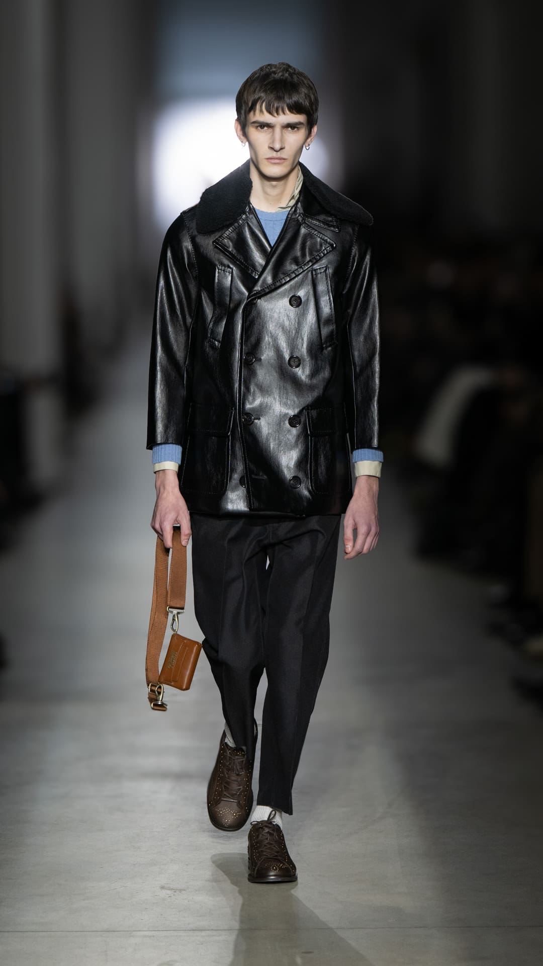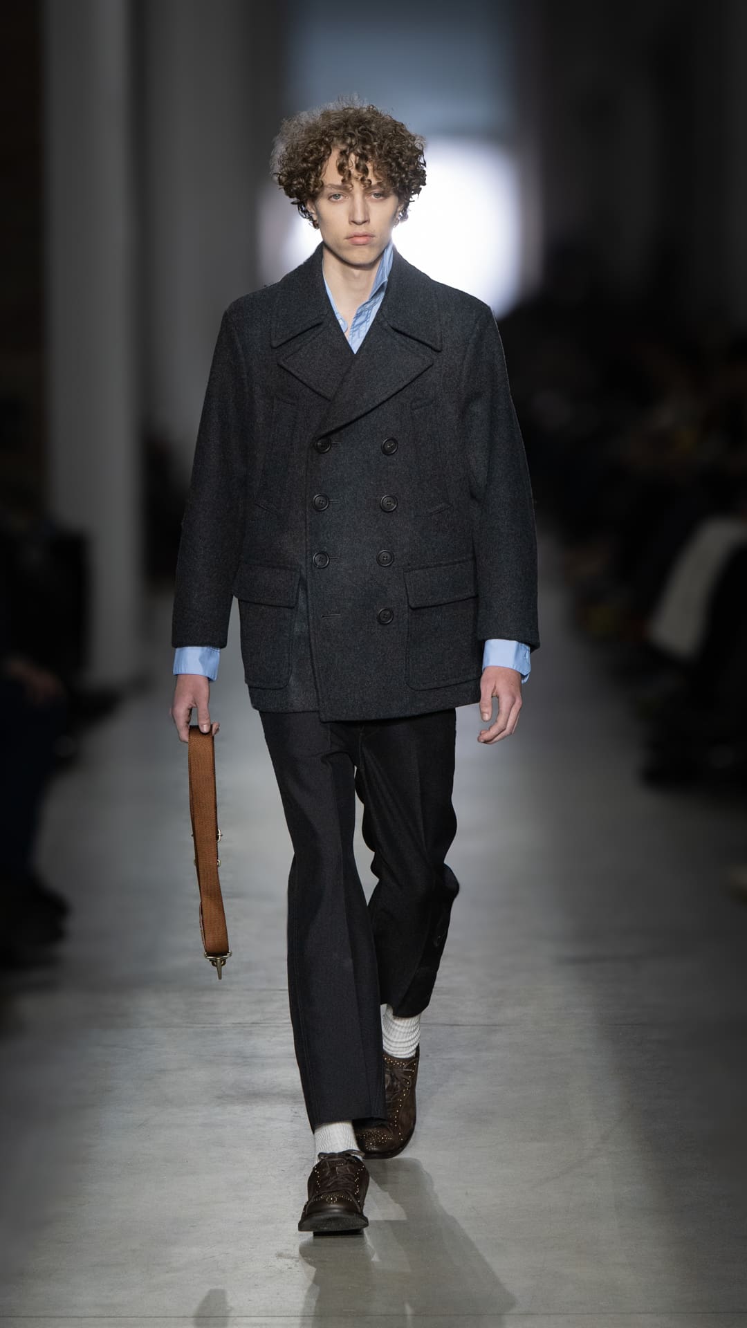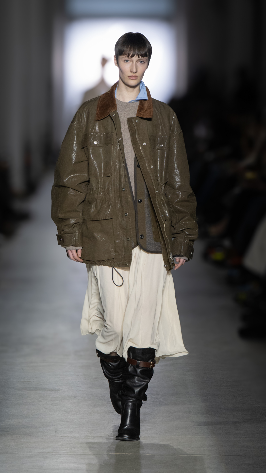 From classic pea coats and wool twinsets and the brand’s classic sneakers, wearable wardrobe was the mindset, but this did not stop Pomolio from surprising. No pairing was predictable; louche silk dresses with oversized jackets felt fresh, juxtaposed with ballerina flats and casual pullovers, while double-layered Nordic-style knits and Brit-inspired waxed-cotton jackets spoke of influences from further afield. Almost exaggeratedly slimmed, cropped tailoring silhouettes and shrunken peacoats lent a knowing edge to otherwise classic pieces, bringing a modernity to staples we know and love.