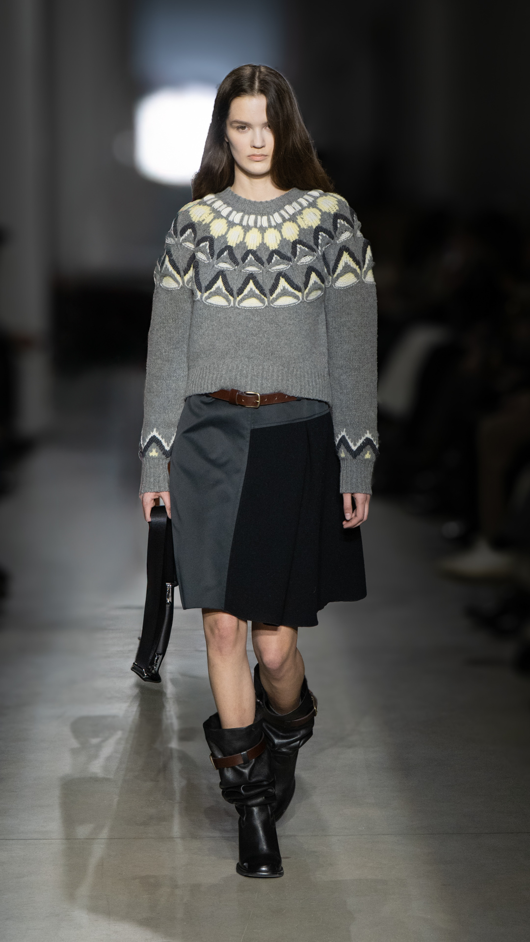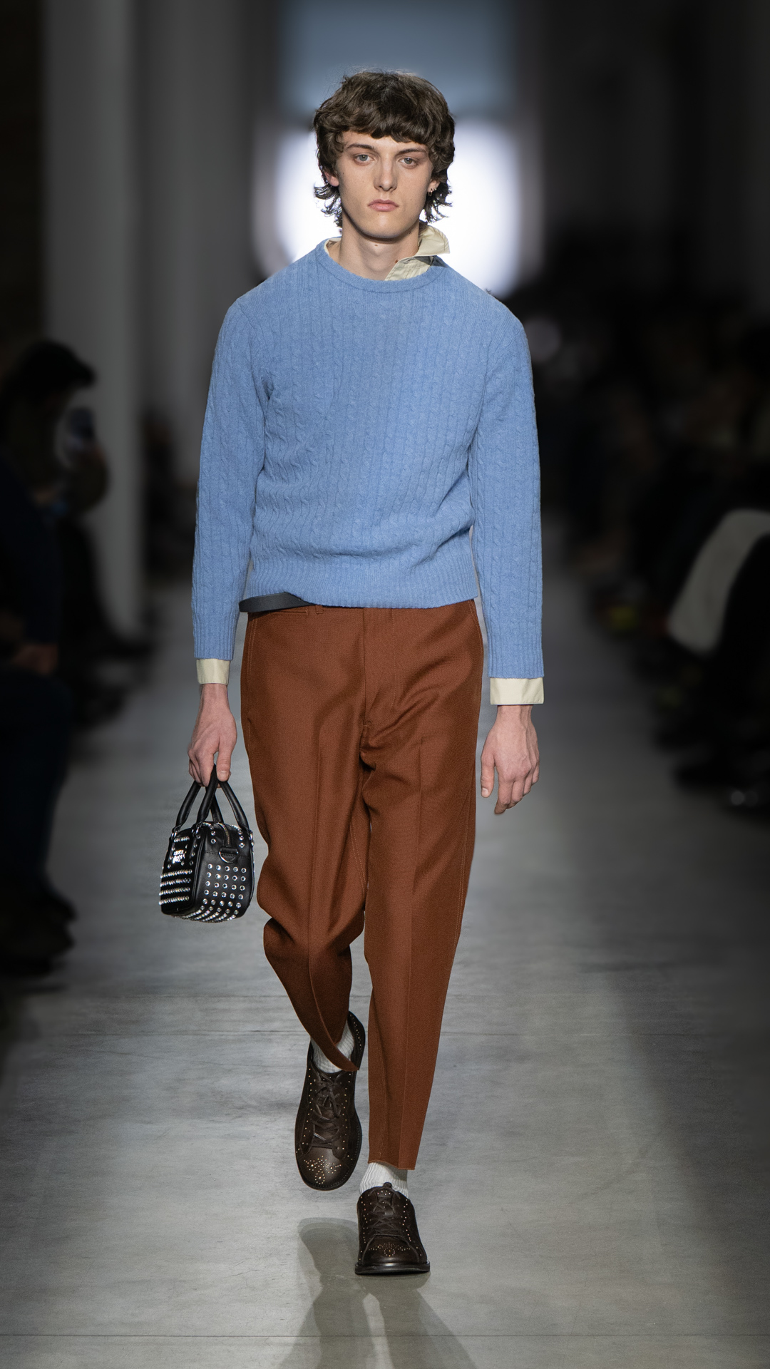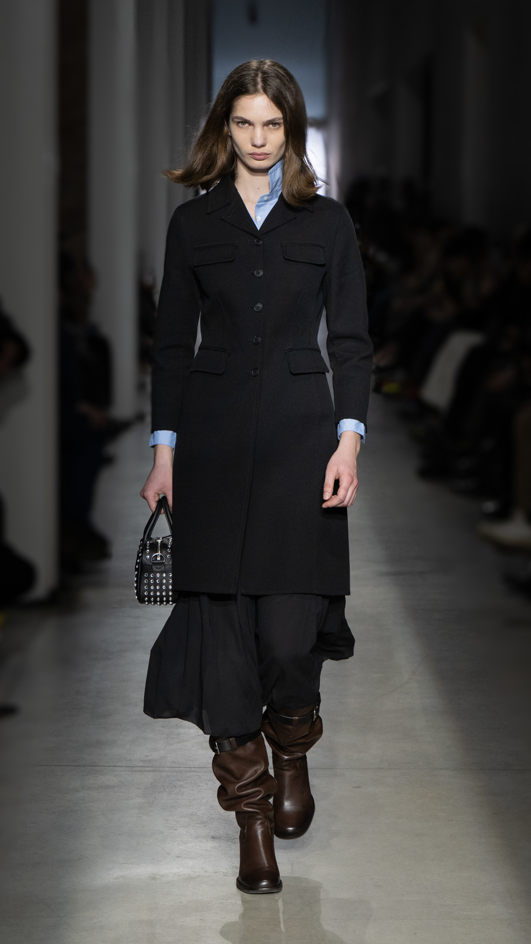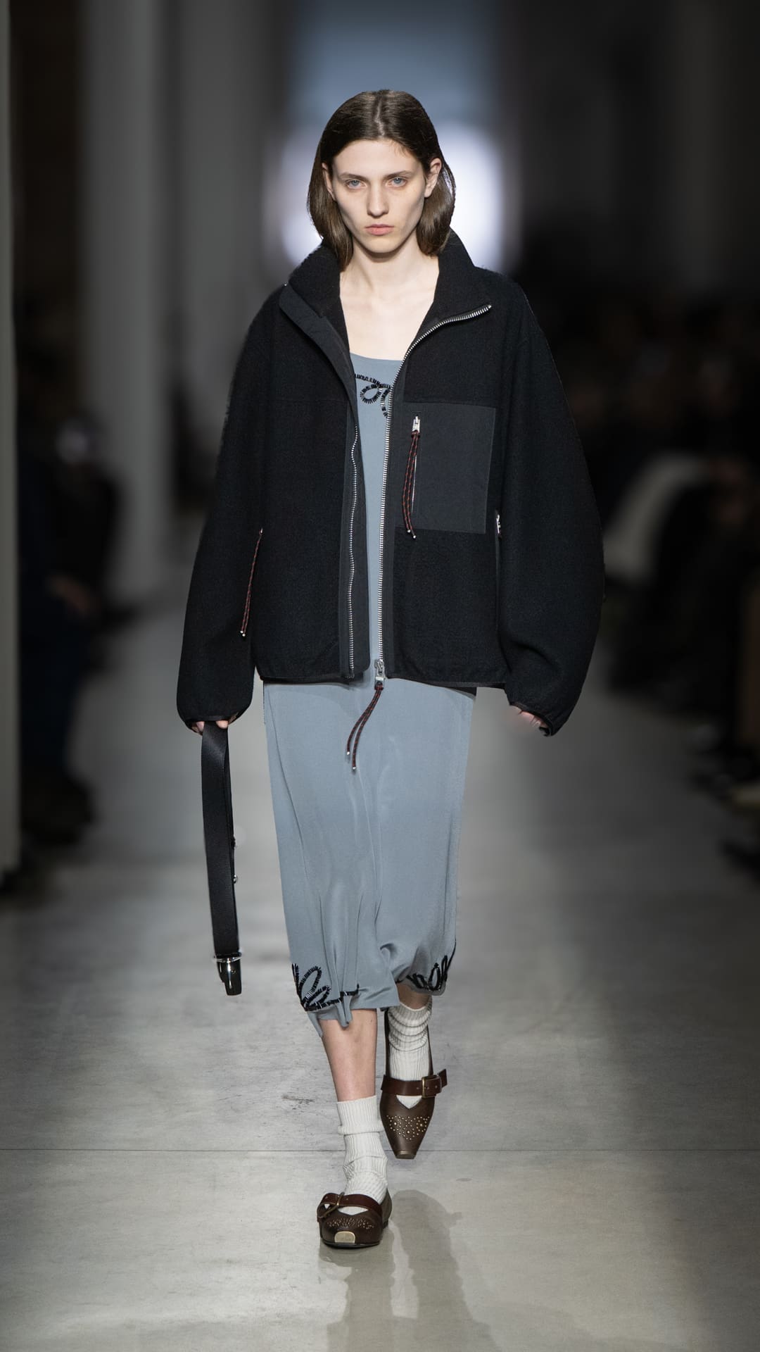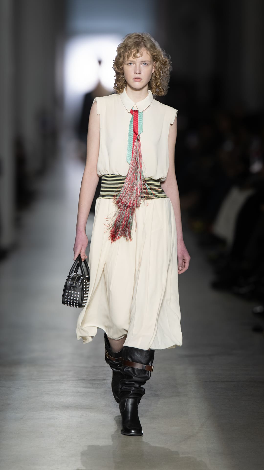 From classic pea coats and wool twinsets and the brand’s classic sneakers, wearable wardrobe was the mindset, but this did not stop Pomolio from surprising. No pairing was predictable; louche silk dresses with oversized jackets felt fresh, juxtaposed with ballerina flats and casual pullovers, while double-layered Nordic-style knits and Brit-inspired waxed-cotton jackets spoke of influences from further afield. Almost exaggeratedly slimmed, cropped tailoring silhouettes and shrunken peacoats lent a knowing edge to otherwise classic pieces, bringing a modernity to staples we know and love.