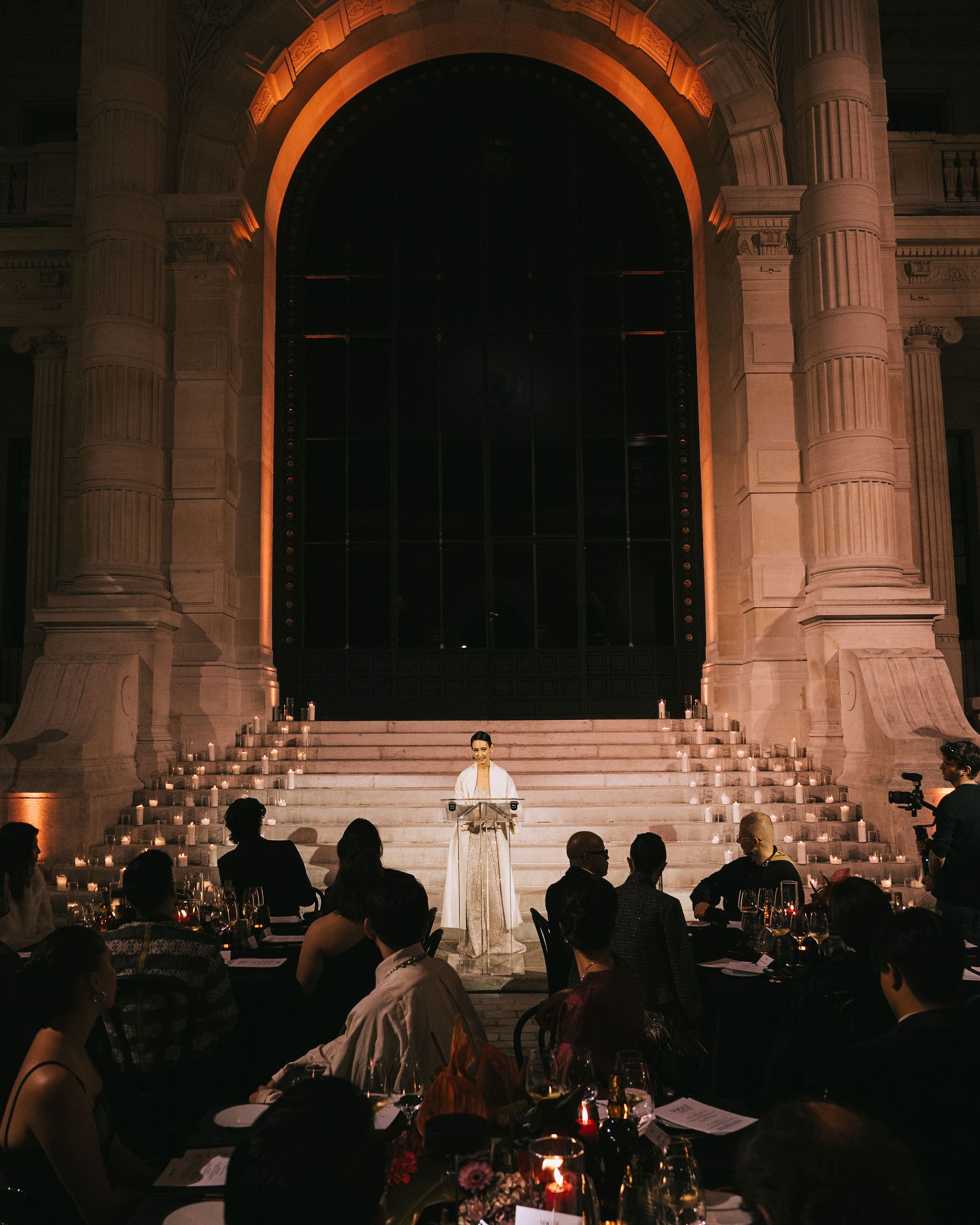 Held in the square of Palais Galliera, also known as the “museum of fashion and fashion history,” its halls were decorated with a mix of contemporary and Filipino elements. The tables, draped in black, were decorated with red florals and Maison de L’Asie fragrance sheets of green tea, bergamot, coconut, and vetiver.