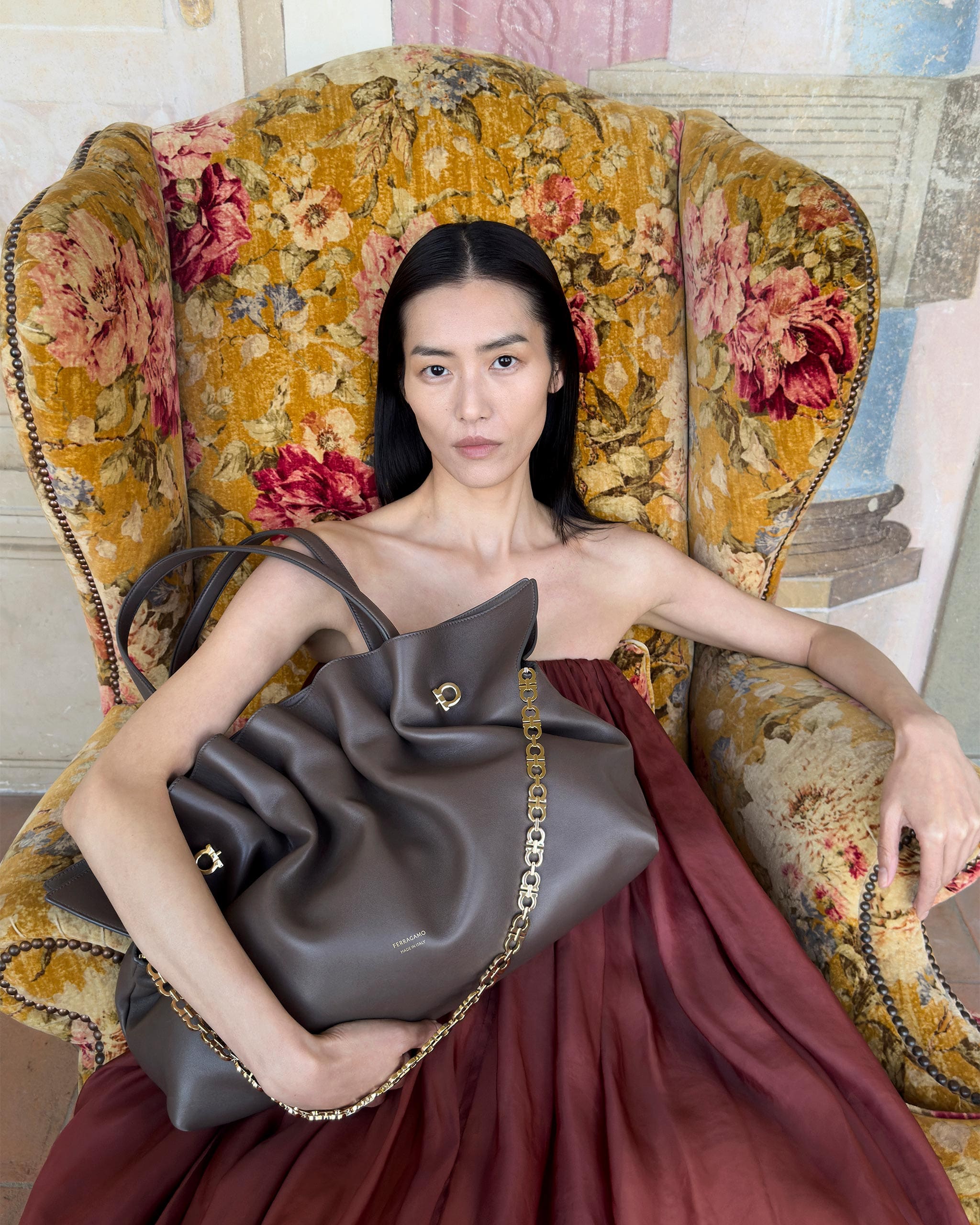 In the campaign, Liu Wen is featured across a floral armchair or standing against sun-drenched stone, she carries the new Ferragamo Soft Bag pierced with Gancini hardware or folded into asymmetrical shapes.