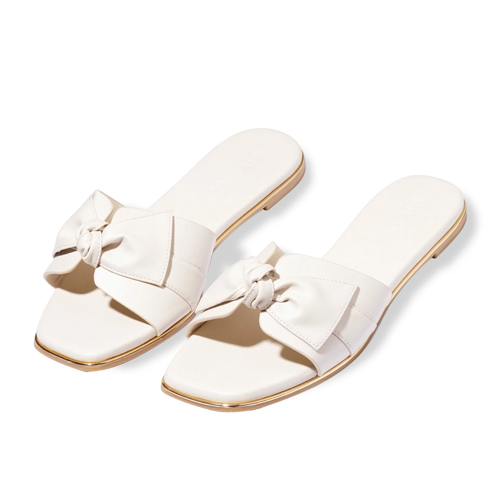 Paired with these understated pieces, the Kazumi flat sandals feature a full PU leather construction, with an upper strap connecting to a bowed motif. The sandals also feature a golden outline along each welt for an added flourish to an otherwise relaxed look.