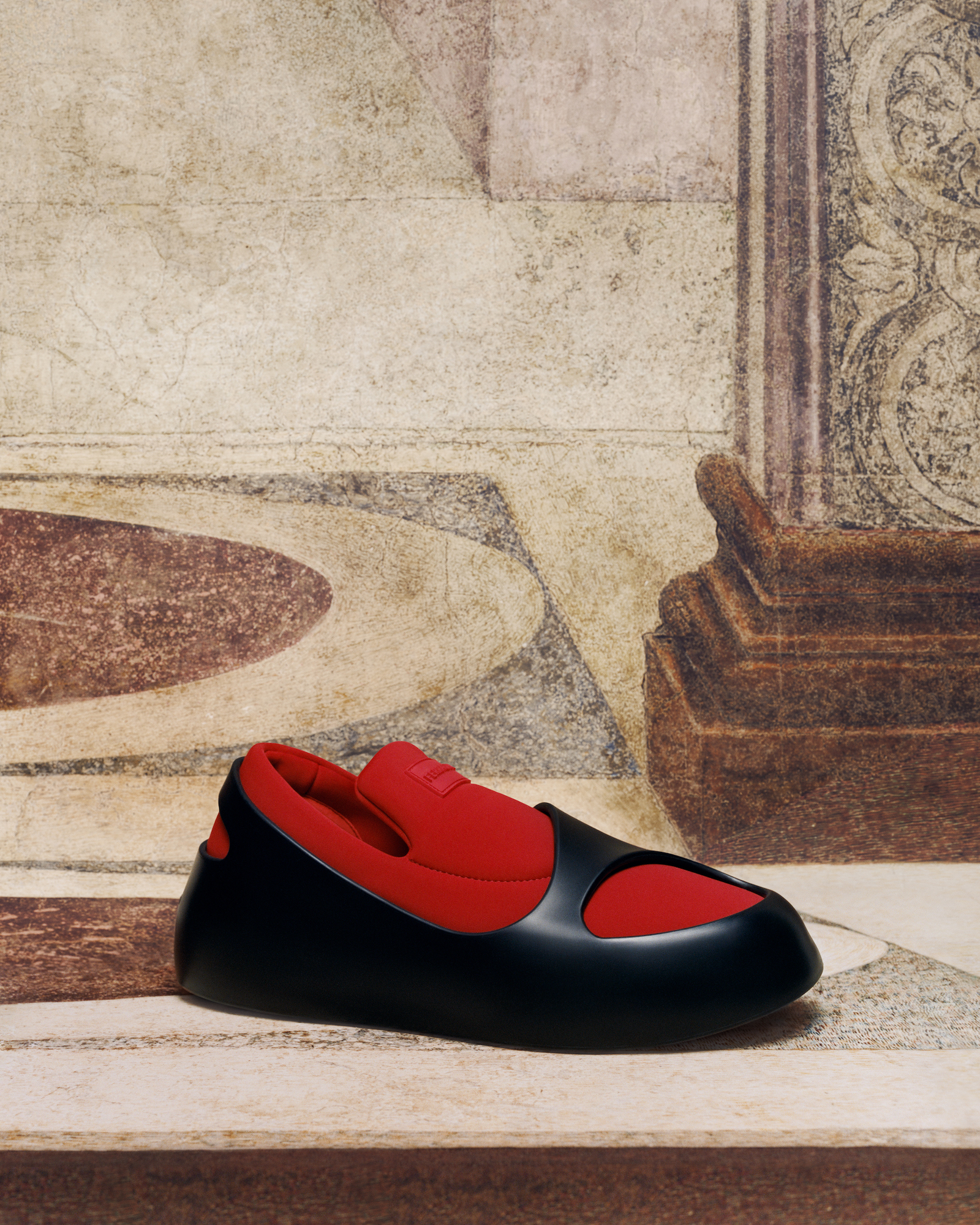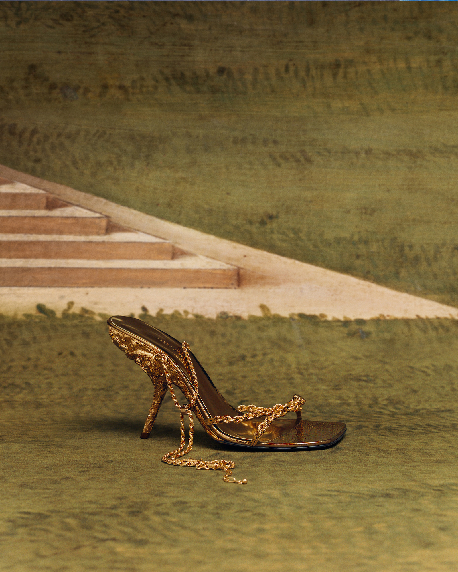 Accompanying this collection, Ferragamo presents a new batch of footwear this Fall-Winter 2023. Mirroring scenes from Baroque art, the Bejeweled Sandal is embellished with gold twists and cords across its leather lining. Adhering to the collection’s renaissance elements, the Cut-Out Details Shoe takes inspiration from the colors of an opera theater, while also maintaining purposefully fragmented details.