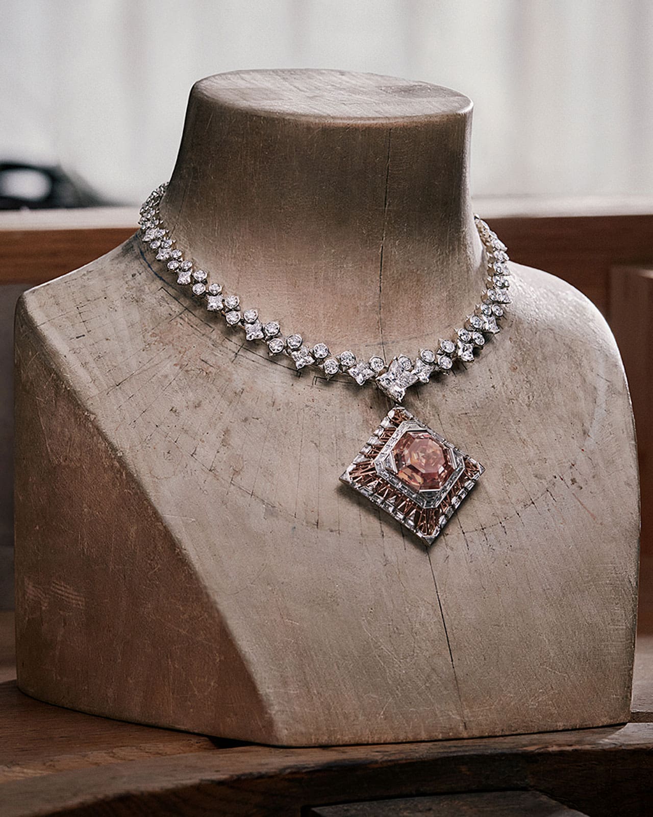 One piece stood out to Dynevor, the collection’s centerpiece named, Cœur de Paris, featuring a 56.23-carat diamond in a pink hue left her in awe. Its pink-gold structure and lattice of diamonds are reminiscent of looking up through the base of the Eiffel Tower, capturing the essence of Parisian spirit—literally and figuratively. “I’ve never really thought of jewellery as architecture, but this piece was so architecturally strong that I was so blown away by it,” she shares.
