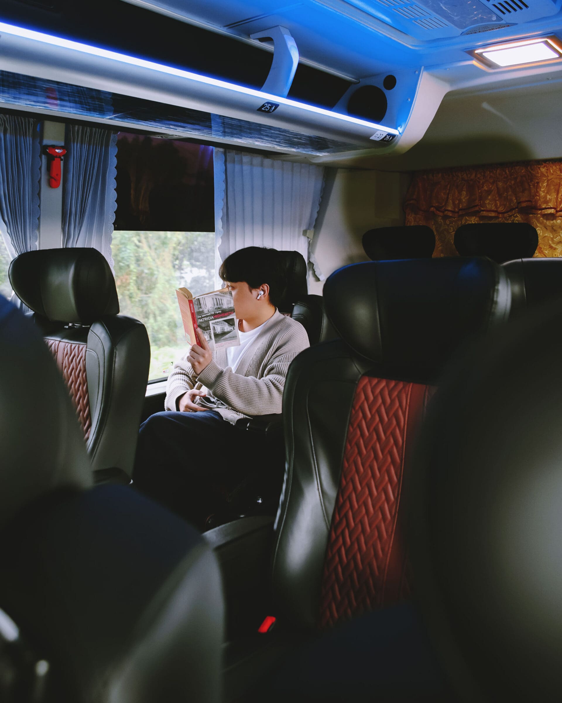 Boarding the bus, you will be greeted by a member of the cabin crew and the driver, who wore a suit, an uncommon sight for bus travel in the country. The interior features cool blue lighting and the plush leather seats in black with dark red accents are spacious and are arranged in a 2×1 configuration. Each seat was equipped with cupholders, seat pockets, USB and USB-C charging ports, a leg rest, and a dedicated aircon vent.