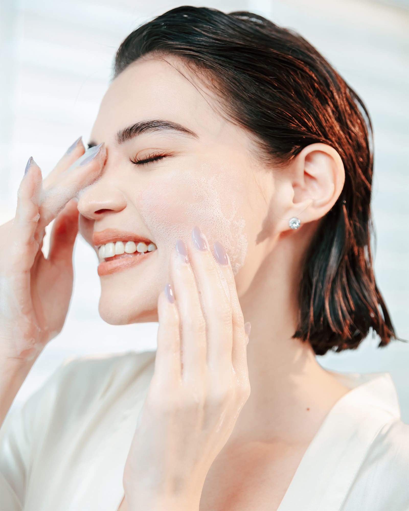 She then proceeds to add a bit of water on the sakura-infused facial foam to bring out its velvet-like texture before applying around her face and the finer areas such as her pores.