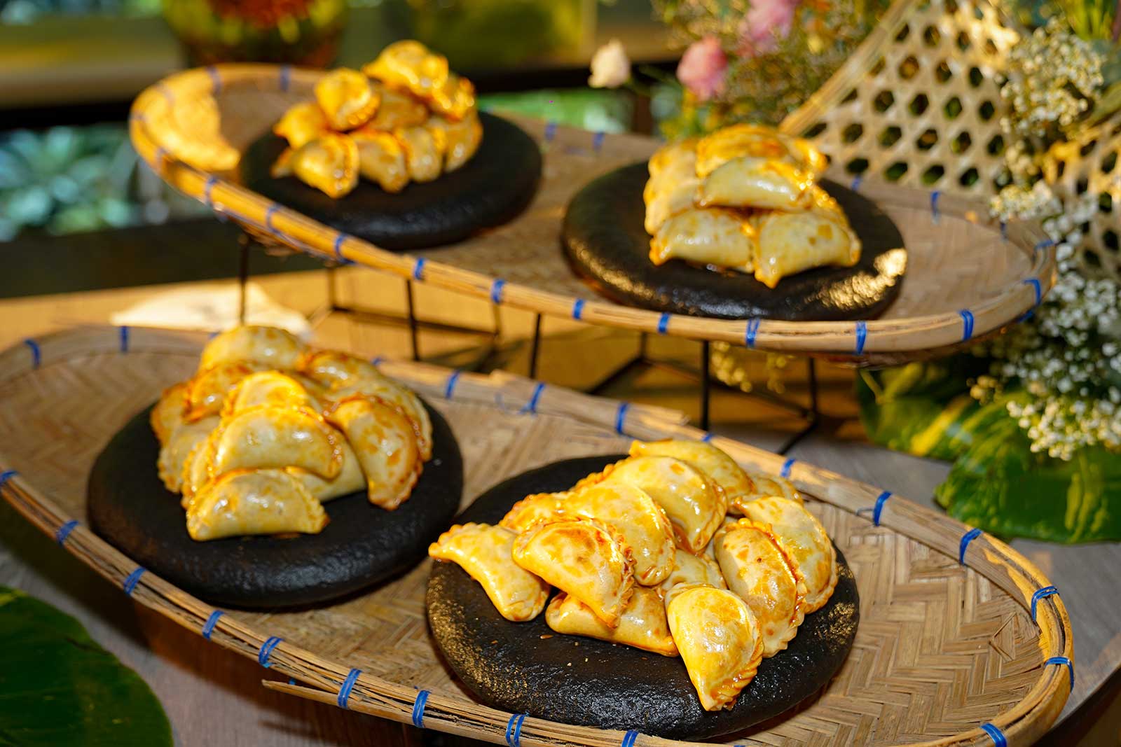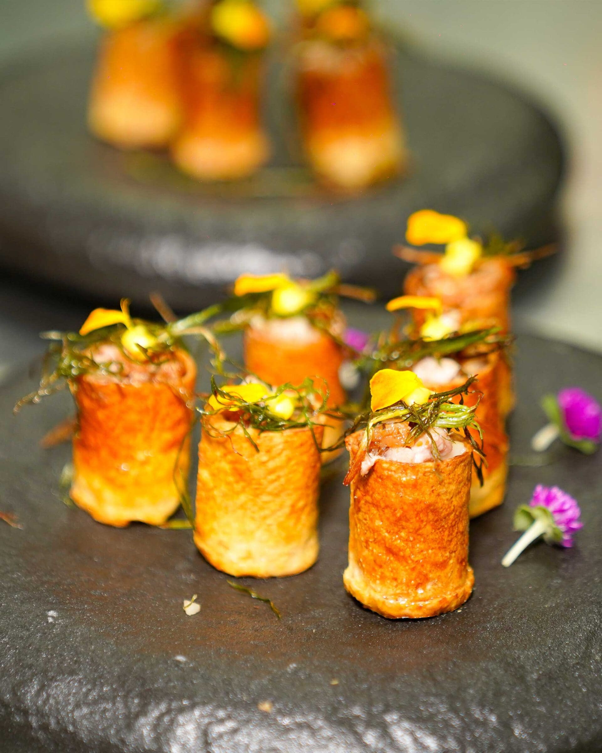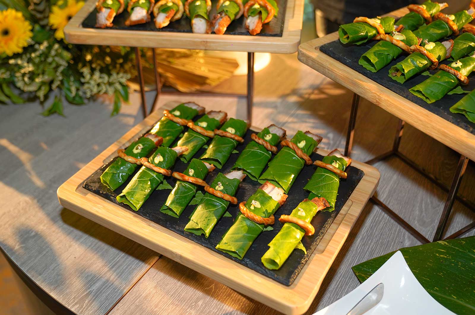 The “Wave” zone was bloomed tranquil blue with waves projected on a giant LED screen, mirroring Cebu’s coastal areas. Guests savored seafood selections presented in real sea urchin shells and other fresh ocean produce. A few steps onward, the “Peak” zone featured greenery and a “Ring-for-Champagne” wall, offering guests an interactive means to procure their drinks for the night. Highlights at this zone included the tuslob buwa and chicken proven arancini, a pandan rice dish stuffed with pig’s brain and served with crispy chicken proven. The “Peak” zone also featured a puso-weaving station, allowing guests the opportunity to learn how to weave the puso, the Cebuano practice of weaving palm leaves into heart-shaped rice containers.