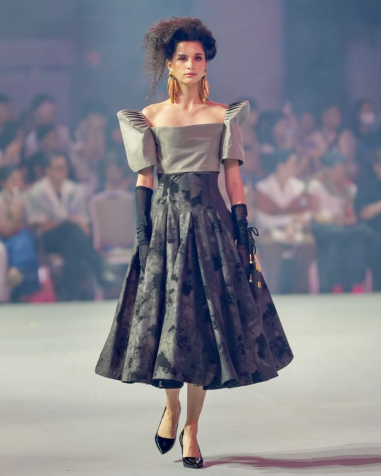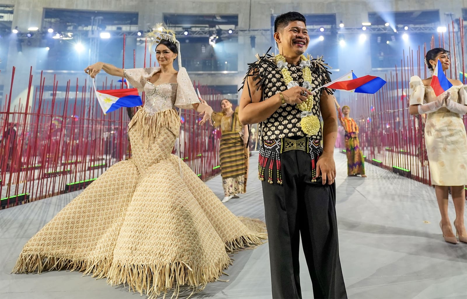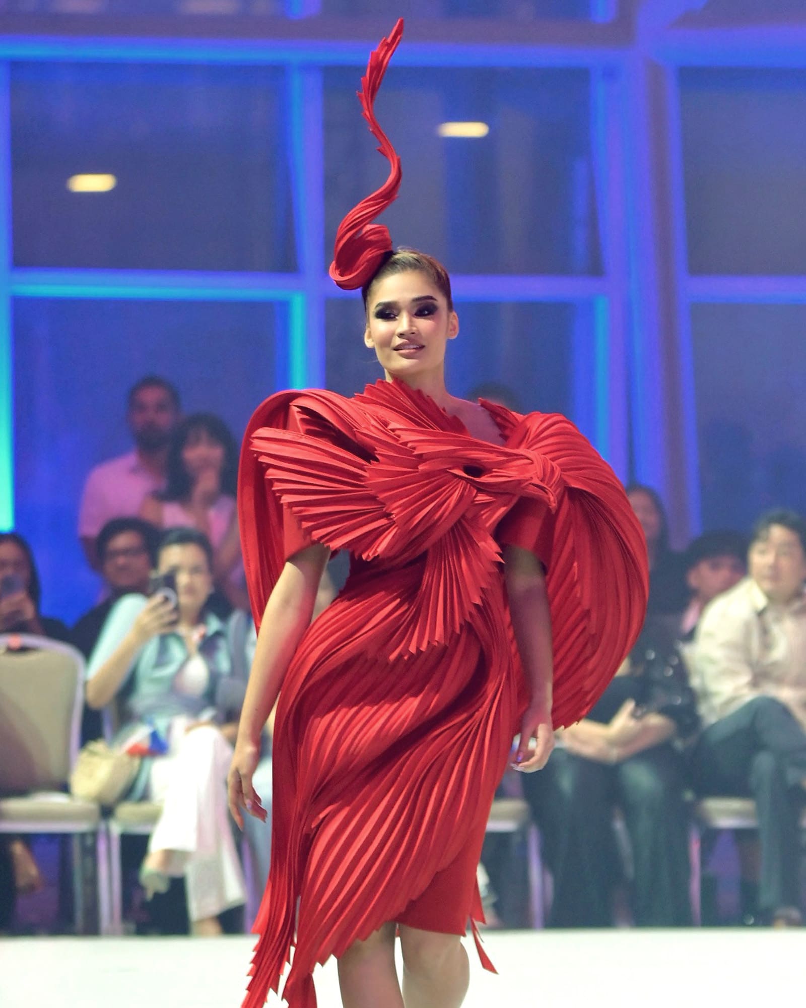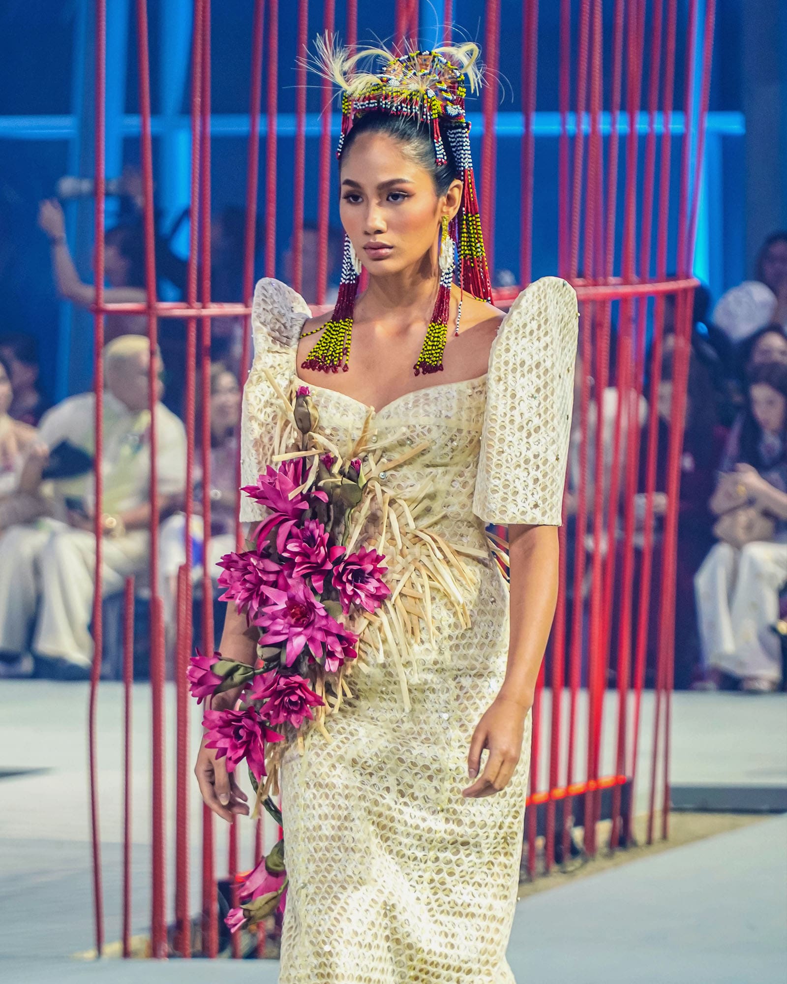 The second set of looks focused more on highlighting different national symbols, including sampaguitas, jeepneys, Philippine eagles, carabaos, and mangoes respectively. Fittingly named the Ikonograpiya collection, the series was designed by Cary Santiago, who sought to showcase the country’s rich cultural heritage through the medium of clothing. Santiago opened with a silhouette dedicated toward national hero José Rizal, and his writings Noli Me Tángere and El Fiibusterismo sprawled on a crimson crepe dress as a canvas. The collection concluded with an ensemble set to the tune of the Lupang Hinirang, where Michelle Dee wore an asymmetric gazar skirt with a color palette reminiscent of the Philippine flag.