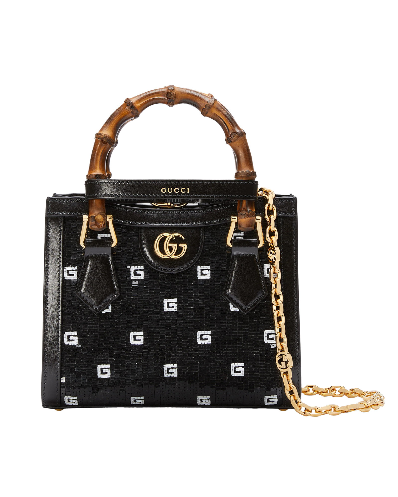 In 1991, the House introduced a bamboo-handled tote with the Gucci Diana. Throughout the many decades since its debut, the Gucci Diana has gone through a number of different iterations that continue to add elements to its silhouette. For the current campaign, the bag is newly fashioned from rich black leather and a sleek, sequin material, and is decorated in an all-over print of Gucci’s modernized “G” emblem. The Diana is also enhanced by the addition of two contrasting belt-like elements – a playful nod to the straps traditionally used to maintain the form of its bamboo handles.