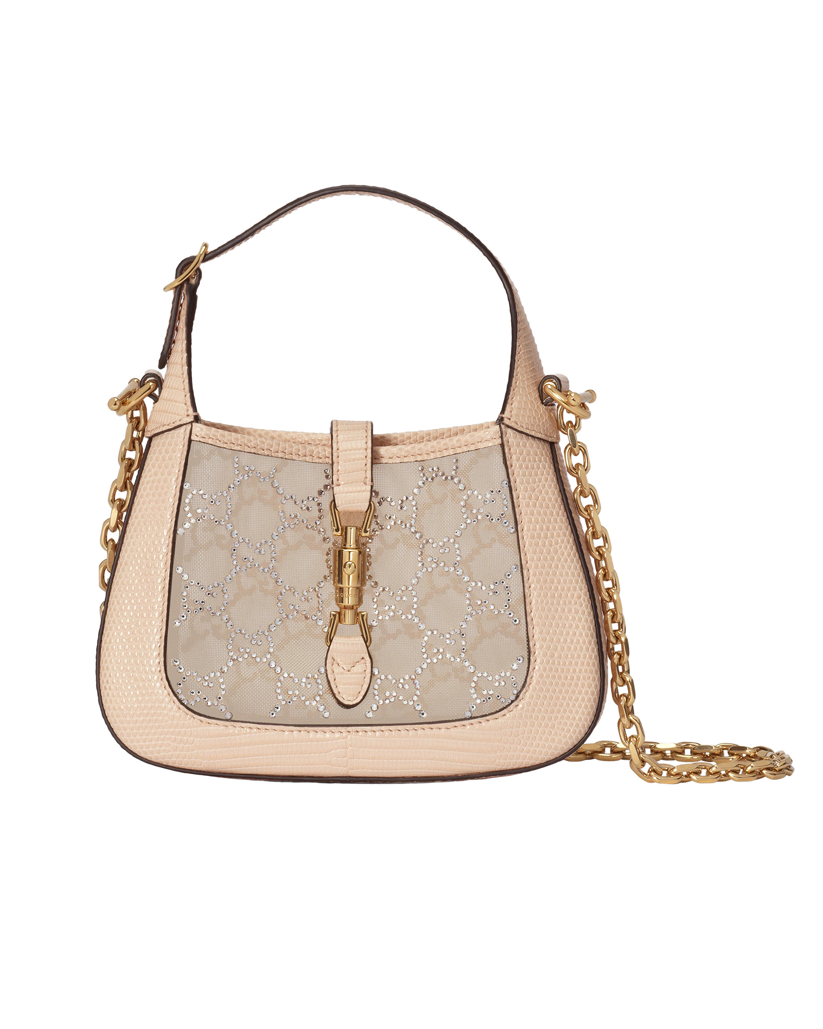 Marking the return of the Jackie 1961 bag, the Gucci Gift collection shines a light on one of the House’s first handbag lines. This new iteration is embellished in a beige lamé lizard leather, and lined with a canvas that has the interlocking “GG” logo. Accompanying the canvas lining, the bag is infused with a touch of crystals that overlap across its body, giving it a multilayered effect across its surface.