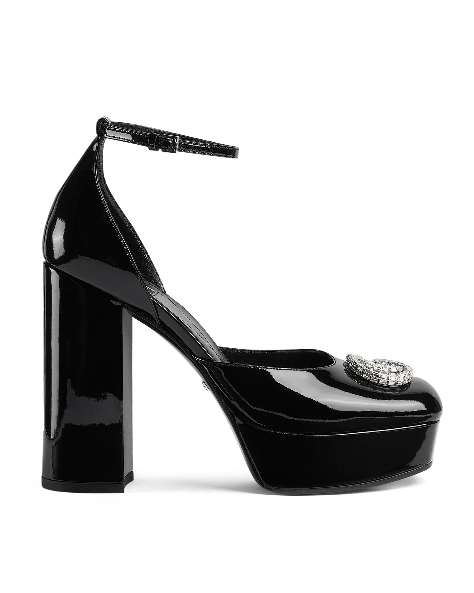 A statement in itself, the Gucci Platform Pump attracts the most attention among the House’s extensive collection of feminine footwear. At its front, the piece of footwear is adorned with Gucci’s Double G emblem interlaced with a series of white crystals. Each pair is enveloped in a base of patent leather in a glossy sheen, and a completely leather sole. Among its eye-catching elements, the highlight of the platforms are its 4.5” heels that allow its wearer to stand out, regardless of event or occasion.