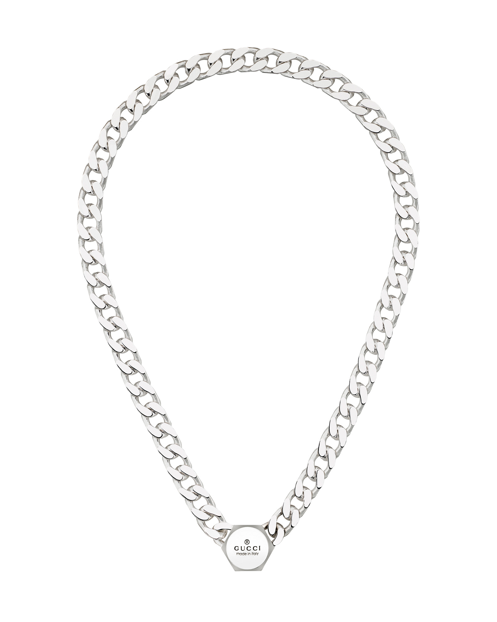 The Gucci Trademark Necklace is meticulously crafted from 925 sterling silver. Fully made in Italy, the necklace features Gucci’s trademark embossing as its most defining feature. With its intricate design, the piece also includes a clasp closure and an adjustable length, allowing for a more customized fit.