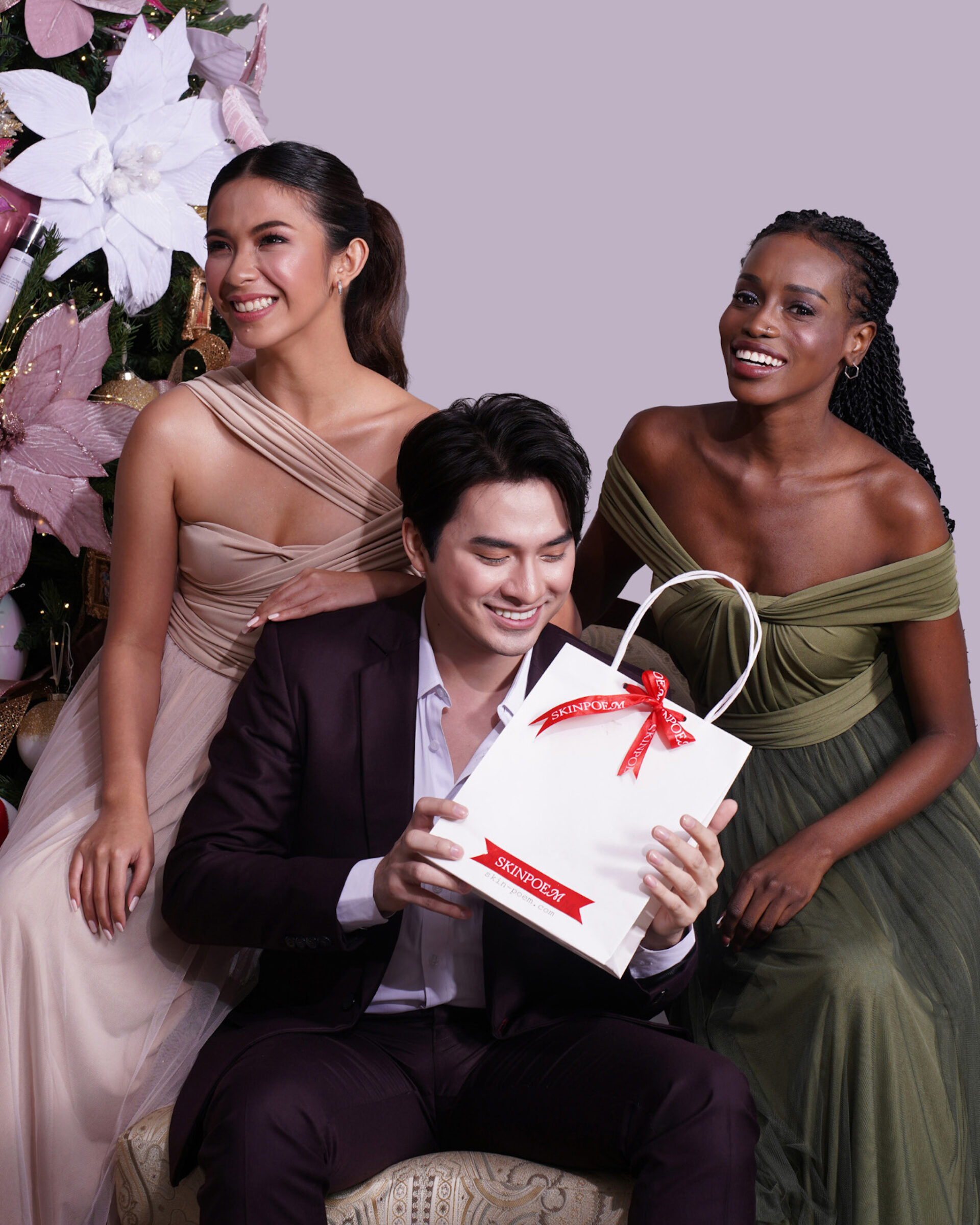 Bianca Acob, Allen Cecillio, and Manasik Yousif for SKINPOEM’s “Once Upon a Christmas” Campaign. Photo courtesy of SKINPOEM