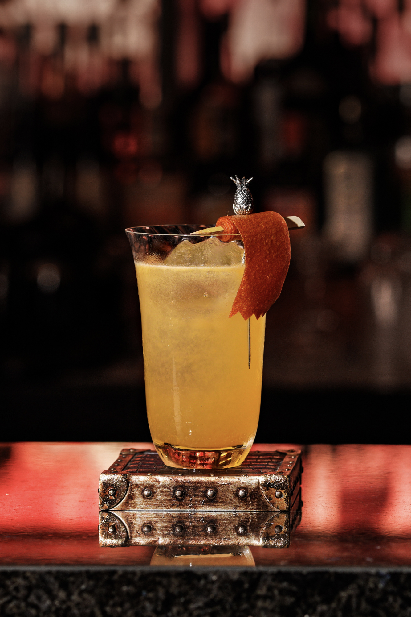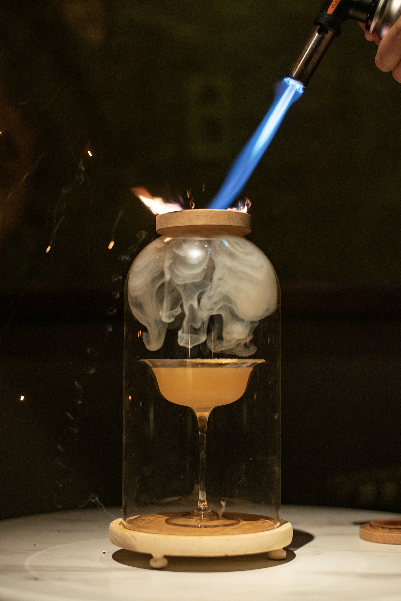 The making of The Fiery Dragon is a spectacle in itself. It includes a performance from the way it’s mixed and how it’s presented. With the cocktail placed inside a dome cloche, Silva performs a mini fire show by lighting the fire water tincture filling the inside of the glass with smoke. The drink opens with a woody flavor from the Mezcal Durango and bell pepper cordial and then moves on to citrus flavors of grapefruit and lime. The finish is spicy and smoky with just enough warmth enveloping your mouth.