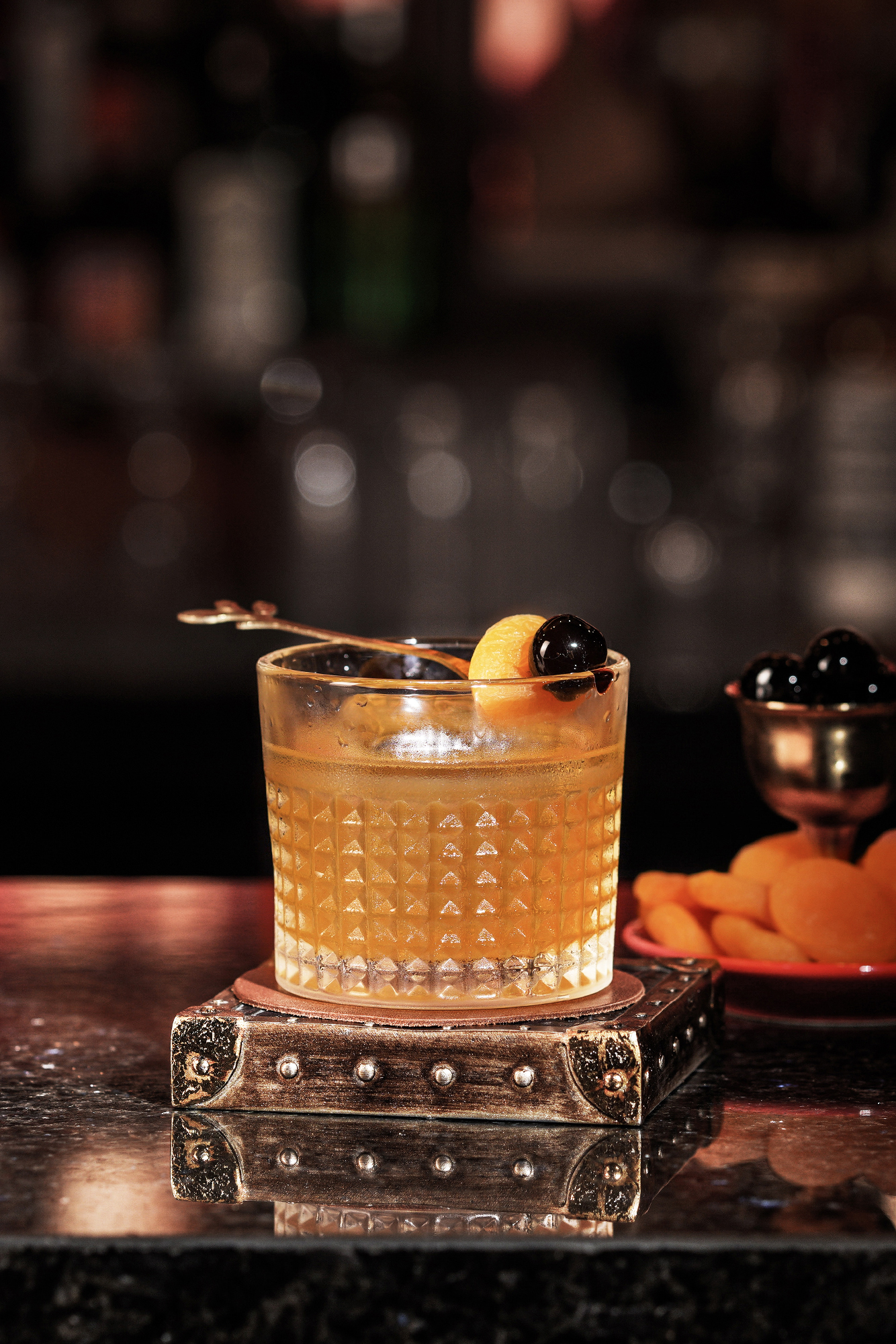 Among the crowd favorites from their roster of aperitifs include The Rising Sun, a gin-based drink fused with umeshu, apricots, and bitters topped with a sheet of seaweed. As the first drink on their menu, the concoction is a nod to the Japanese Occupation in the Philippines and a symbol of where the story of the bar is set. The apricots complement the juniper-heavy gin base while the umeshu, a Japanese liquor made from plums, adds a bit of sweetness that is balanced out by the bitter herbs and annatto oil.