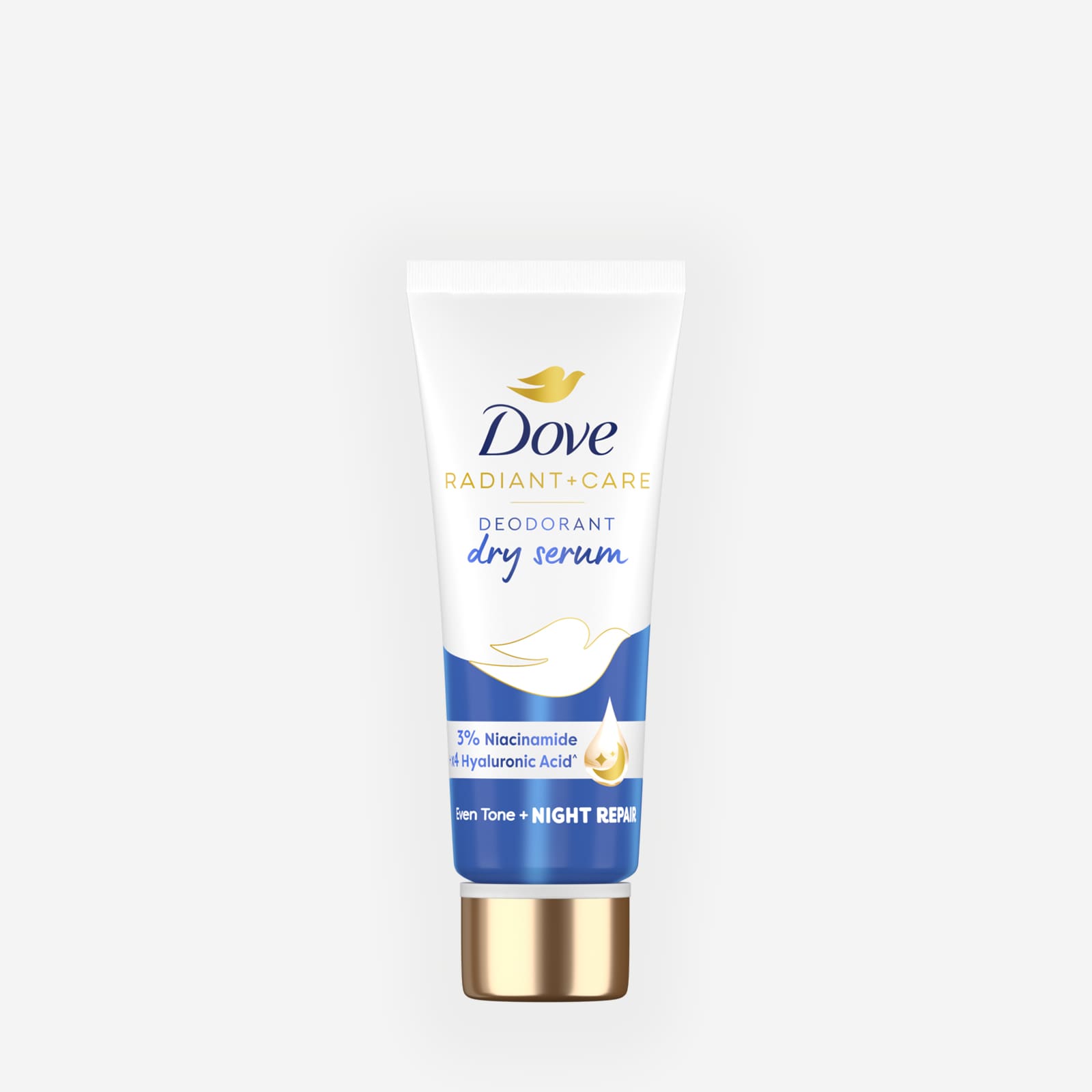 Complete your night routine with Dove’s Night Repair Deo Serum, which combines Niacinamide and Hyaluronic Acid to moisturize and repair your underarms. The deo serum also hydrates and brightens underarm skin overnight.