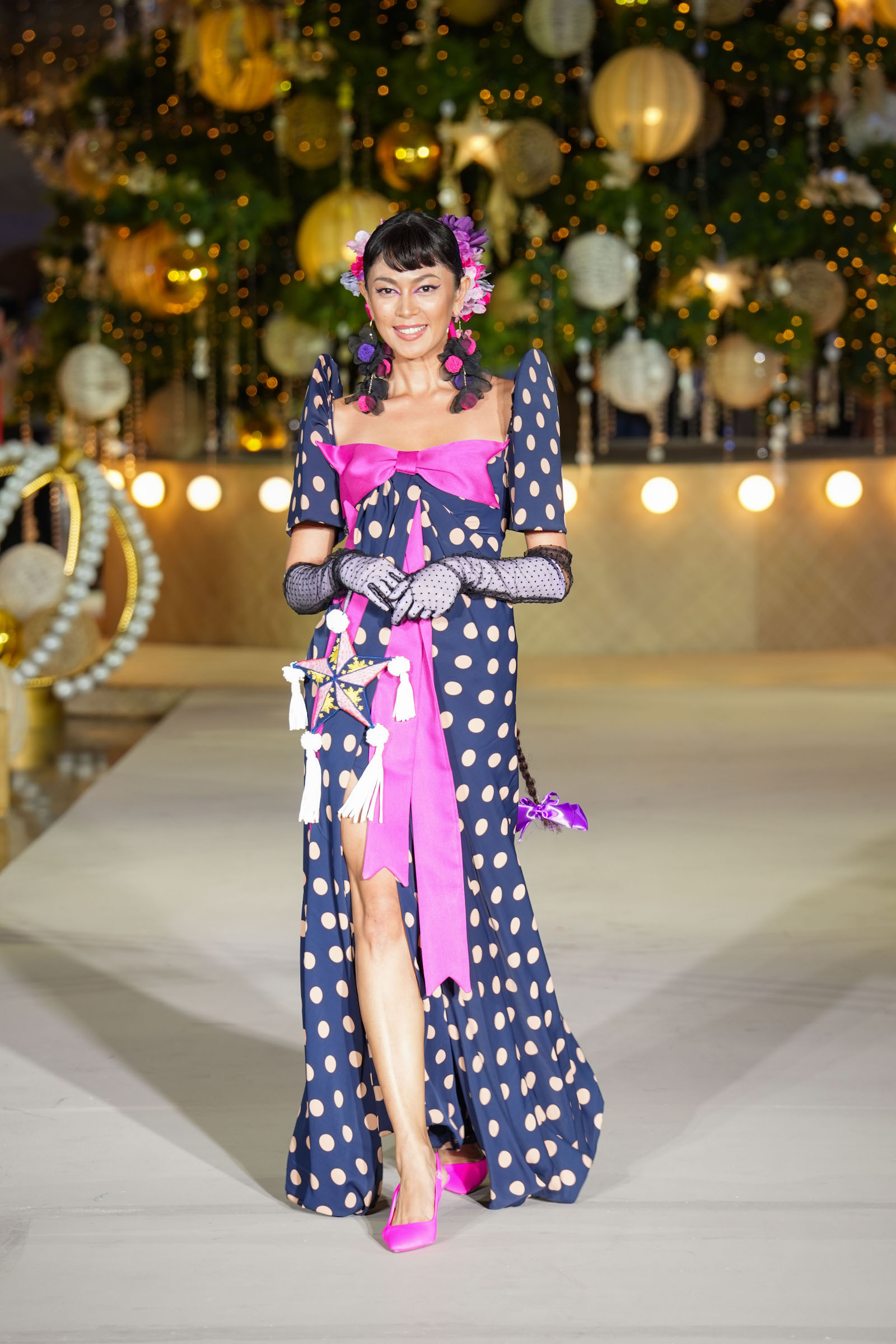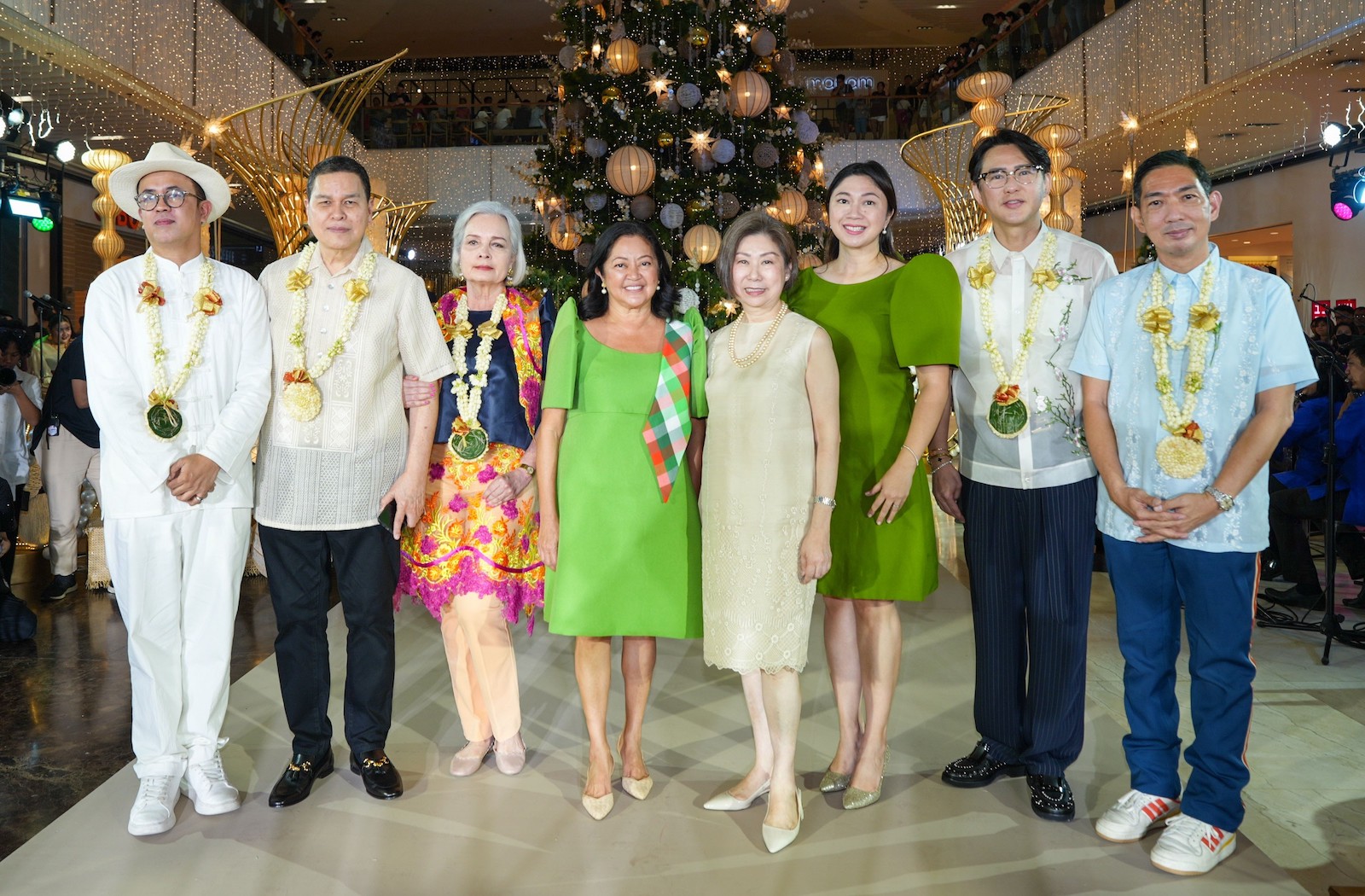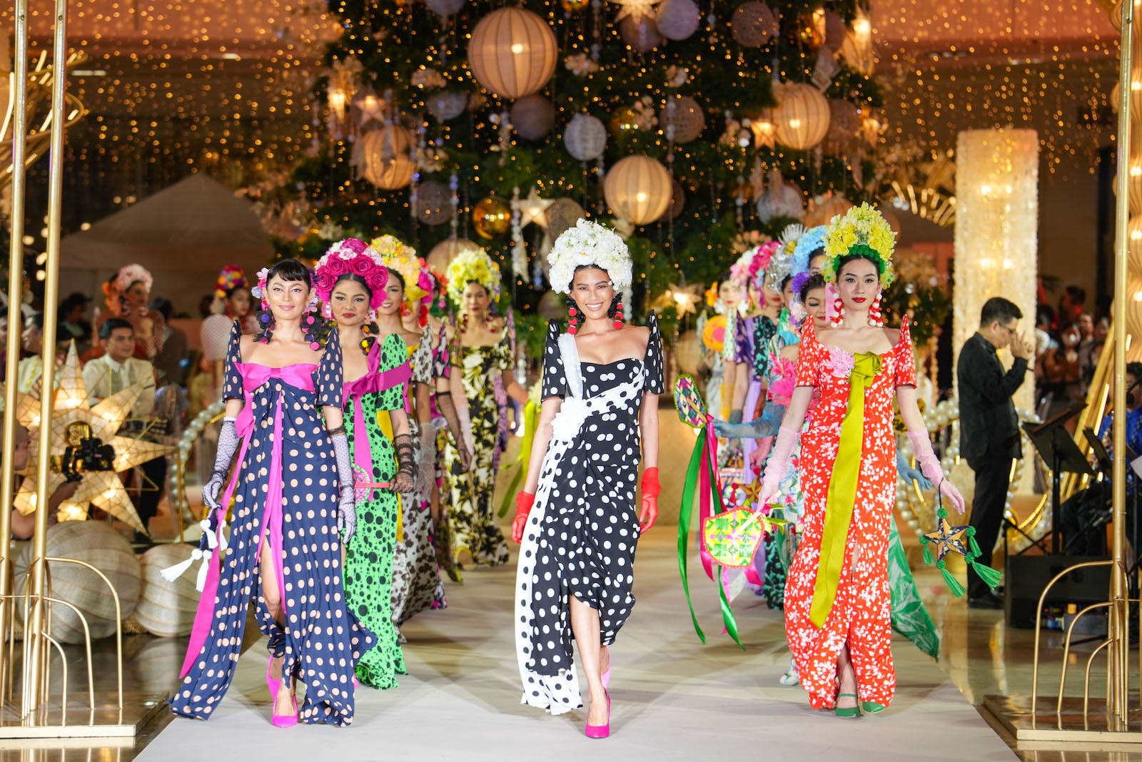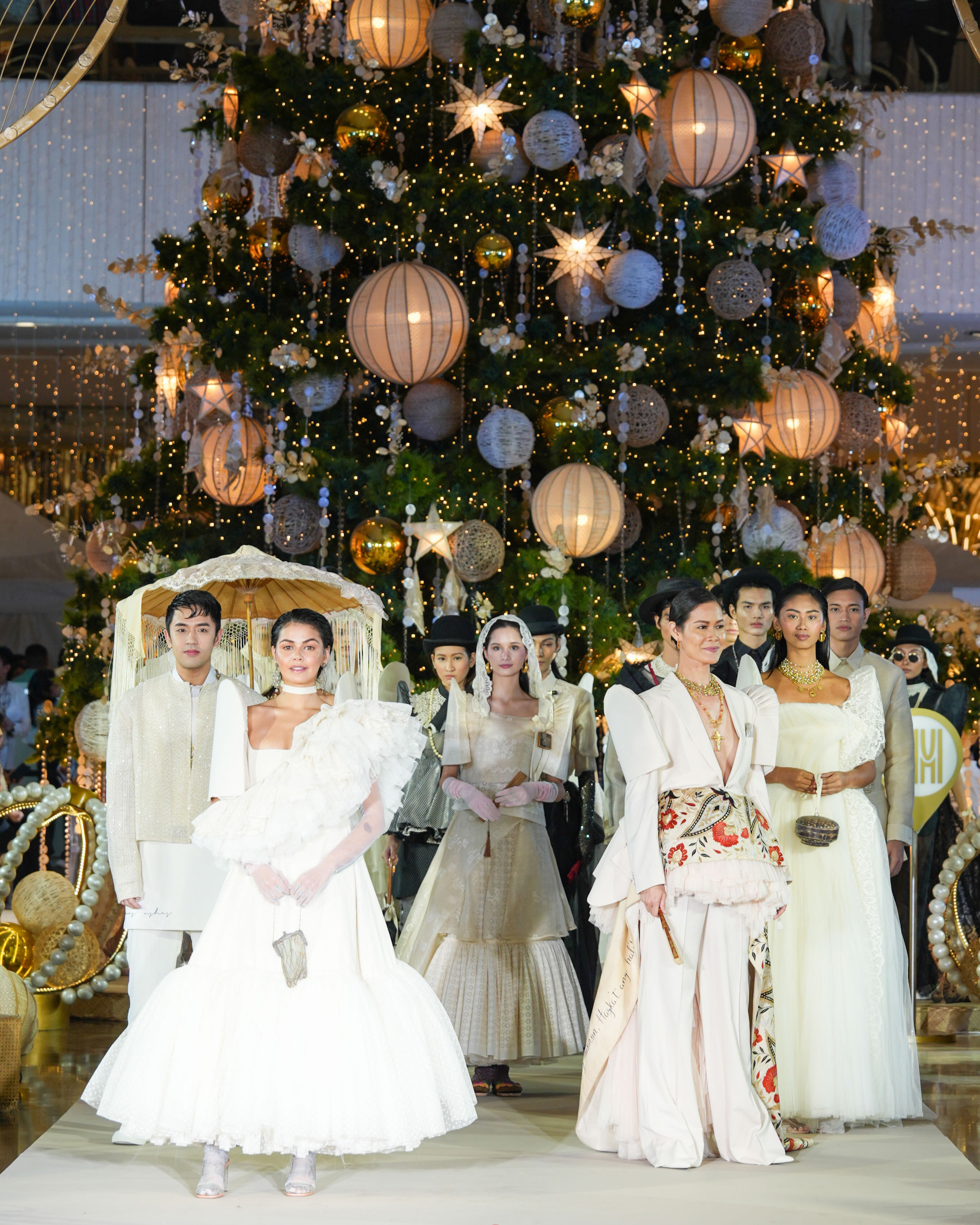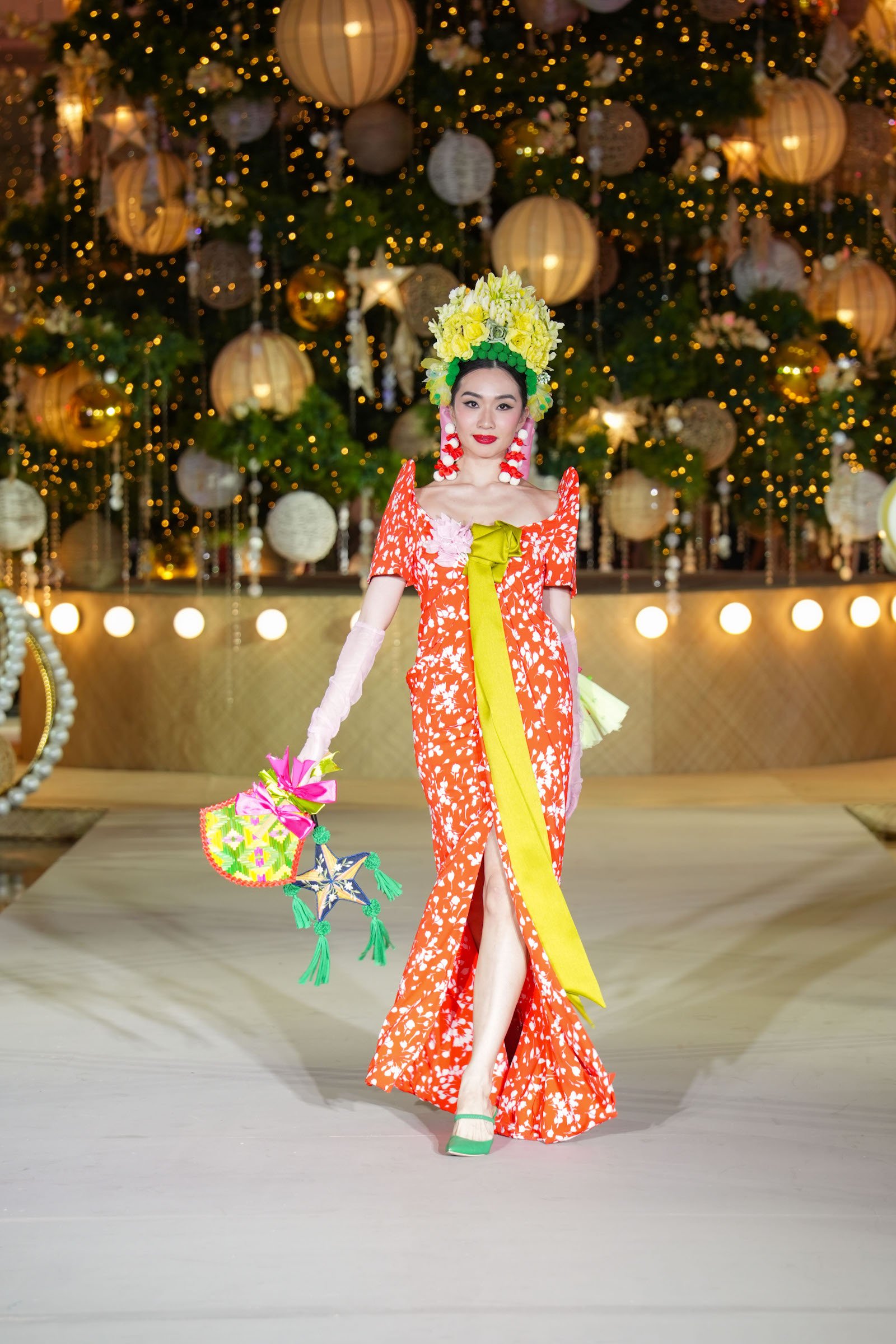 Held in SM Aura, the space of the mall was transformed into a runway, with a red carpet that led toward a 33-foot Christmas tree that illuminated the main hall. The sounds of violins, brass, and strings resonated throughout the foyer, with guests walking the red carpet to the sound of an orchestra in the background. At the height of the event, models walked the runway to showcase fashion designers Joey Samson and Lesley Mobo’s contemporary reimagining of the classic terno.
