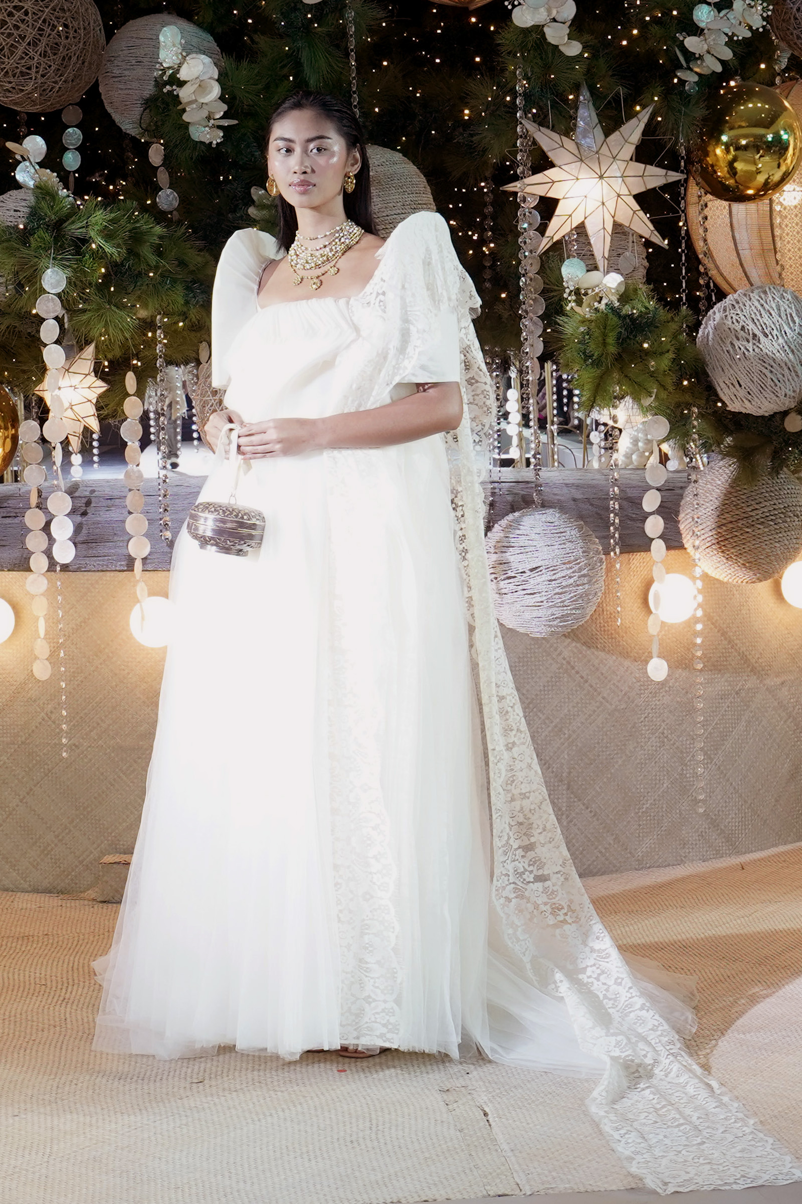 For Samson’s third collection with TernoCon, he had sought to infuse his minimalistic approach to tailoring in combination with the dramatization of the terno’s detailing. The collection took inspiration from Jose Rizal’s work and writings, featuring a variety of Barong Tagalog and terno dresses in structured, almost-architectural forms. Each meticulously thought-of detail added to the depth of Samson’s various looks— with flattened accordion pleats that resembled the pages of books, intricately laced embroidery, and piña fabric paired with kimono and obi sashes.