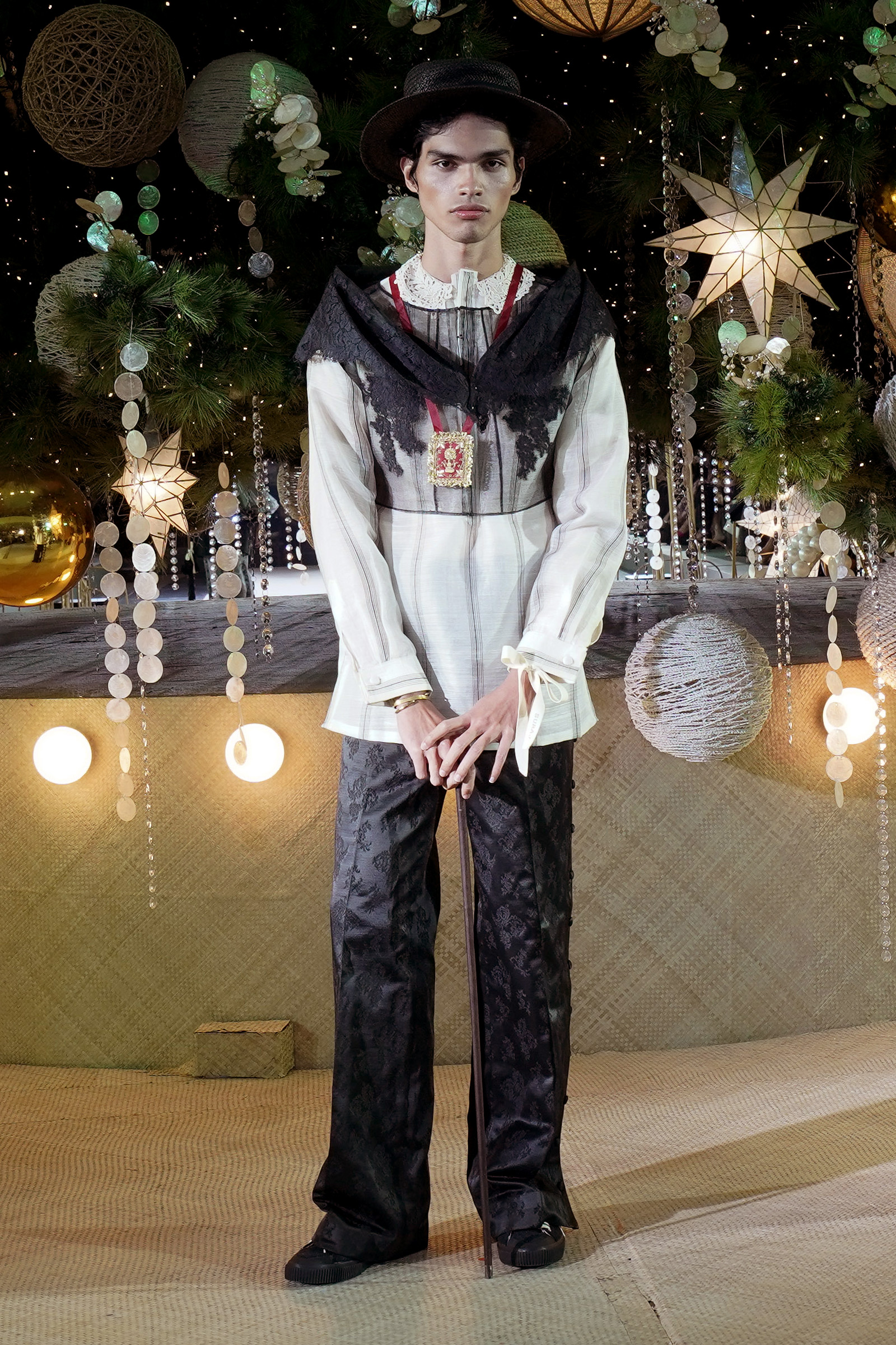 Mobo’s design language contrasts against the stringent black and white garments seen throughout Samson’s work. The designer has always had a penchant toward maximalist visuals, with “tropical terno” being a recurring motif. This has led toward a collection of pieces that are inspired by the more Latin-influenced side of our Spanish history. Clad in dresses that playfully drape against each model, the looseness of the clothing captures a vibrant tone that is highlighted by loud polka dots and florals. In commemorating the terno and its history with pageantry, Mobo had adorned each dress with sashes and headdresses crowned in a bouquet of flowers, completing each look.