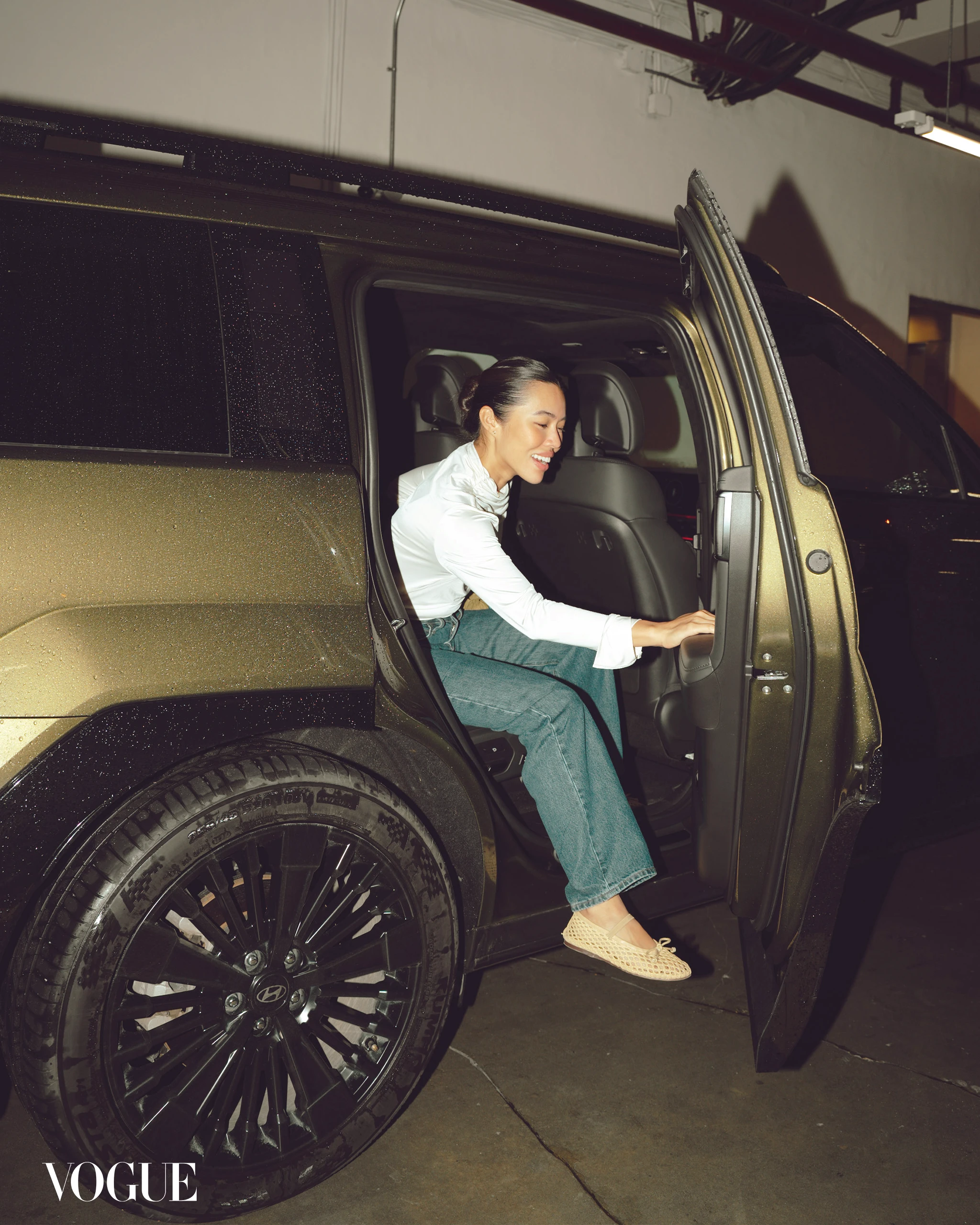 As she recalls how the Hyundai SANTA FE Hybrid’s adjustable captain’s seats and integrated fast-charging features allowed her to have a moment of rest while on her way to Vogue Threads, Salazar elaborates on how giving herself time to repose creates a space for a moment of self-care. “The first thing that I do when I get in a car is put my phone away because whenever I’m in an enclosed space, I take that as a moment for me,” she says.