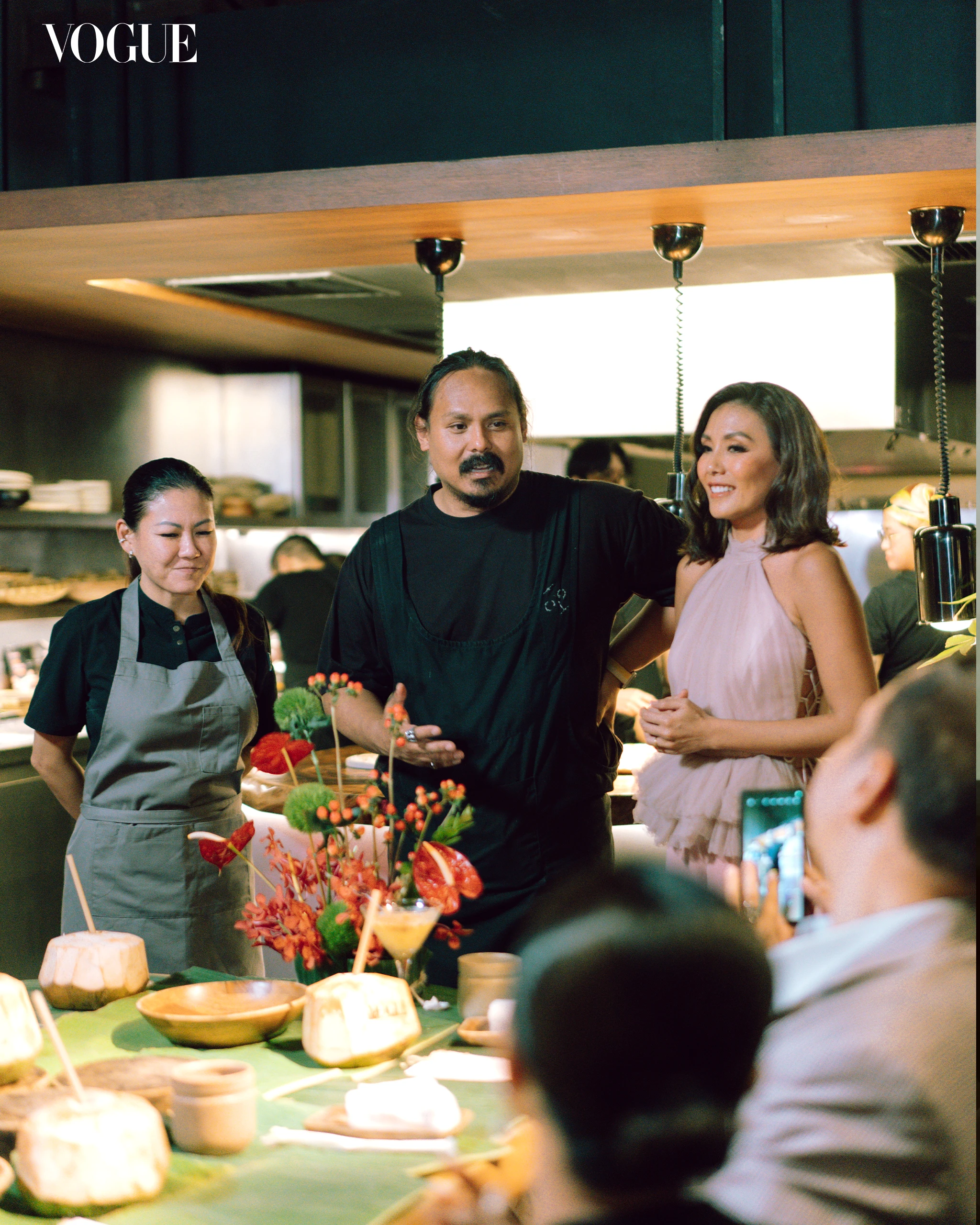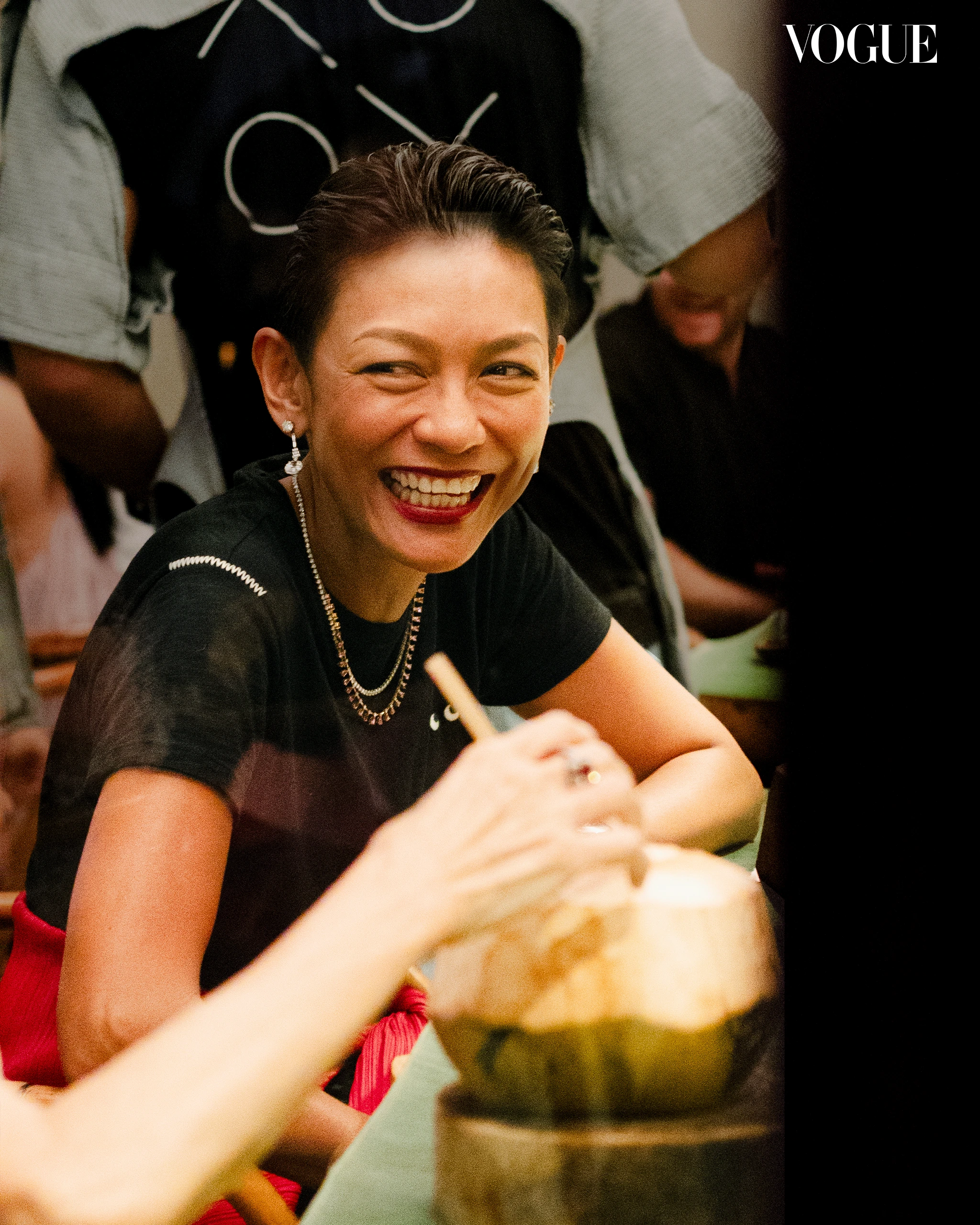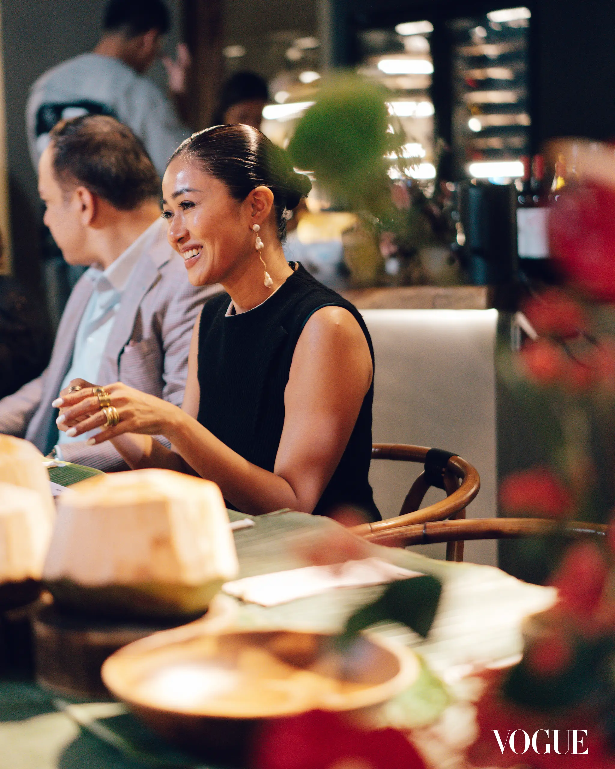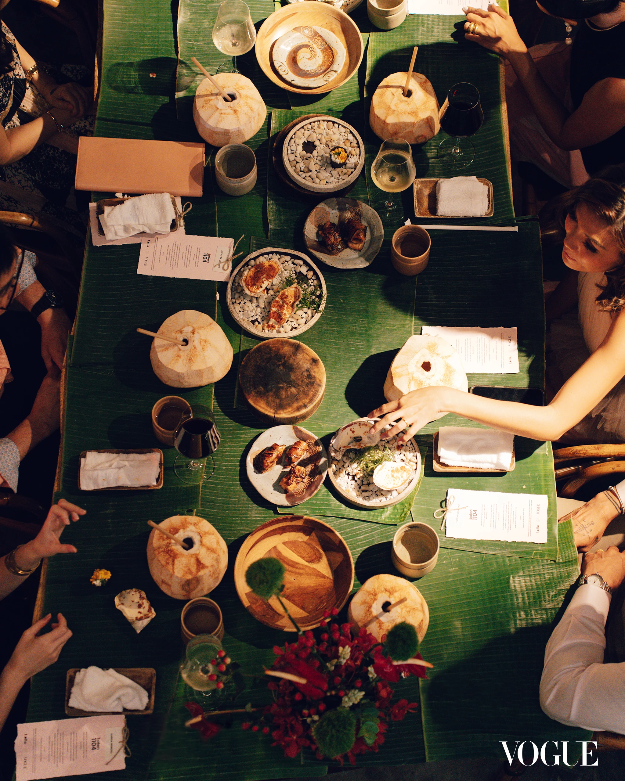 Vogue Philippines deputy editors Trickie Lopa and Pam Quiñones and beauty editor Joyce Oreña sat shoulder to shoulder with Anna and Jayjay de Ocampo, Bianca Macasaet, Jo Sebastian, Laureen Uy, Miggy Cruz, Alexis Offe, and Jam Melchor at tables lined with banana leaves, binakol cocktail in buko shells, wooden boards, and anthurium foliage.