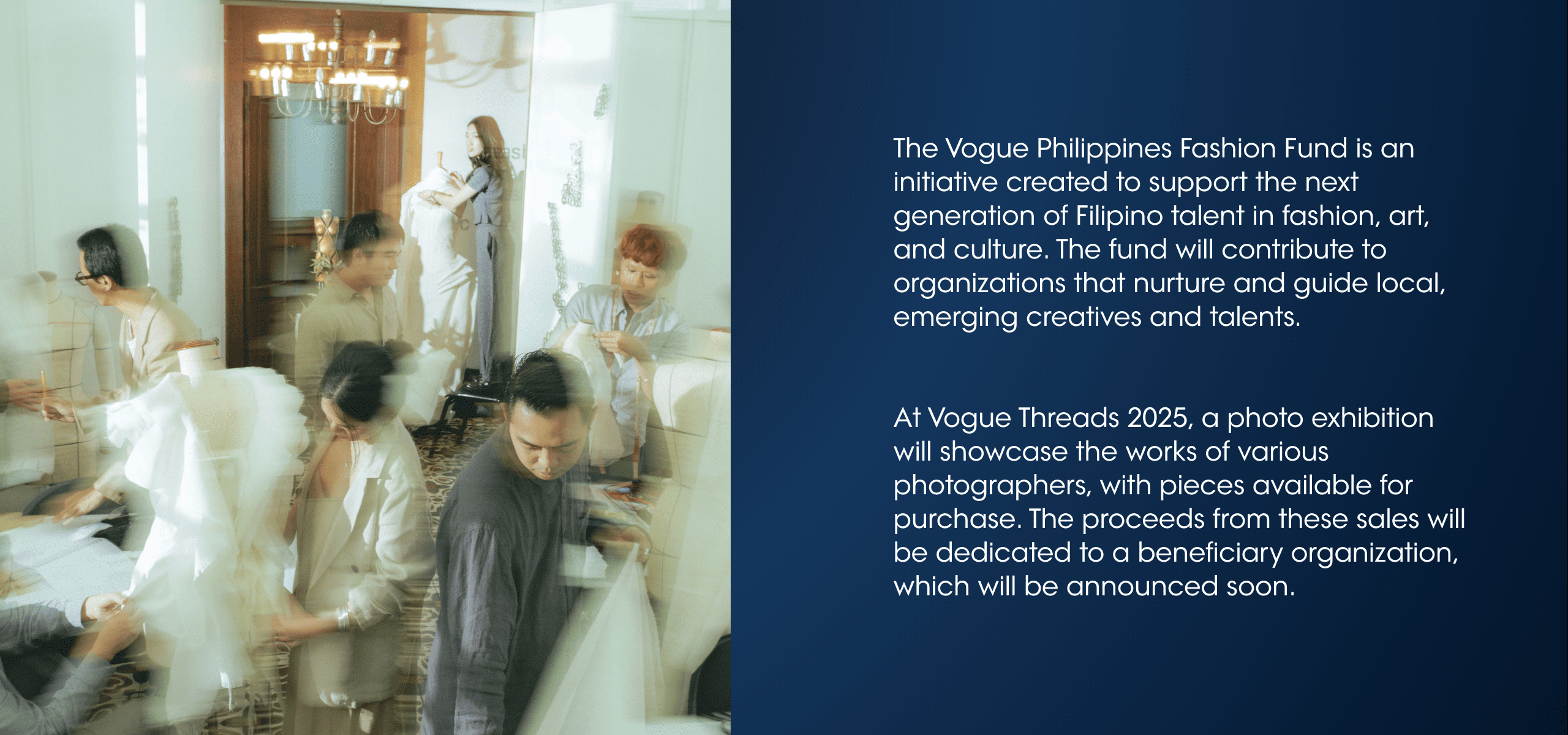 Vogue Threads is an experience that weaves Philippine culture, creativity, and community into the world. Vogue Threads 2025 is a seven-day exhibition, featuring over 50 photographs, dedicated to celebrating the power of visual storytelling. We aim to showcase our culture and talent, spark meaningful conversations, discover new talent, and create opportunities for emerging Filipino creatives.